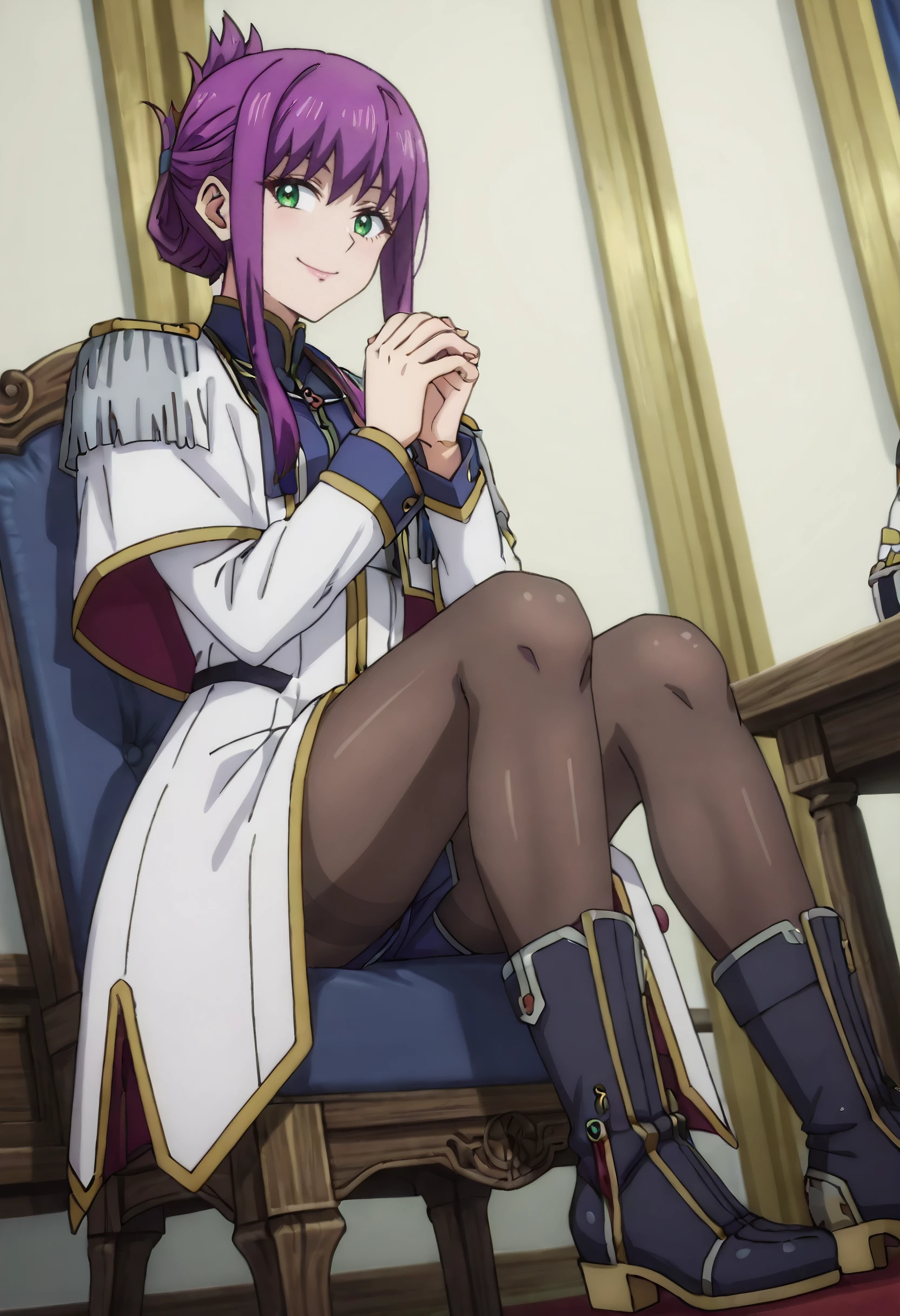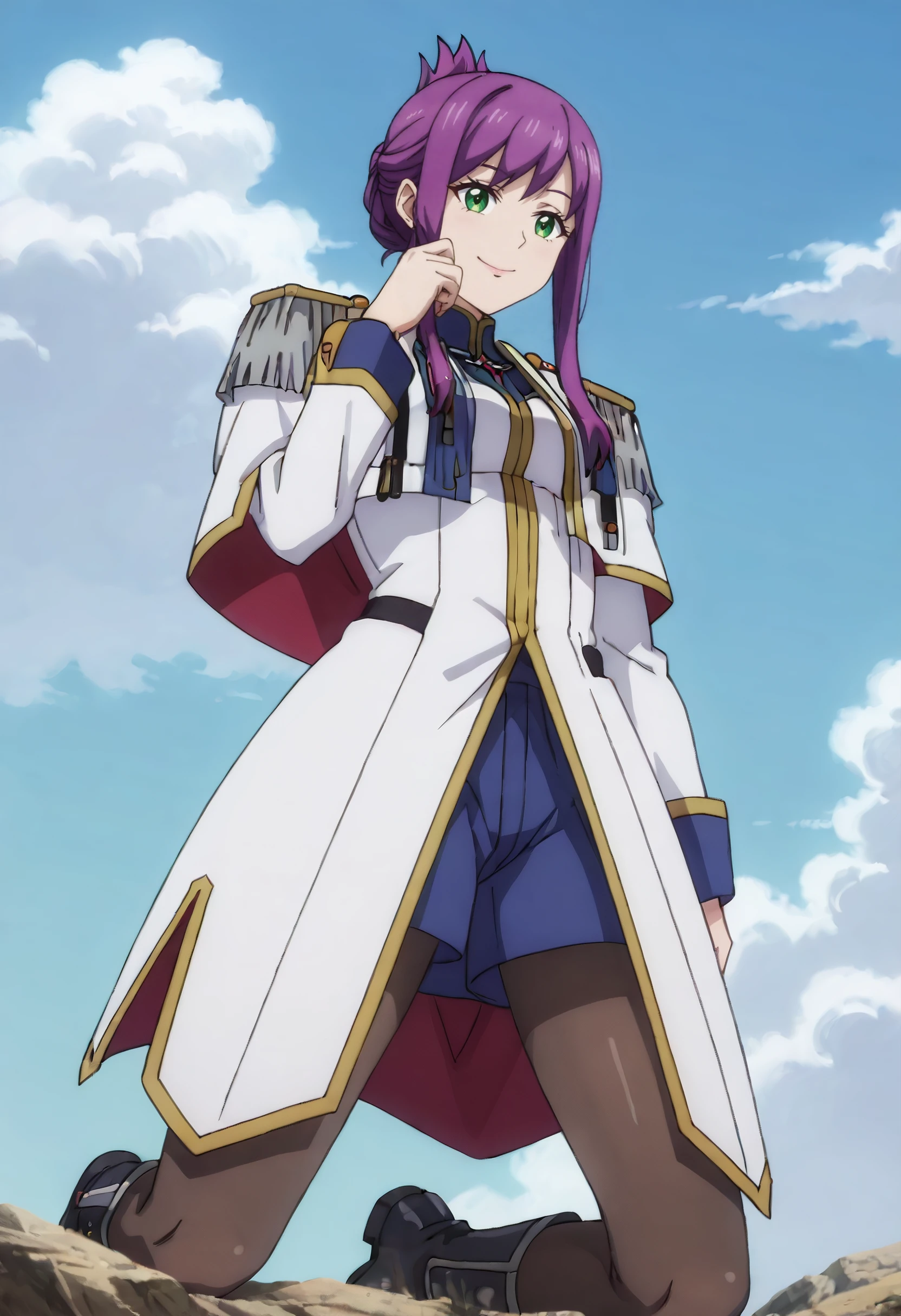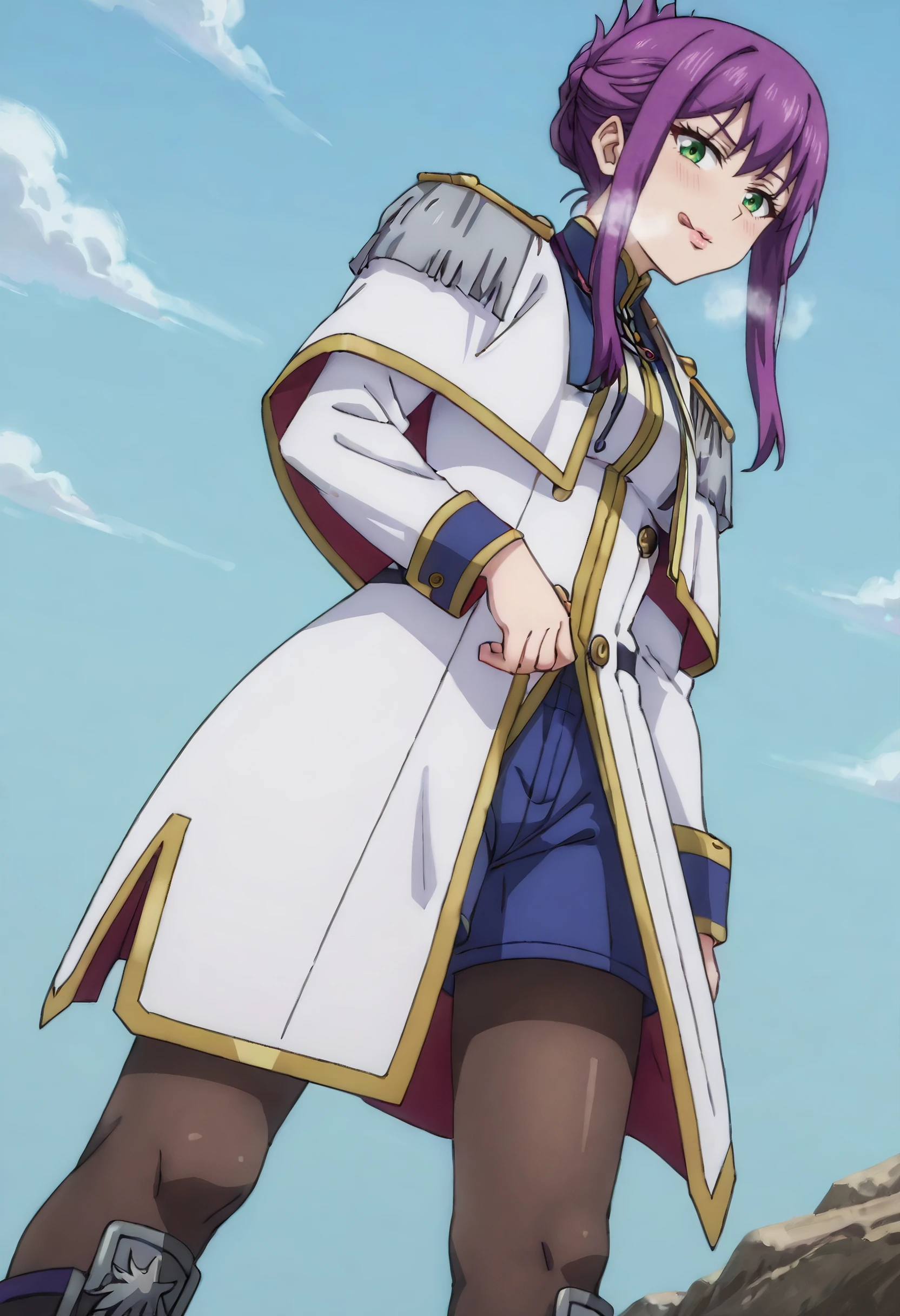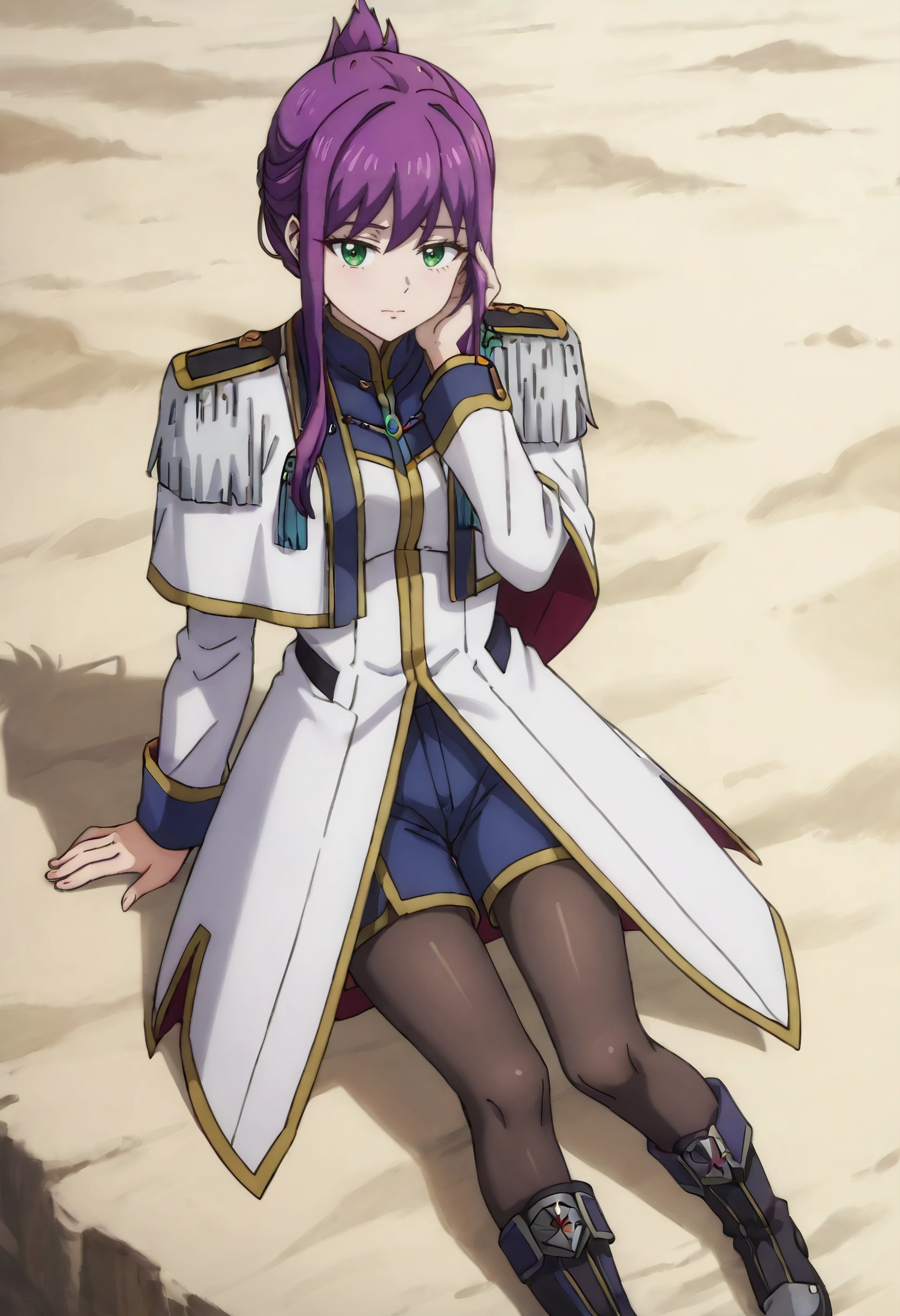 FloreOutfit, epaulettes, military uniform, military, long sleeves, pantyhose, white coat, coat, white jacket, uniform, boots, black pantyhose, jacket, skirt, asymmetrical hair, zeon, black footwear, shorts, blue shorts,
