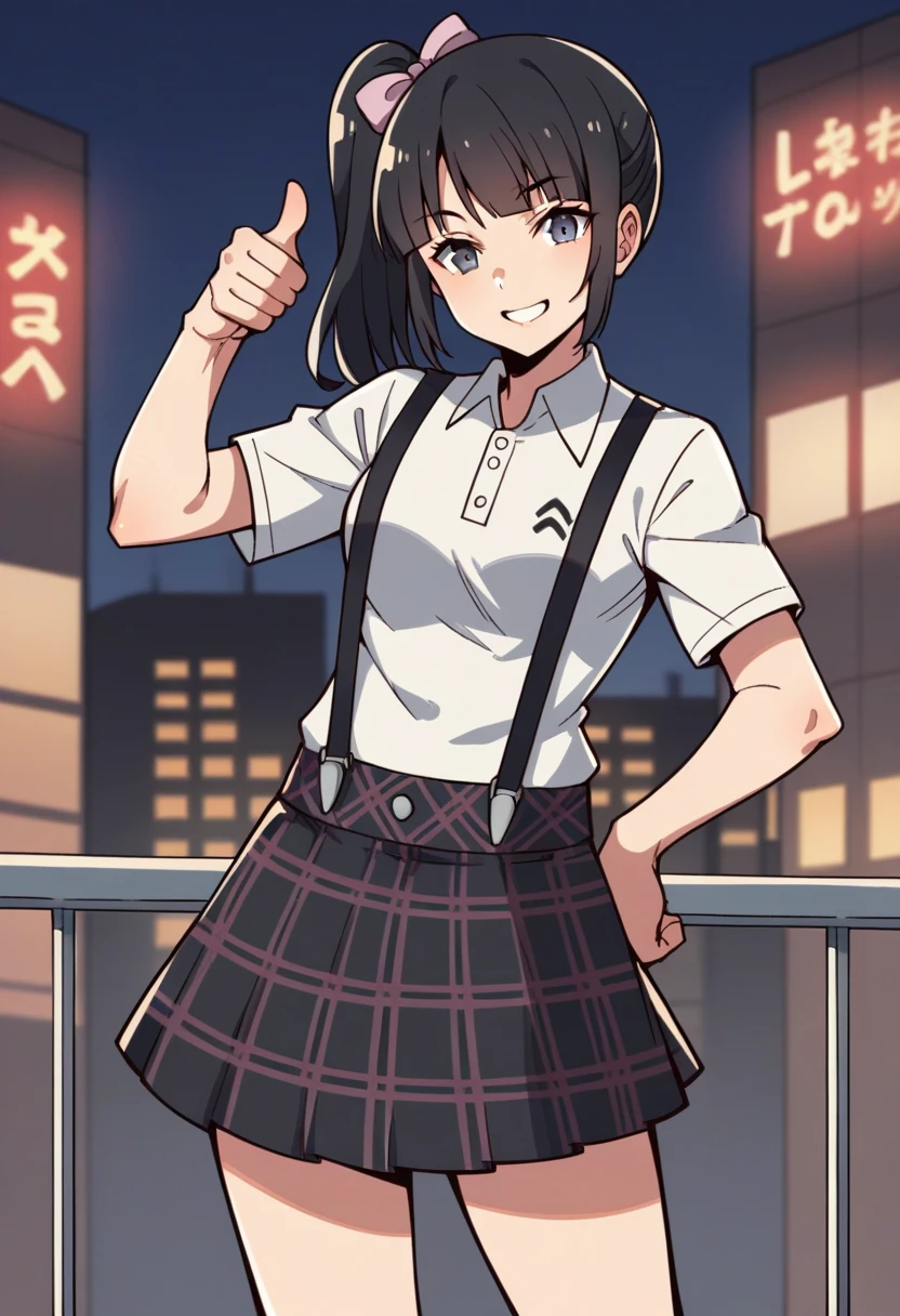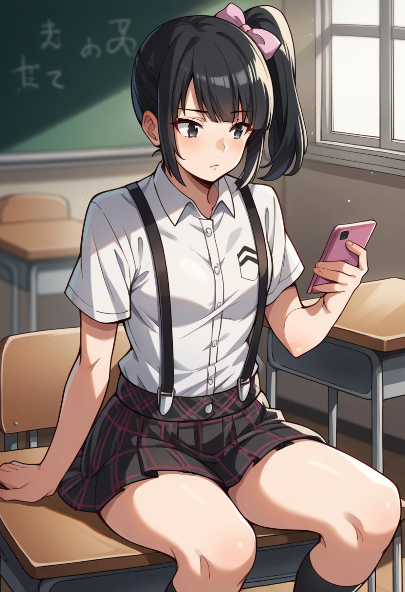 eikop5, black hair, side ponytail, ribbon, shirt, suspenders, checkered skirt, knee socks