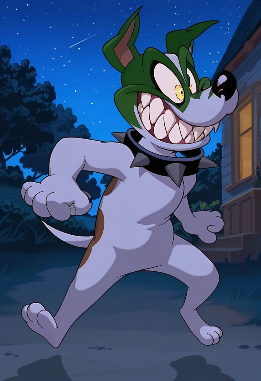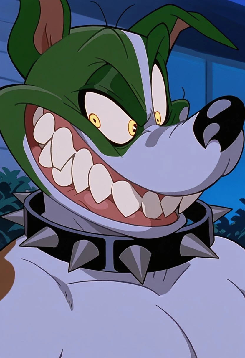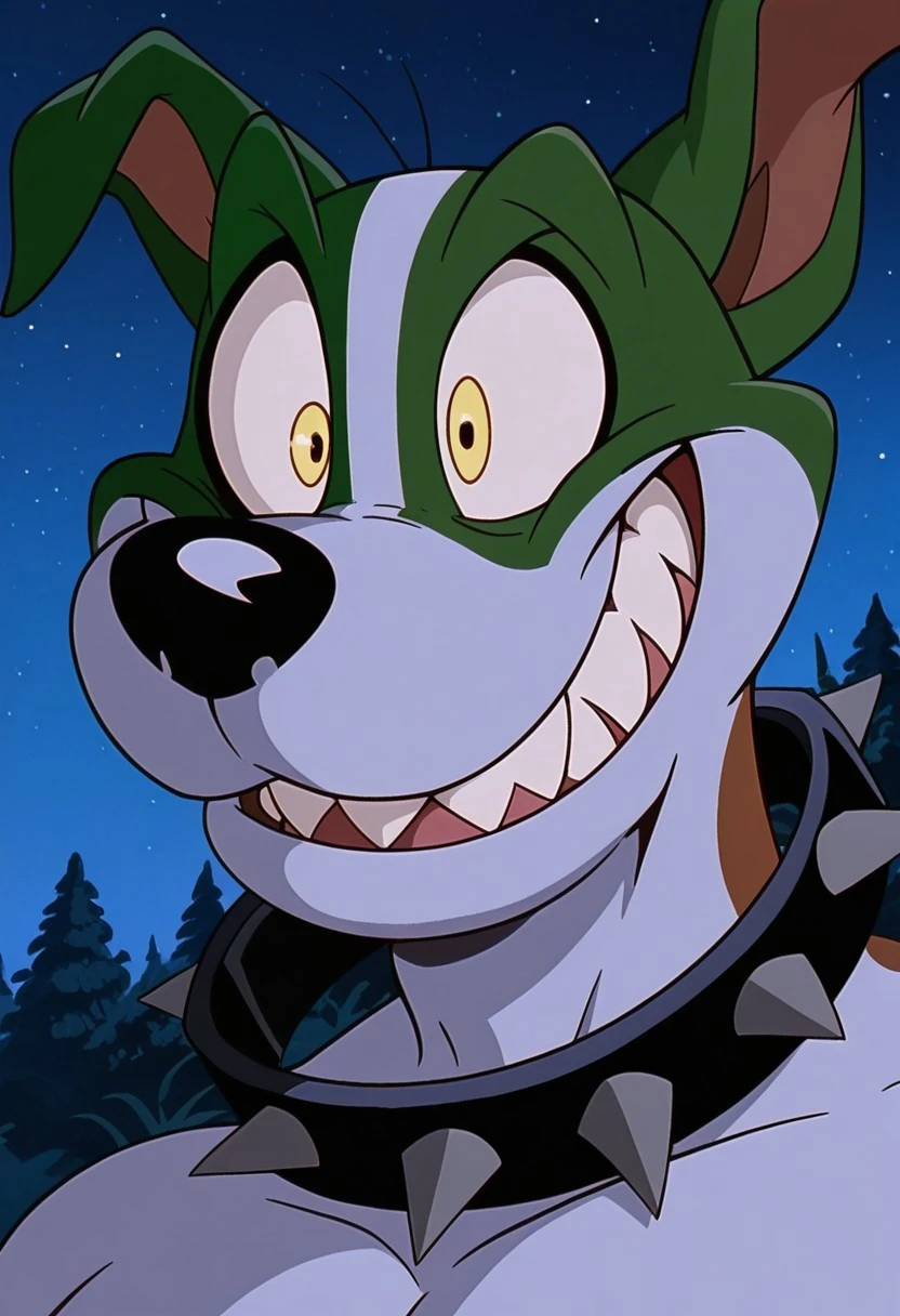 Otis: The Mask dog, Otis, 1boy, dog, jack russel terrier, anthropomorphic, green with white face, crazy eyes, black nose, sharp teeth, white and brown fur, black spiked collar