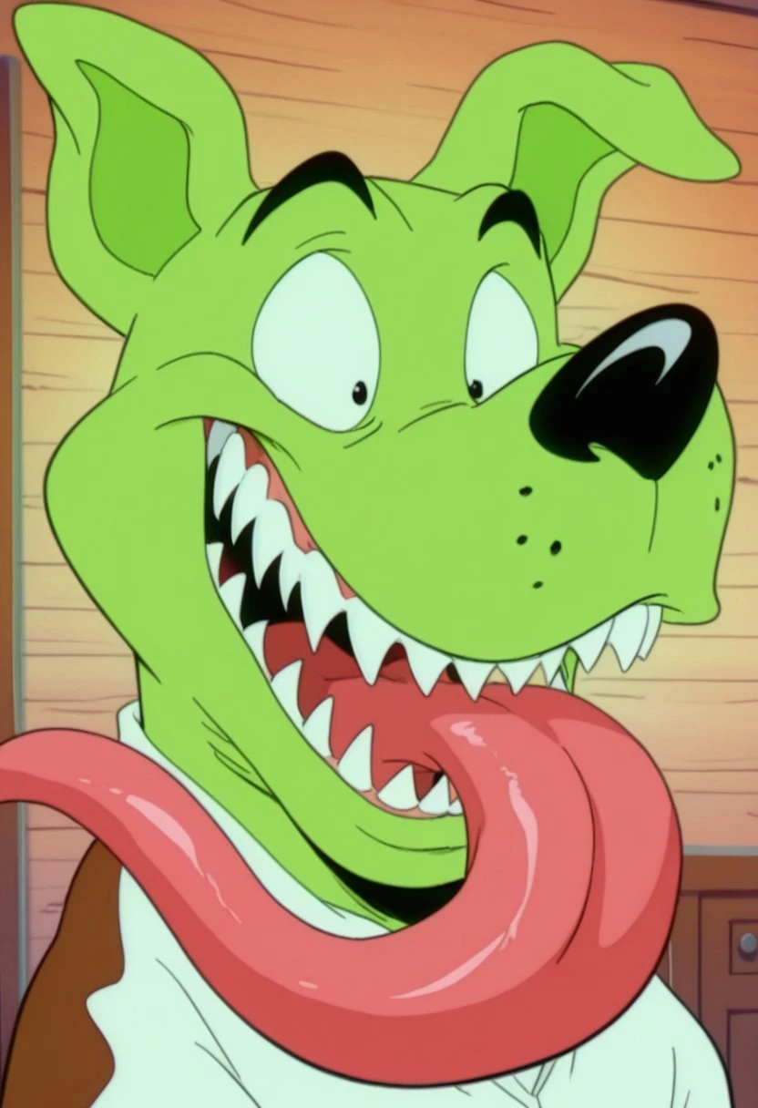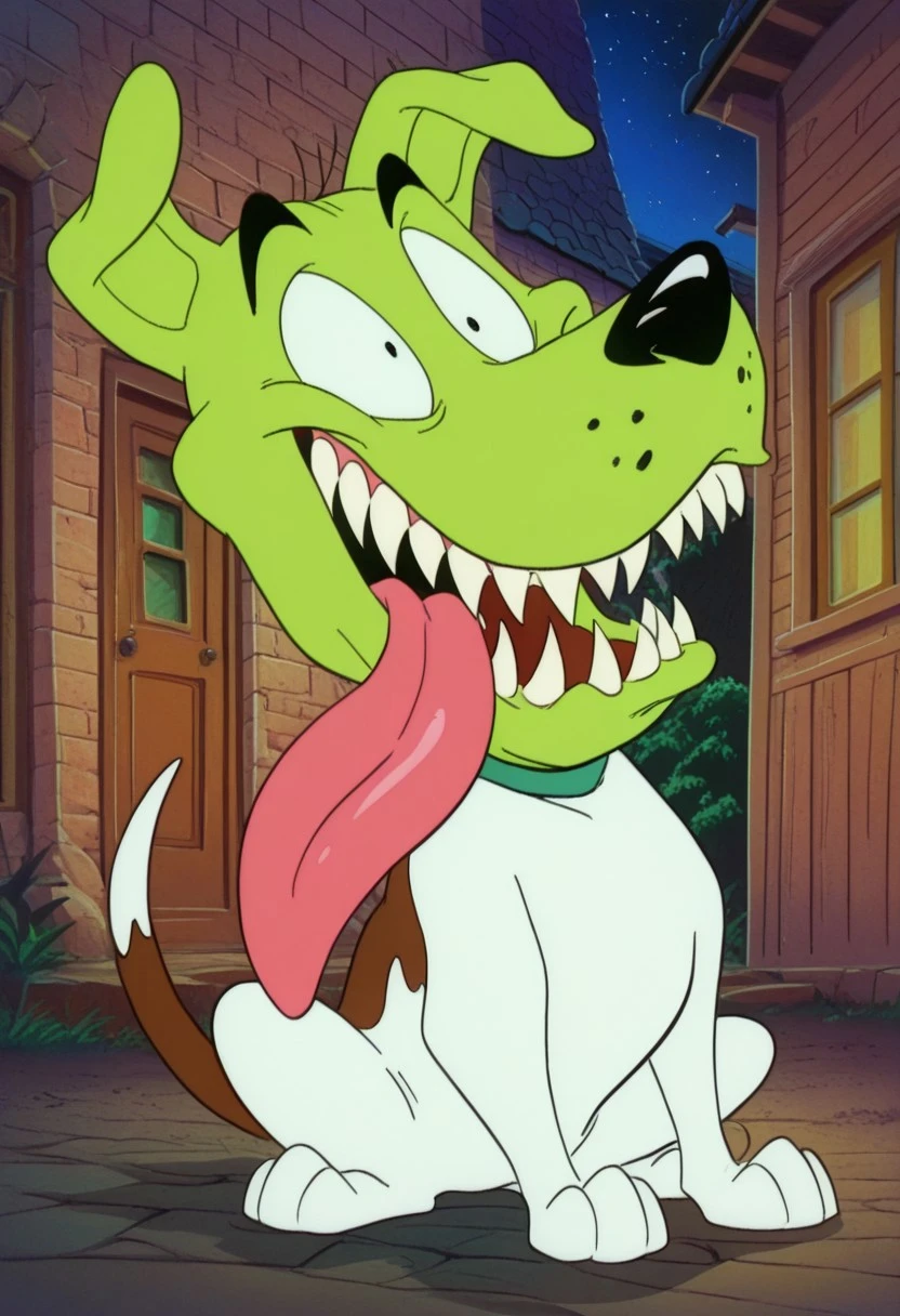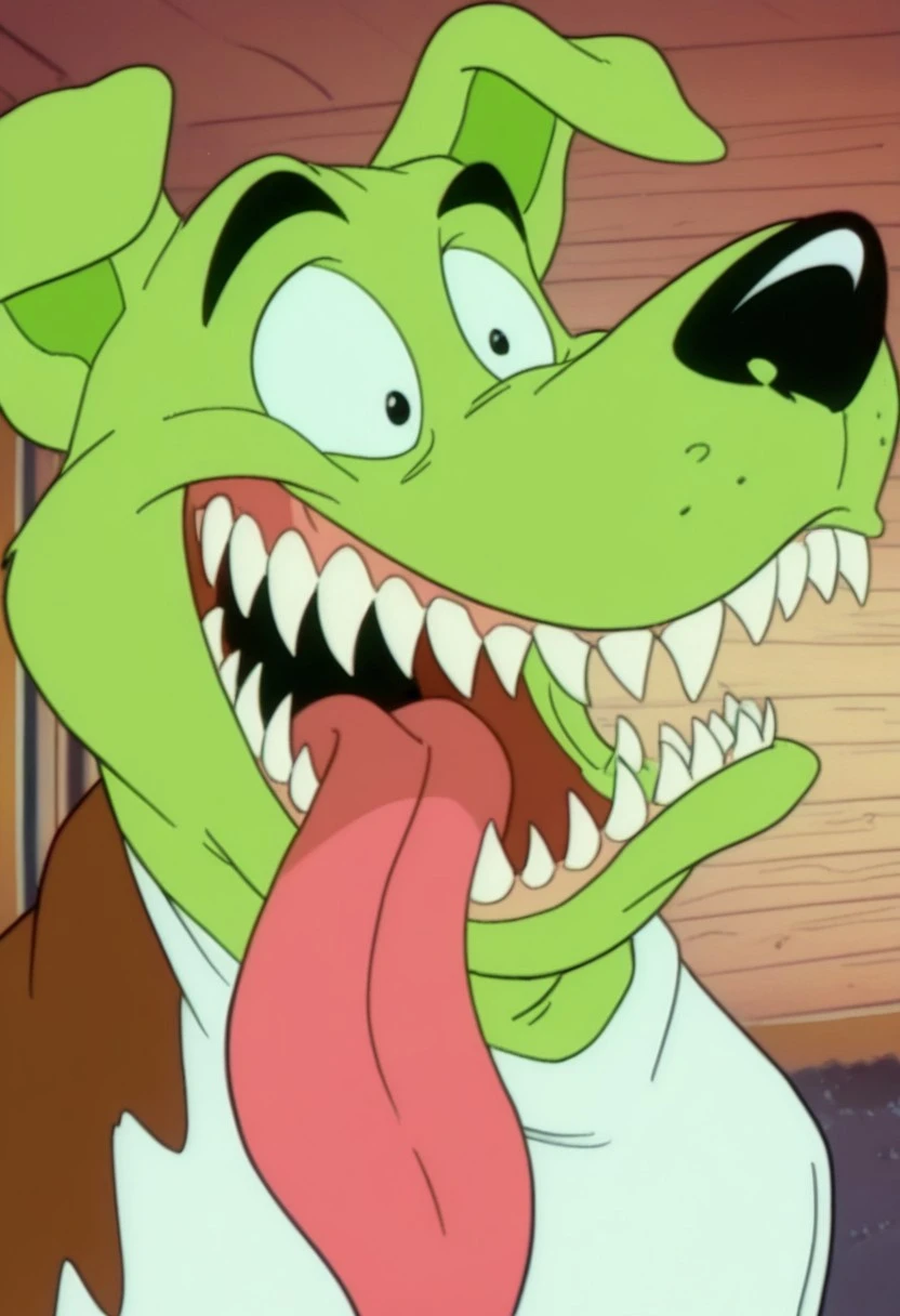 Milo: The Mask dog, Milo, 1boy, dog, jack russel terrier, green head, green face, black eyes, black nose, sharp teeth, long tongue, white and brown fur