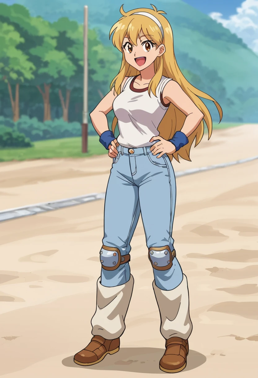Character from a now-obscure 1990s beat-em up called Undercover Cops. Prompt is "RosaFelmonde", for her game outfit "Hairband,wristband,white t shirt,jeans,leg warmers,knee pads,shoulder pads" and the like.