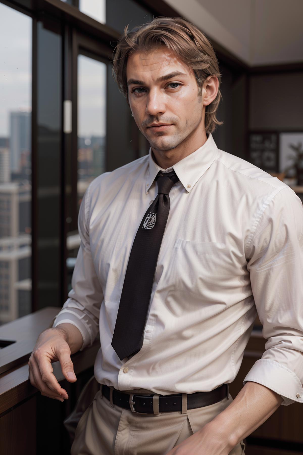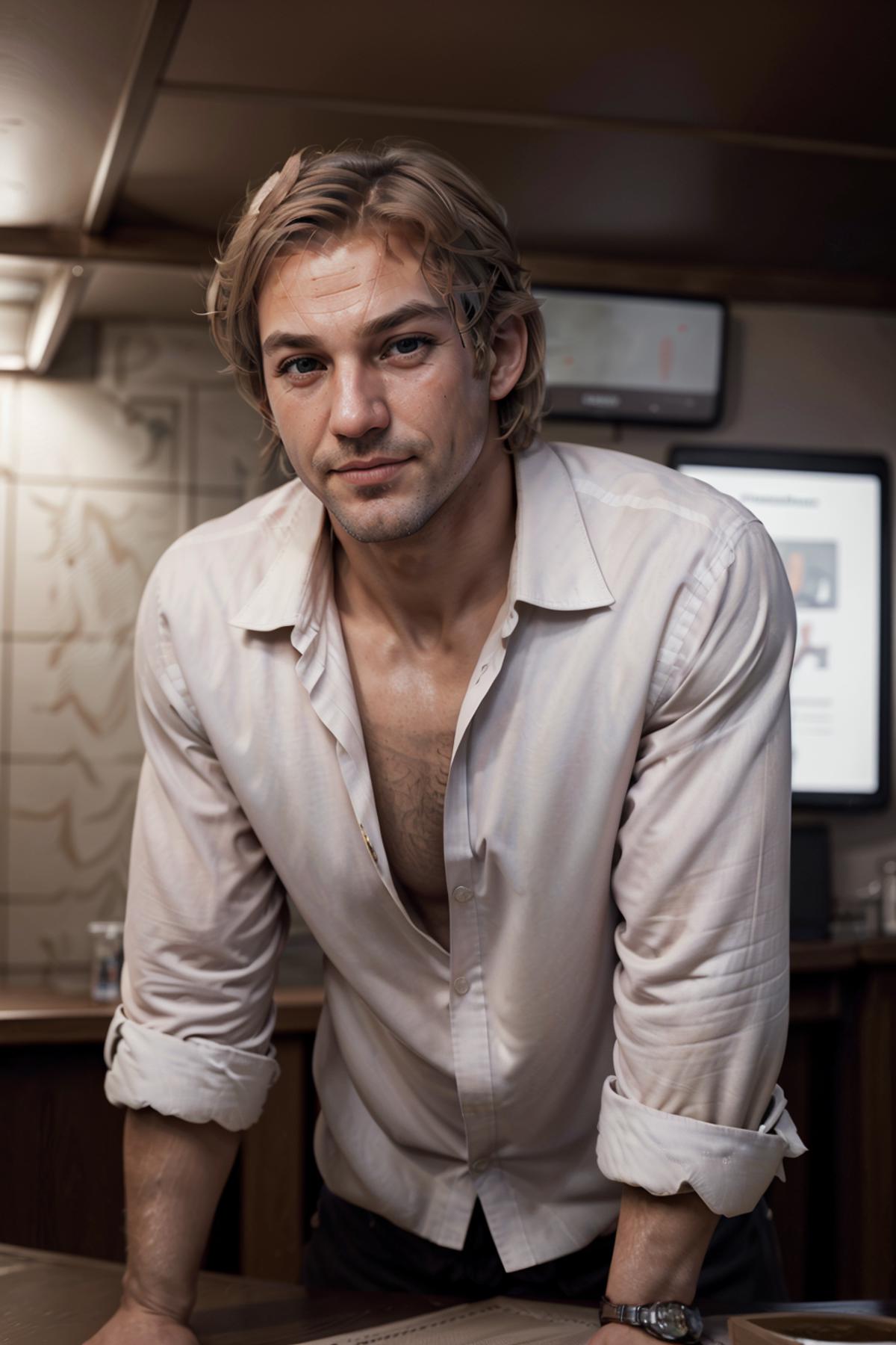 Another attempt at a stock character. This was the blonde male lead who ends up being revealed as a ???????. I think I had "murderous" in the prompt to get the source images.