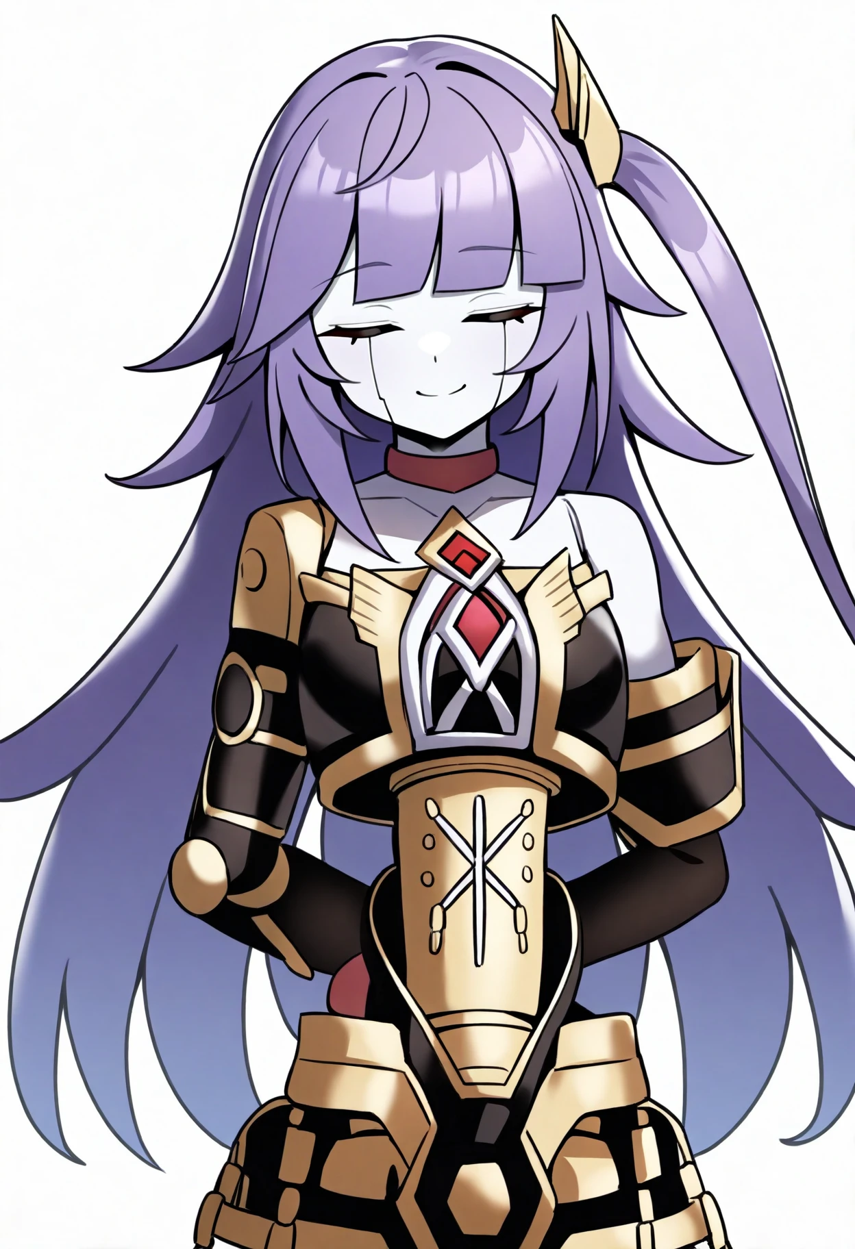 Basic prompts : 1girl, orcustgalatea purple hair, long hair, android, closed eyes, doll joints, duel monster, elbow gloves, joints, robot, robot joints