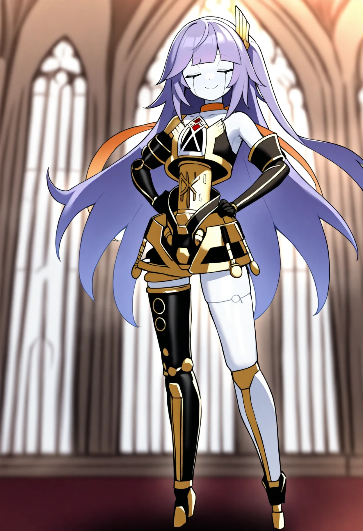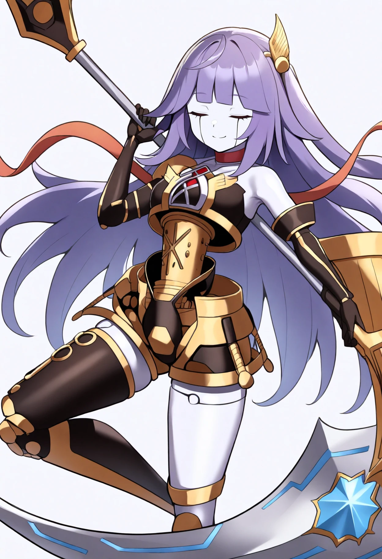 1girl, orcustgalatea purple hair, long hair, android, closed eyes, doll joints, duel monster, elbow gloves, joints, robot, robot joints
