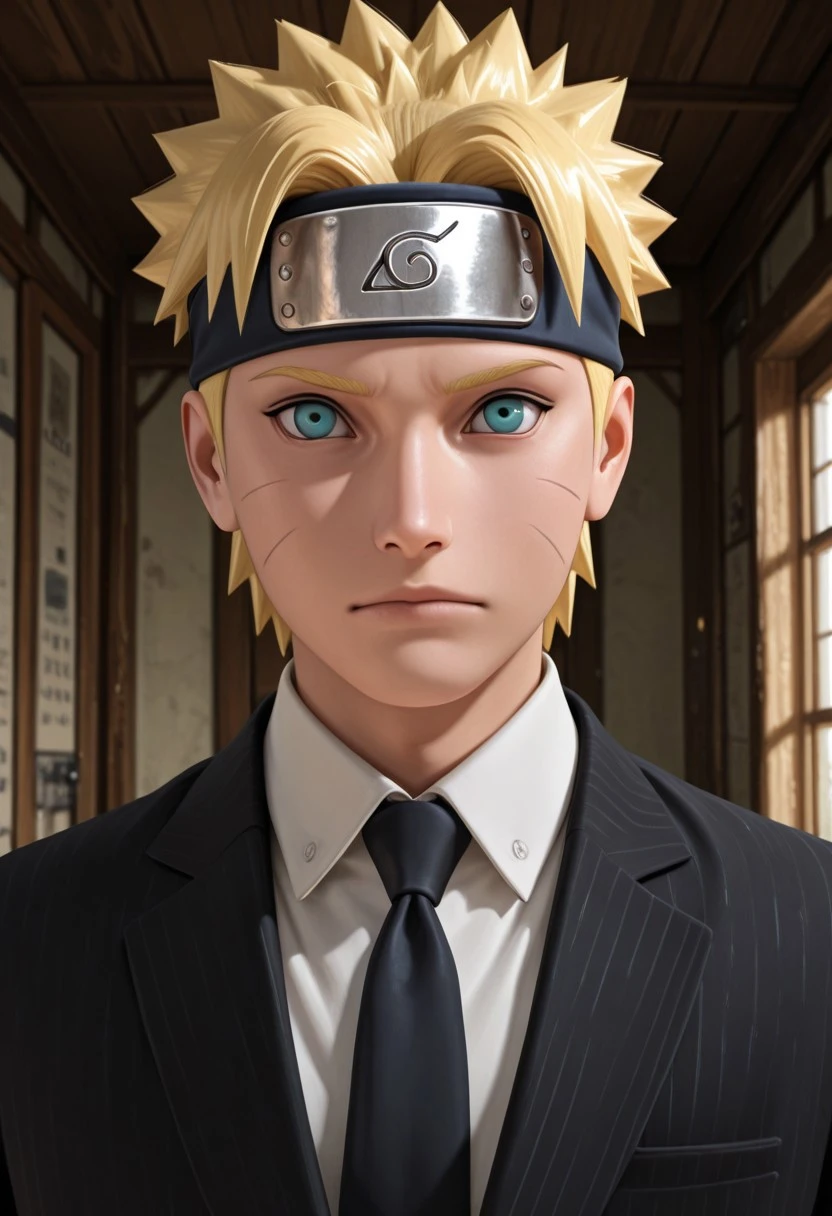 1boy, solo, naruto, yellow hair, forehead protector, black suit, suit, tie,
