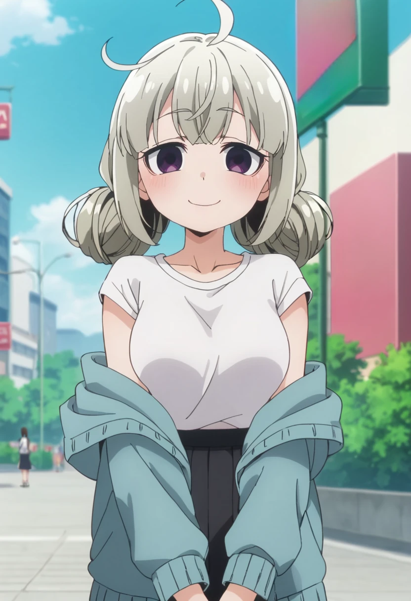 kiwi-casual,purple eyes,empty eyes,grey hair,double bun,ahoge,blue cardigan,sleeves past fingers,white shirt,t-shirt,black skirt,black loafers