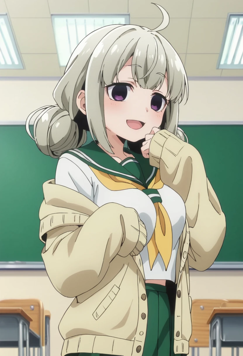 kiwi-school,purple eyes,empty eyes,grey hair,double bun,ahoge,medium breasts,school uniform,yellow neckerchief,cardigan,sleeves past wrists, black thighhighs,skirt,