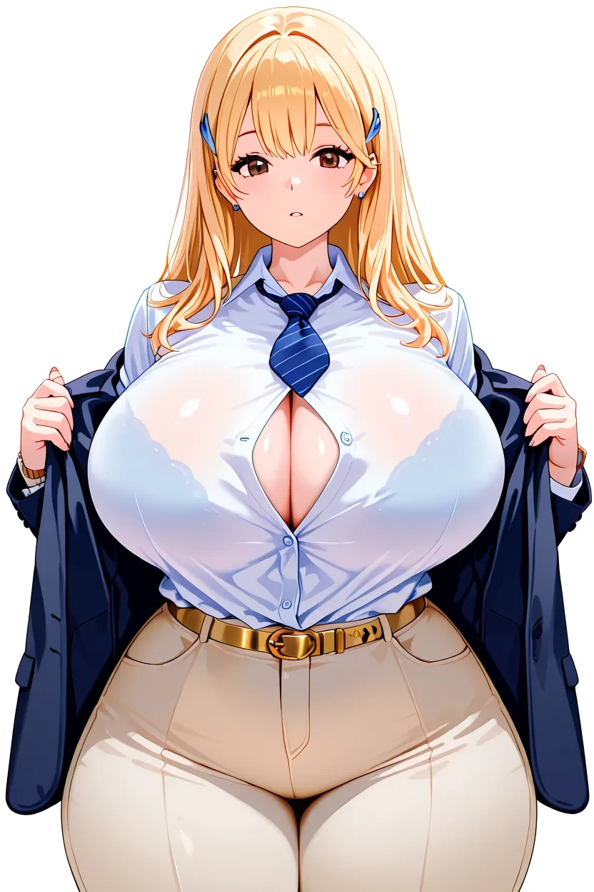1girl, Tia, brown_eyes, blonde_hair, long_hair, massive_breasts, curvy, sexy, wide hips, thick thighs, business suit, button up shirt neck tie, suit jacket, suit pants, wear a expensive watch, nice belt