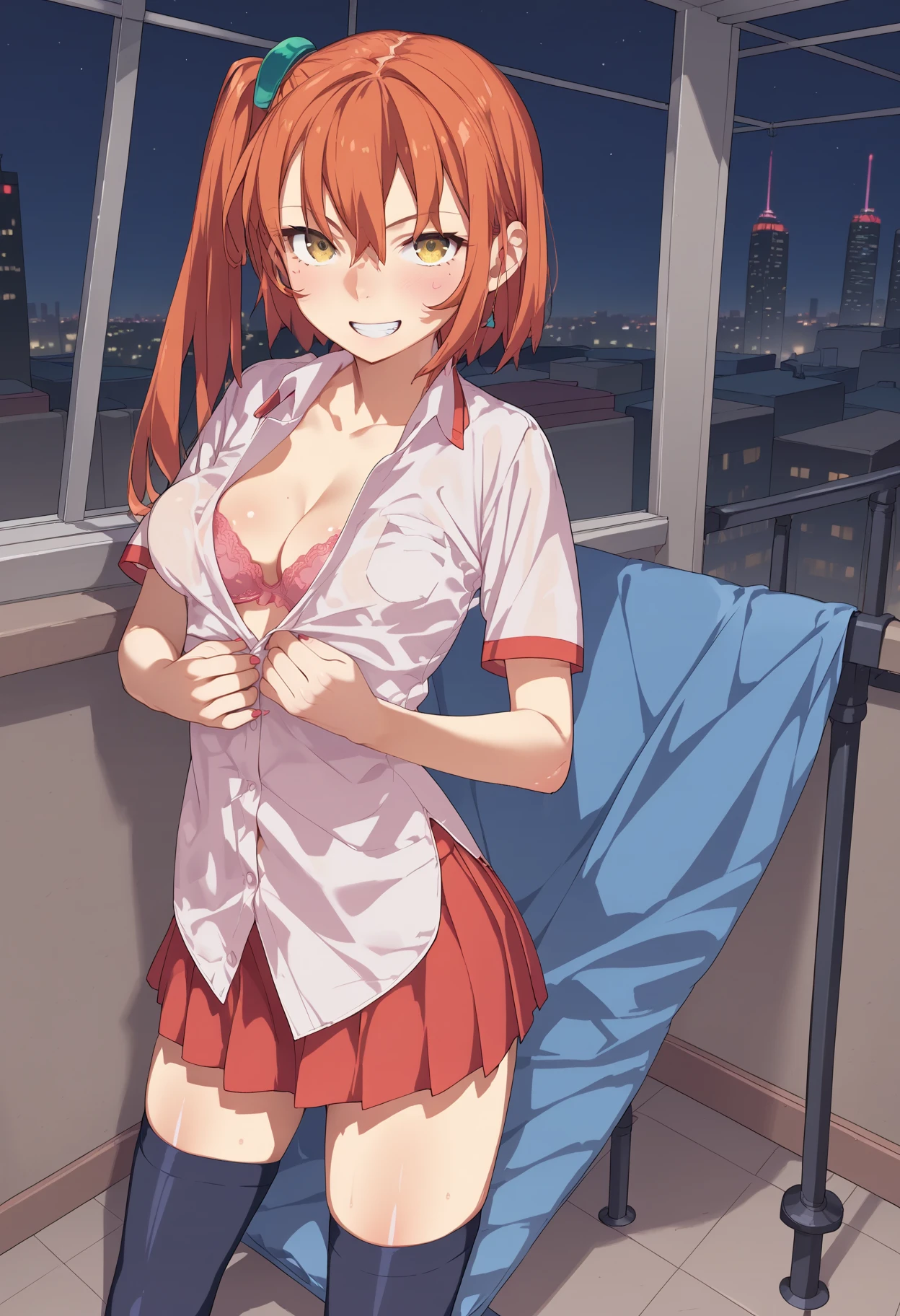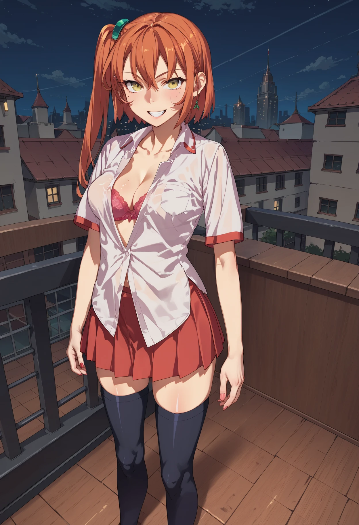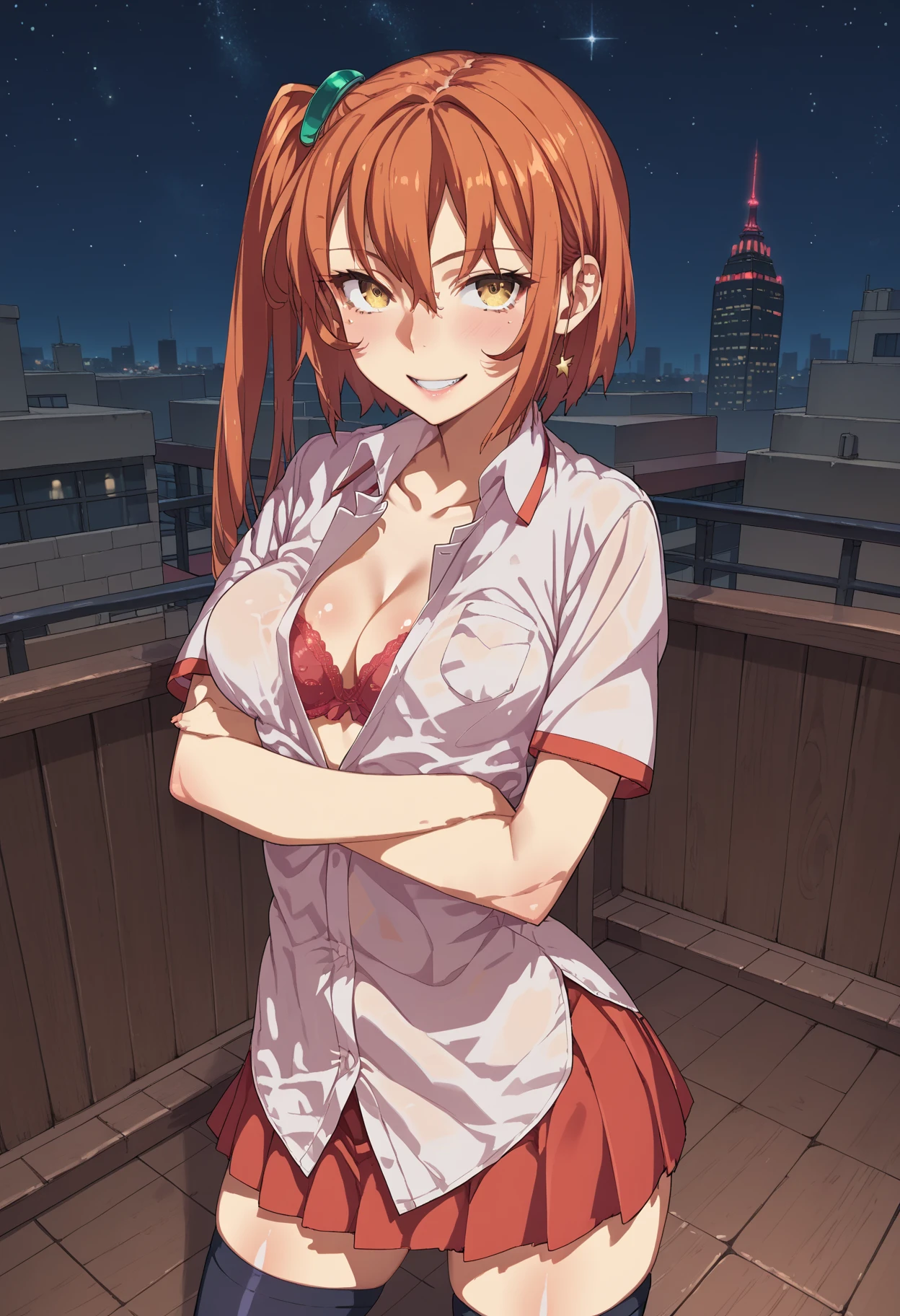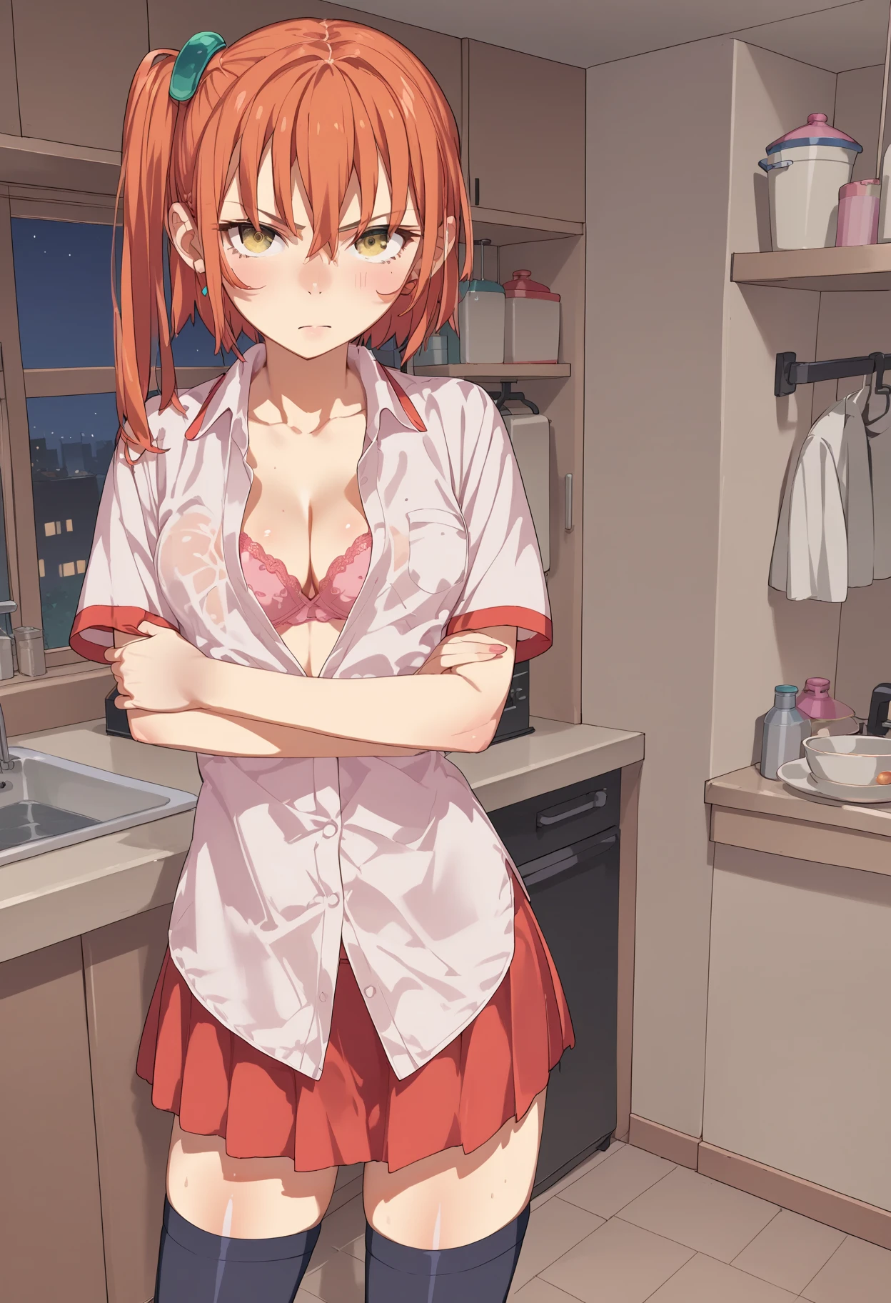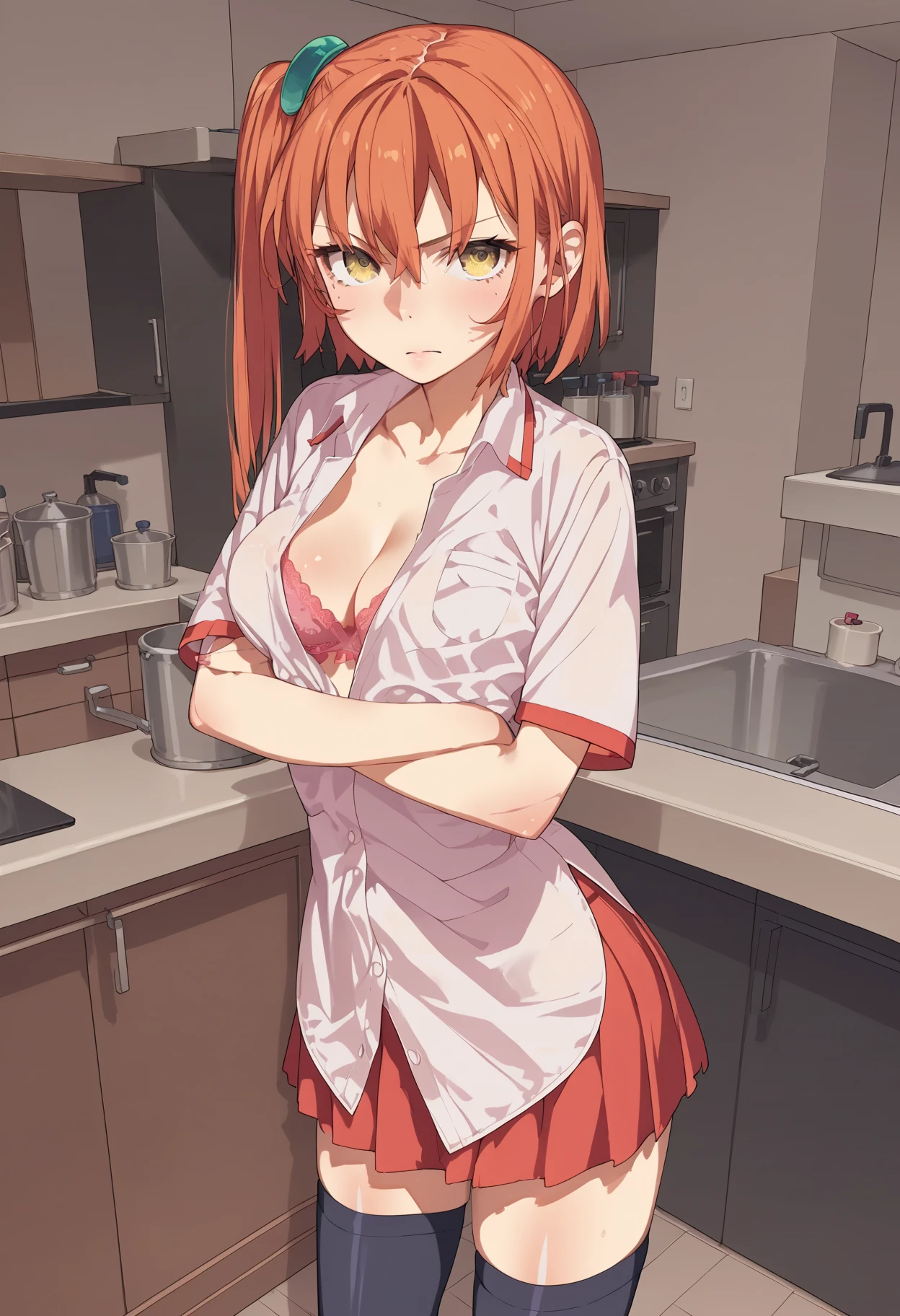 open shirt,light pink shirt,bra,cleavage,red skirt,underwear,thighhighs,zettai ryouiki,black thighhighs