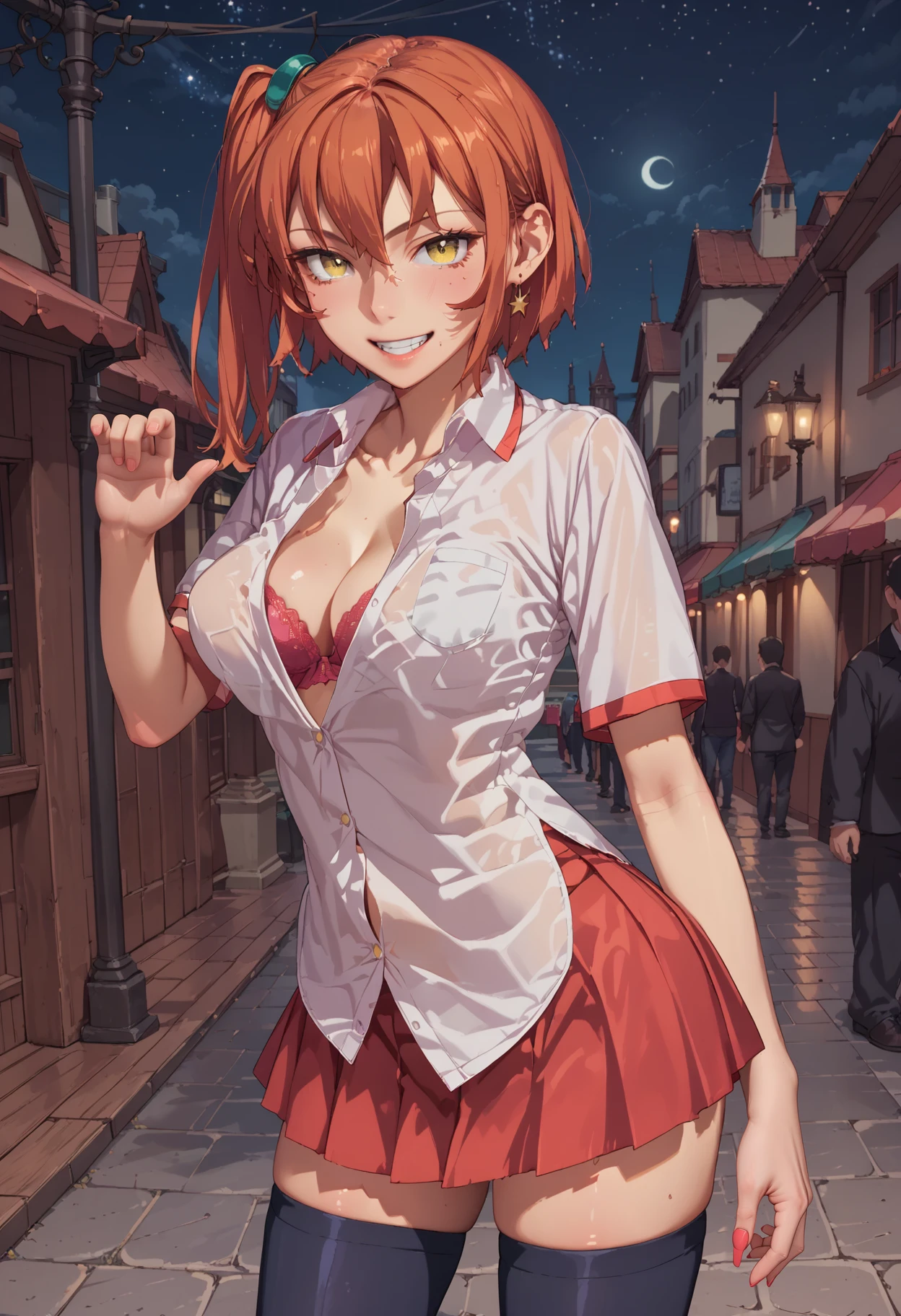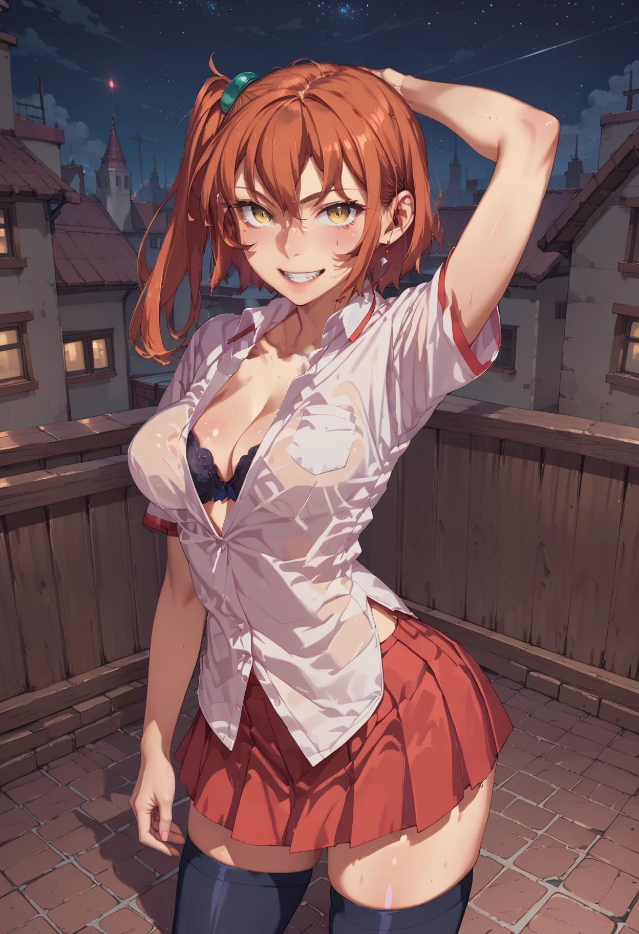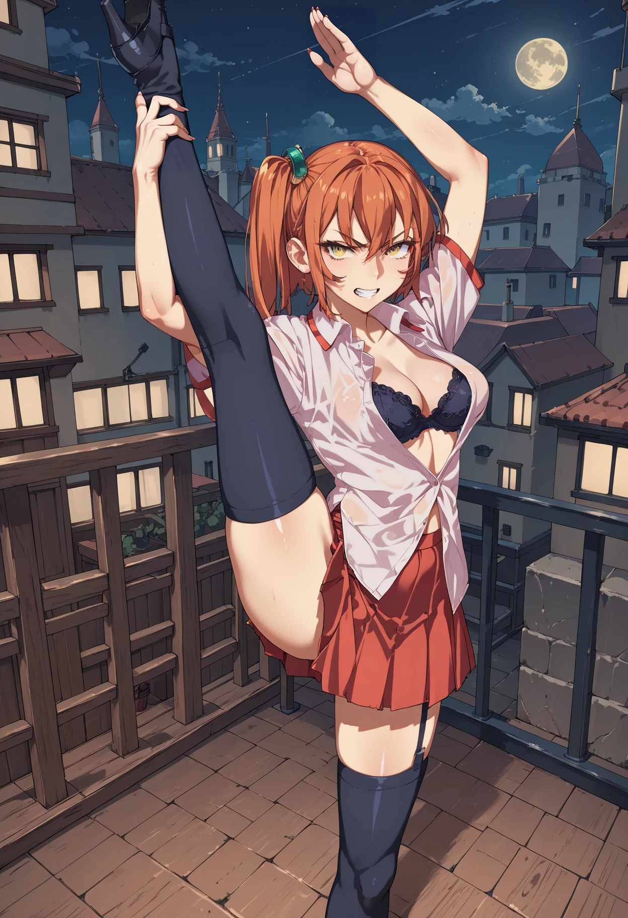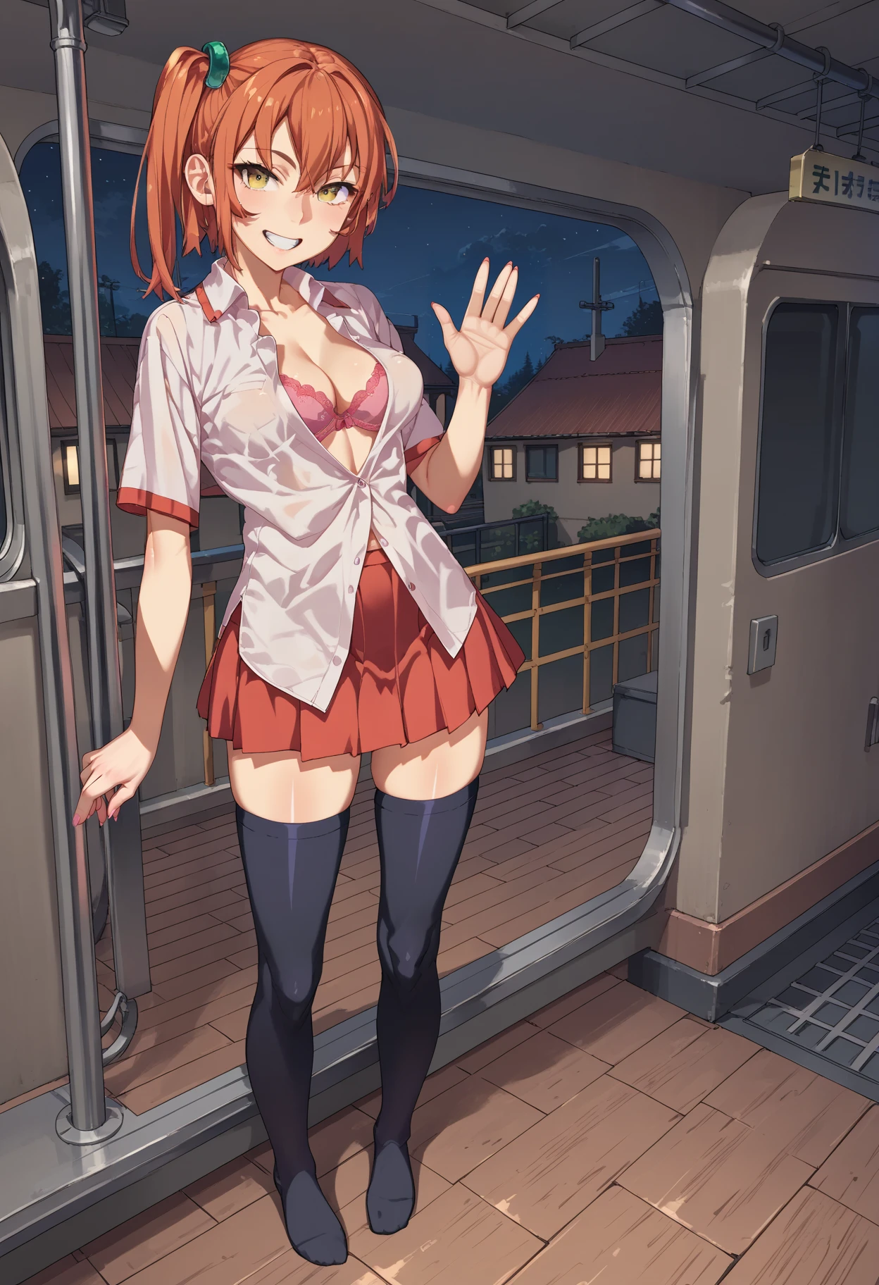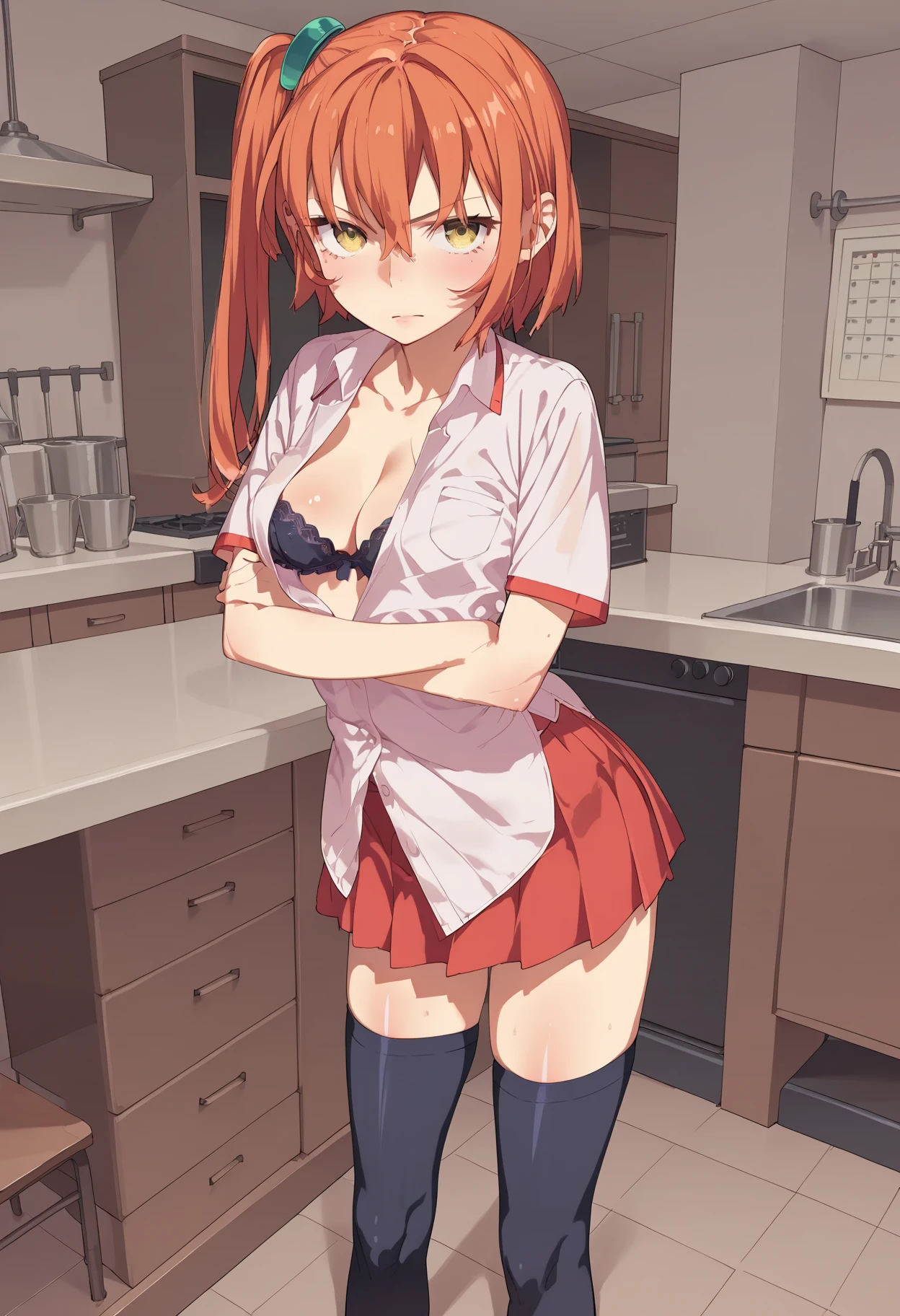 open shirt,light pink shirt,bra,cleavage,red skirt,underwear,thighhighs,zettai ryouiki,black thighhighs