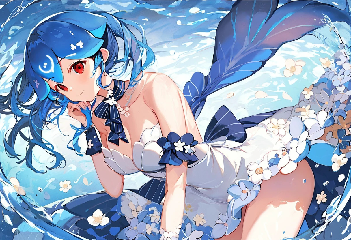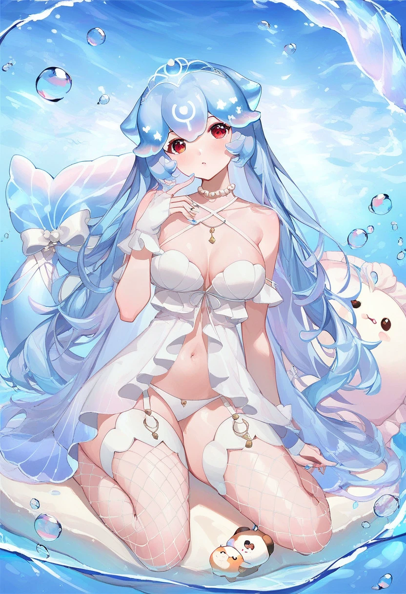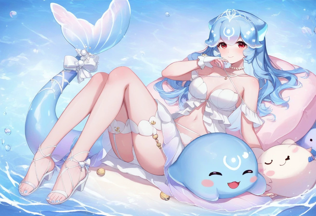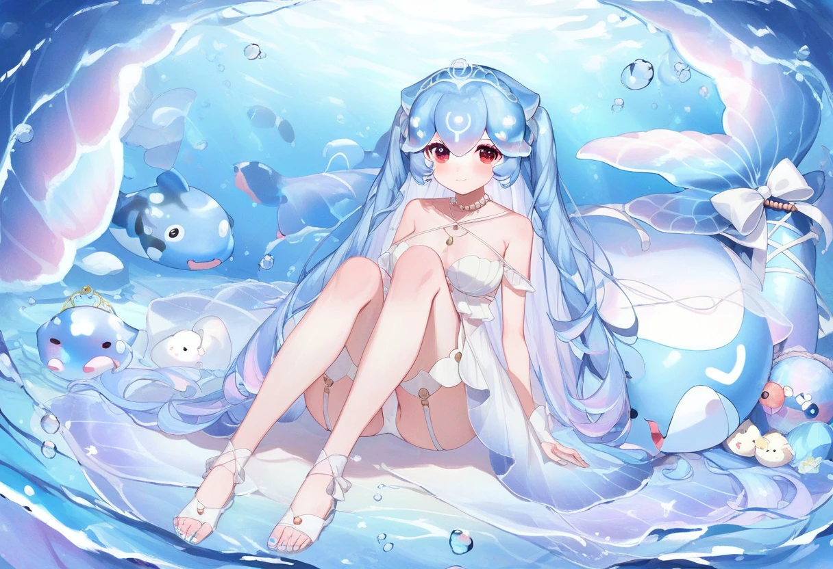 whale_bao,vtuber,red eyes, blue hair, pillow_princess, white princess crown, blue nail polish, whale tail, fish tail, white fishnet stocking, blue miniature whale, white ribbon tied to tail, Pearl necklace, white fingerless glove, blue sheer skirt, blue sheer cape, white bra, cross bra ties, collarbone, white garter, white panties, shiny buckle with plus sign, shiny buckle with cross sign,