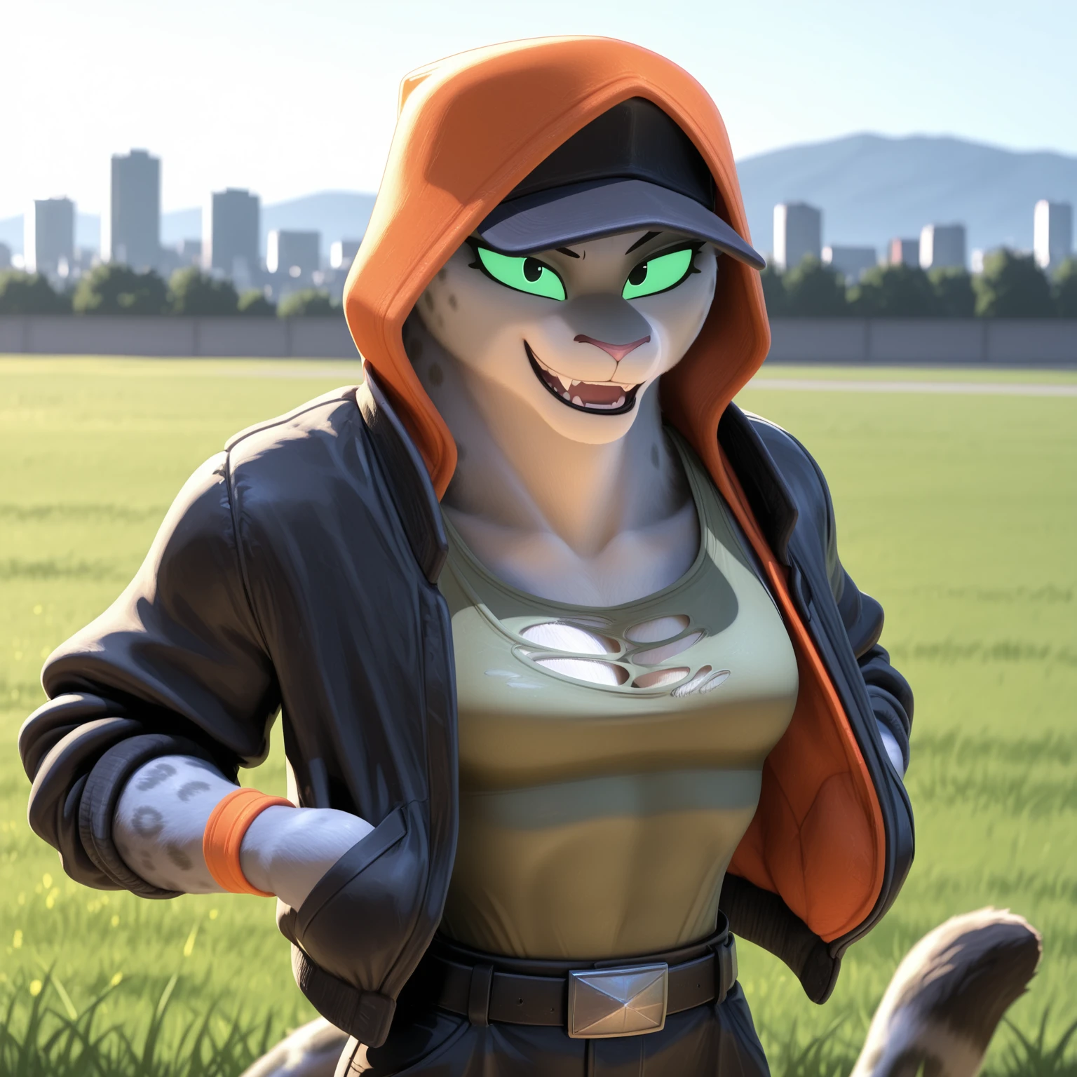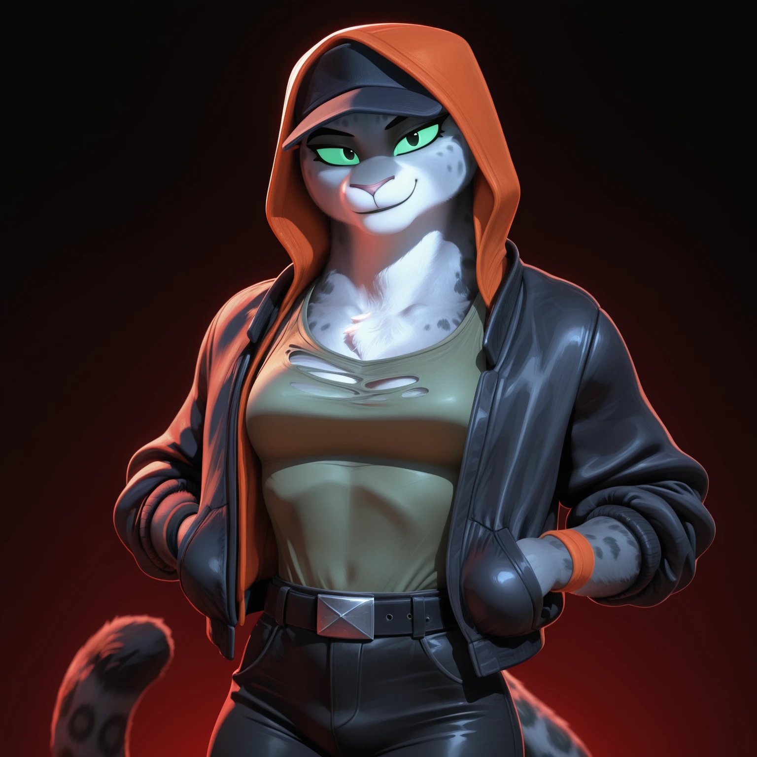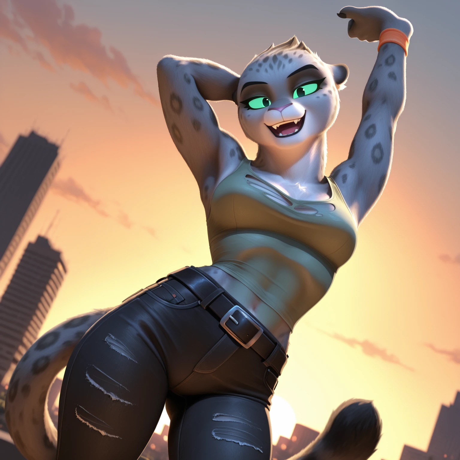 Positive Prompts: KitTBG2, furry female, anthro, felid, pantherine, snow leopard, black eyebrows, green sclera, black eyes, pink nose, grey body, grey fur, spotted body, grey tail, black tail tip, medium tail