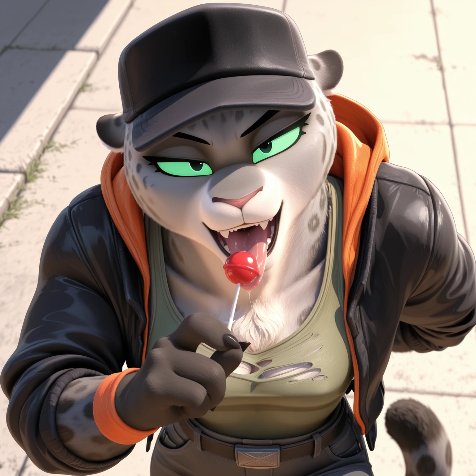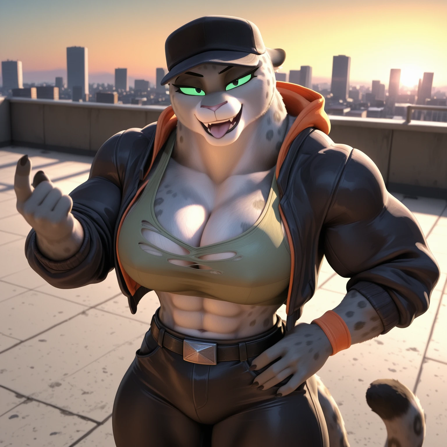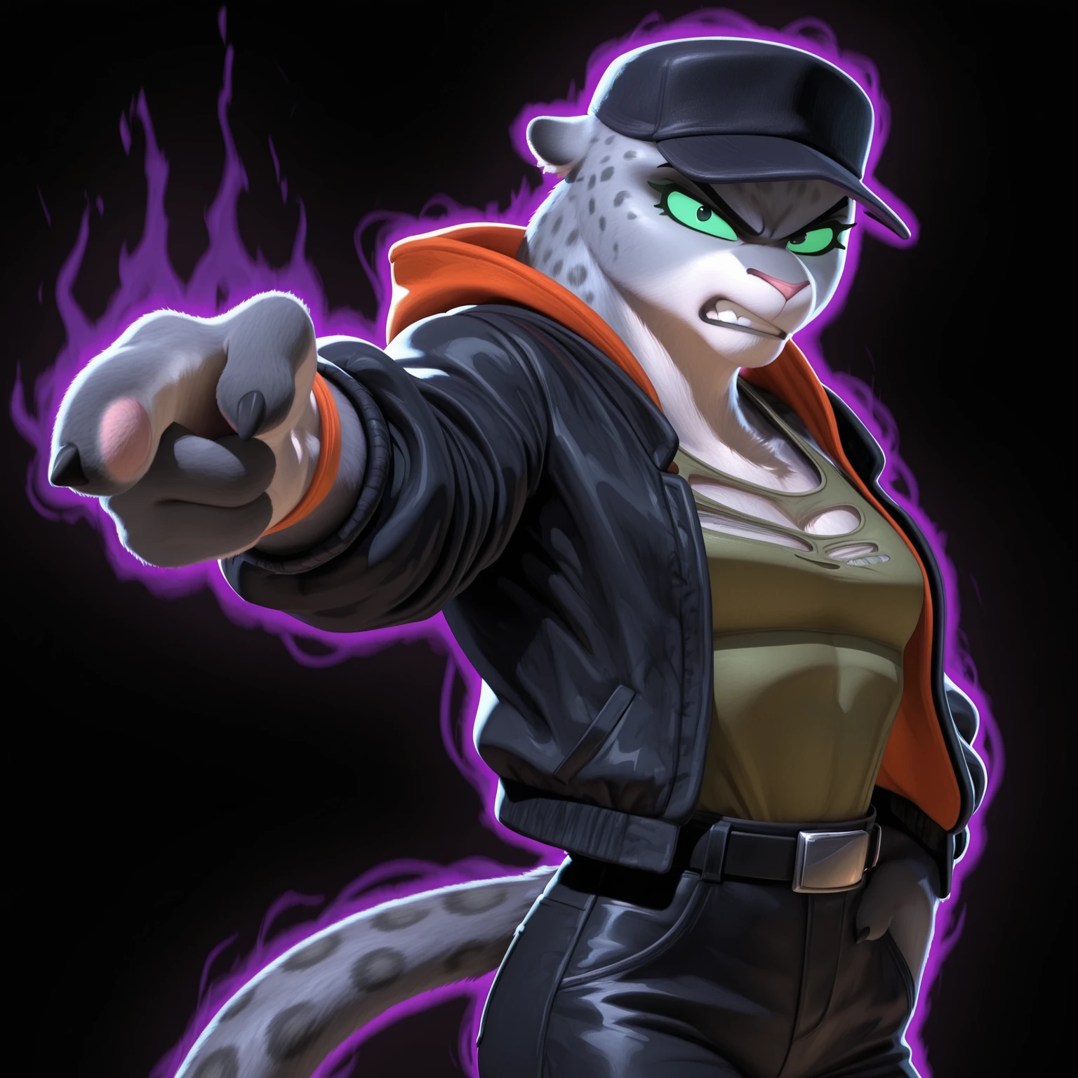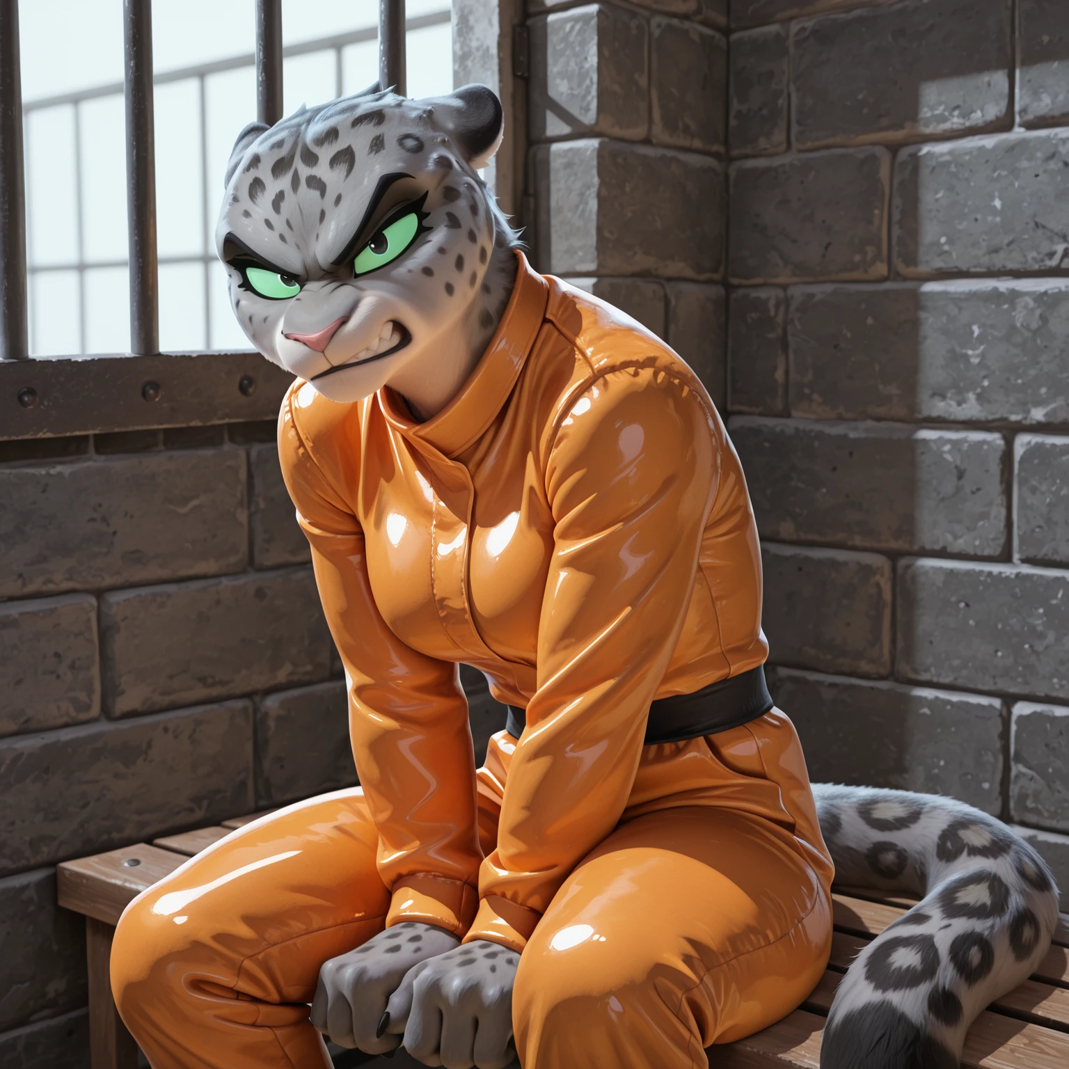 Positive Prompts: KitTBG2, furry female, anthro, felid, pantherine, snow leopard, black eyebrows, green sclera, black eyes, pink nose, grey body, grey fur, spotted body, grey tail, black tail tip, medium tail
