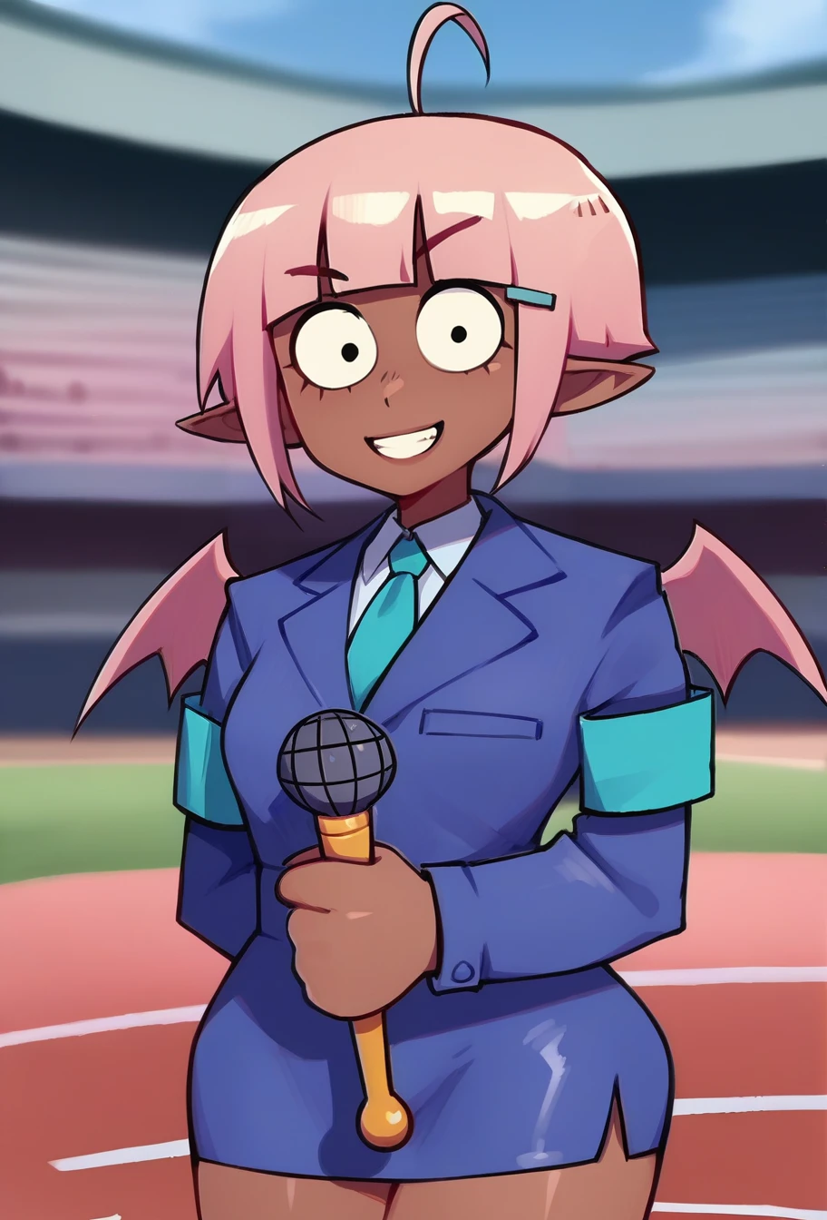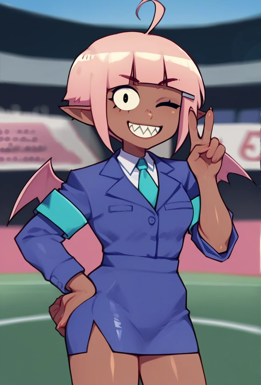 ppfmrjin, 1girl/1boy, short pink hair, blunt_bangs, ahoge, dark-skinned female, blue jacket, pencil skirt, white collar, necktie, single right armband, demon wings, pointy ears,