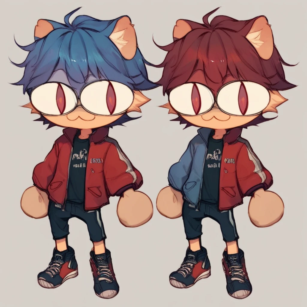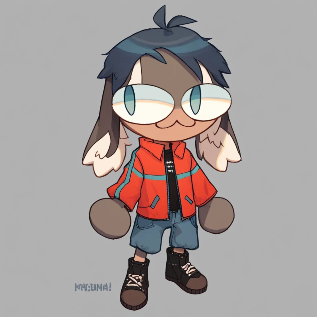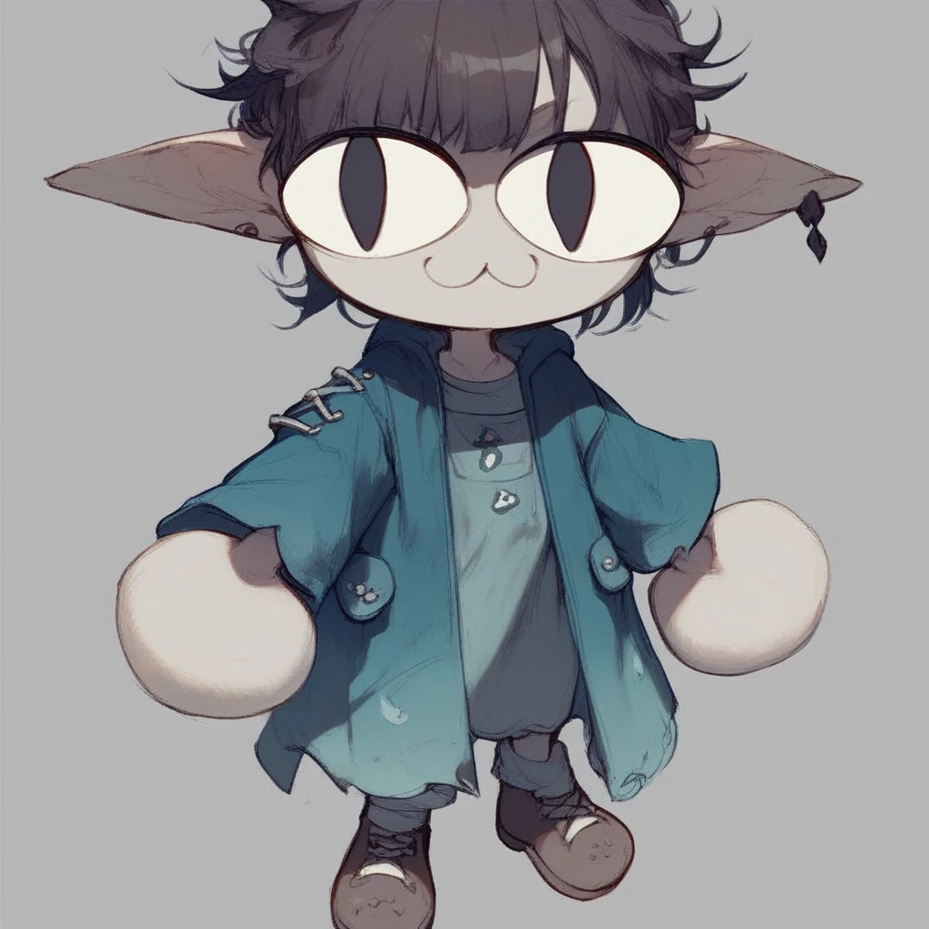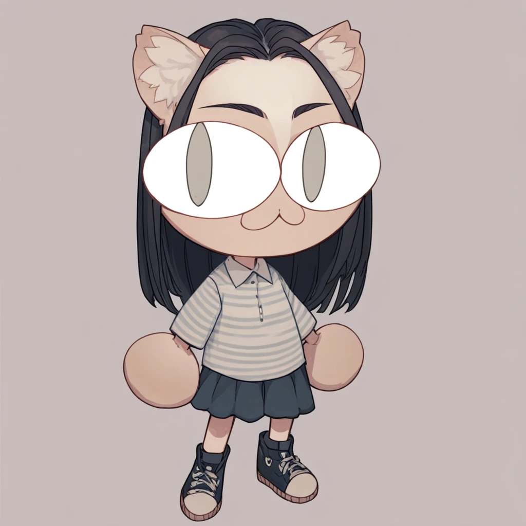 mikus-concept, large eyes, standing, looking at the view, round hands, oval eyes
