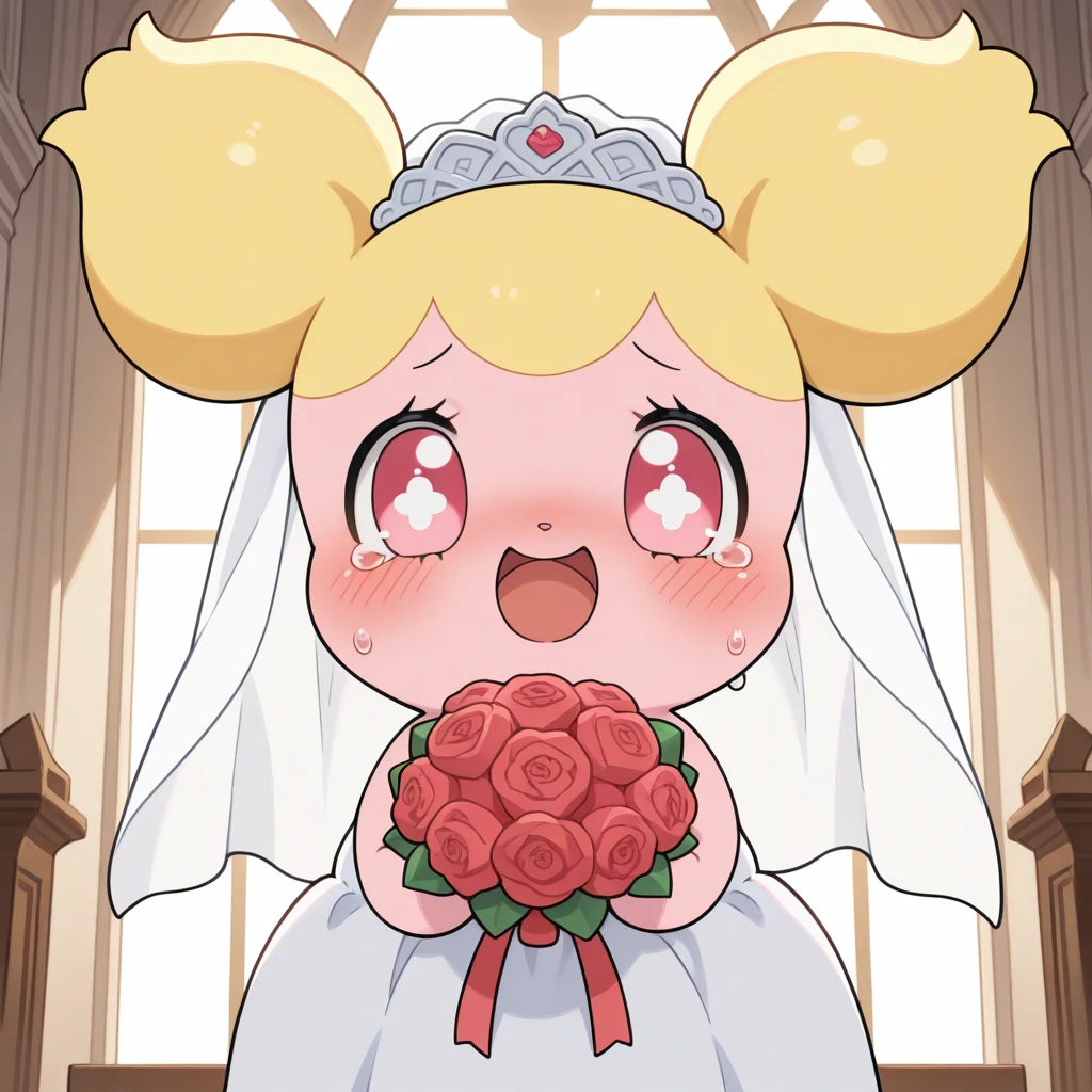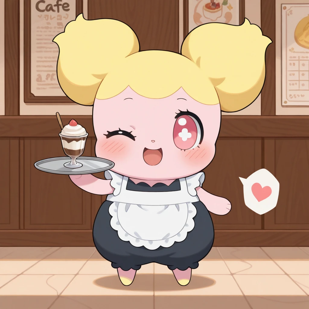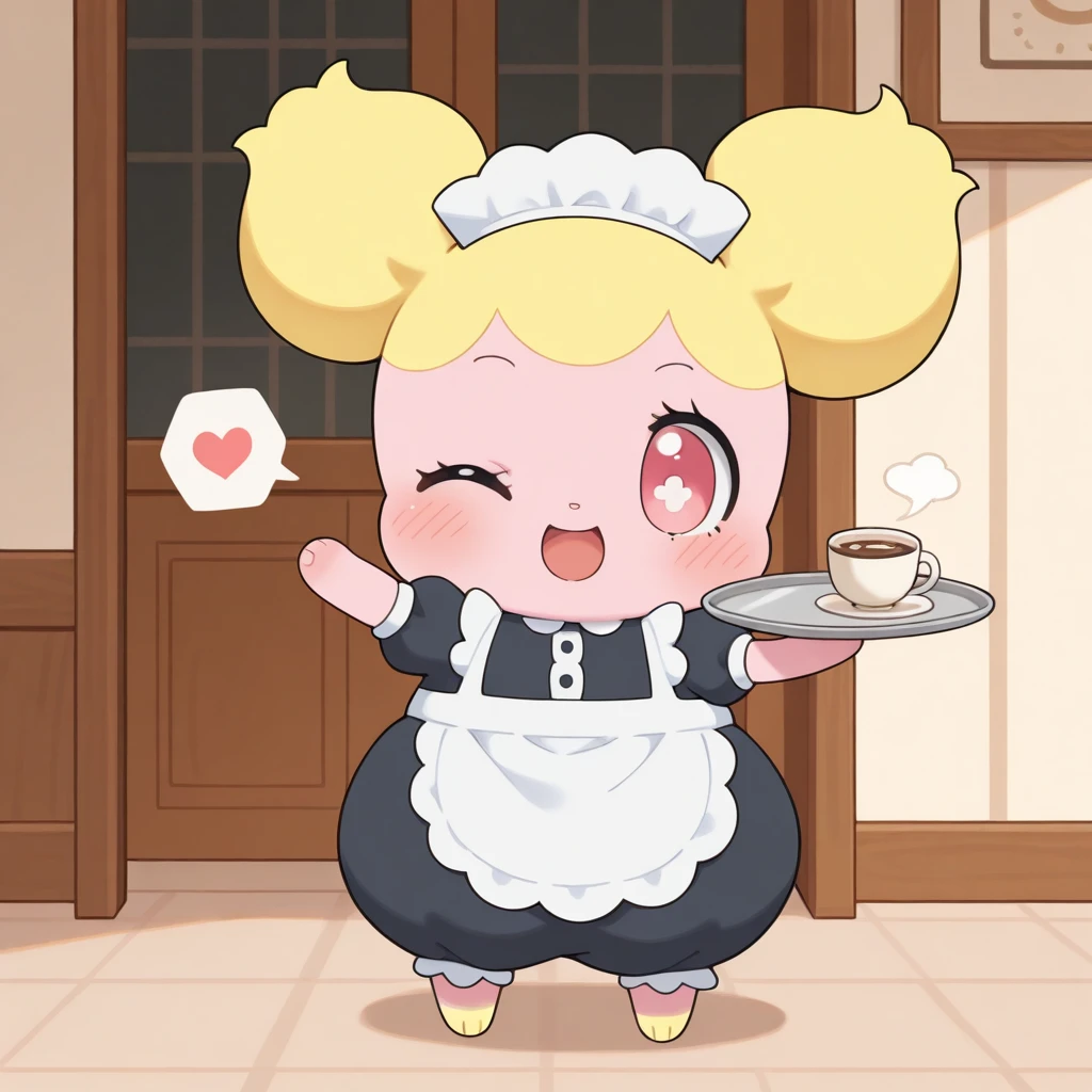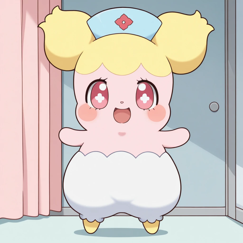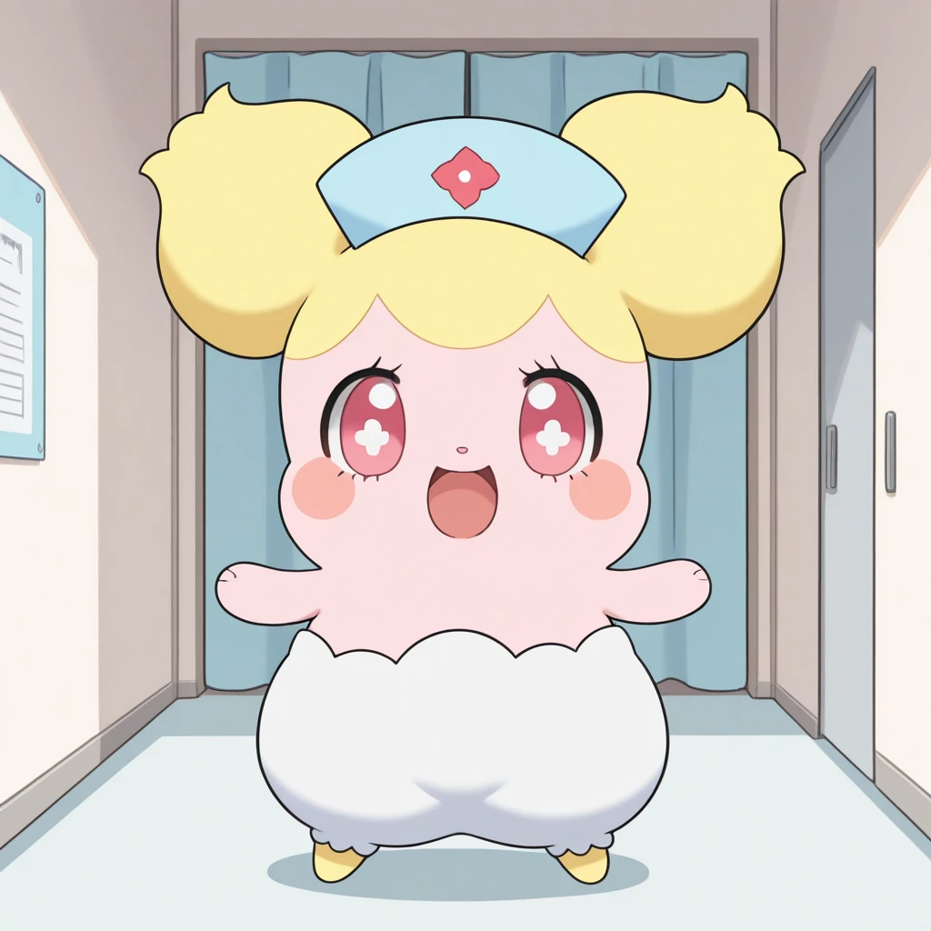 hottoni, nurse cap, hat, blush, red eyes, feral, furry, chibi, double bun, blonde hair, pink eyes, nurse