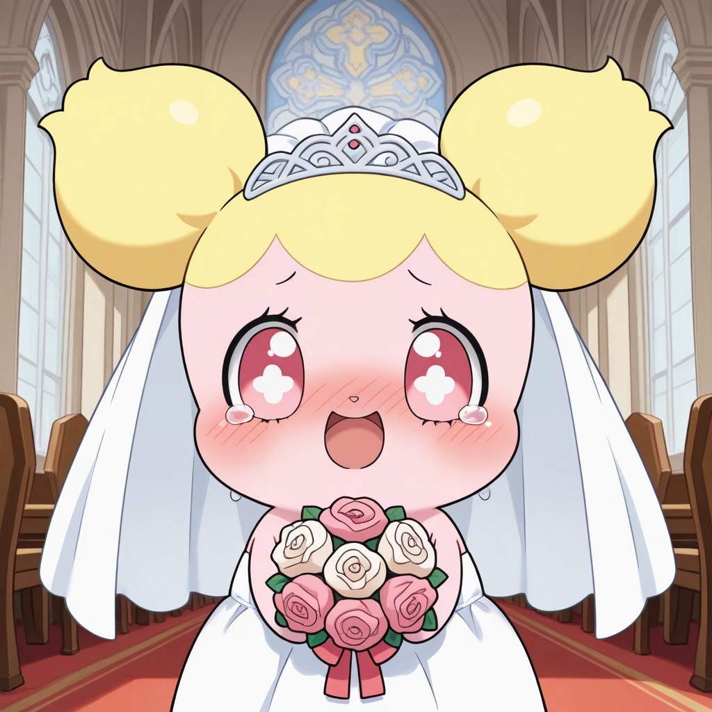 prompts: hottoni, nurse cap, hat, blush, red eyes, feral, furry, chibi, double bun, blonde hair, pink eyes, nurse