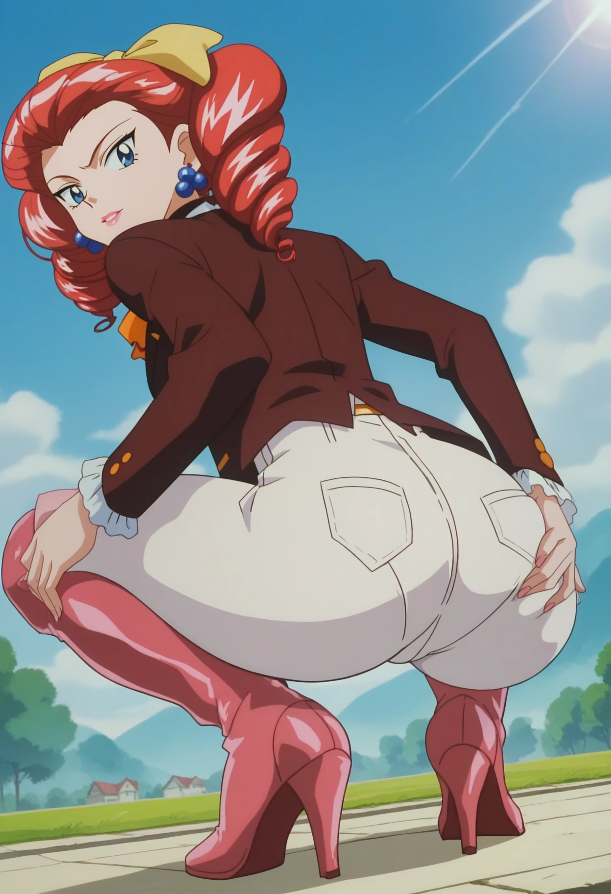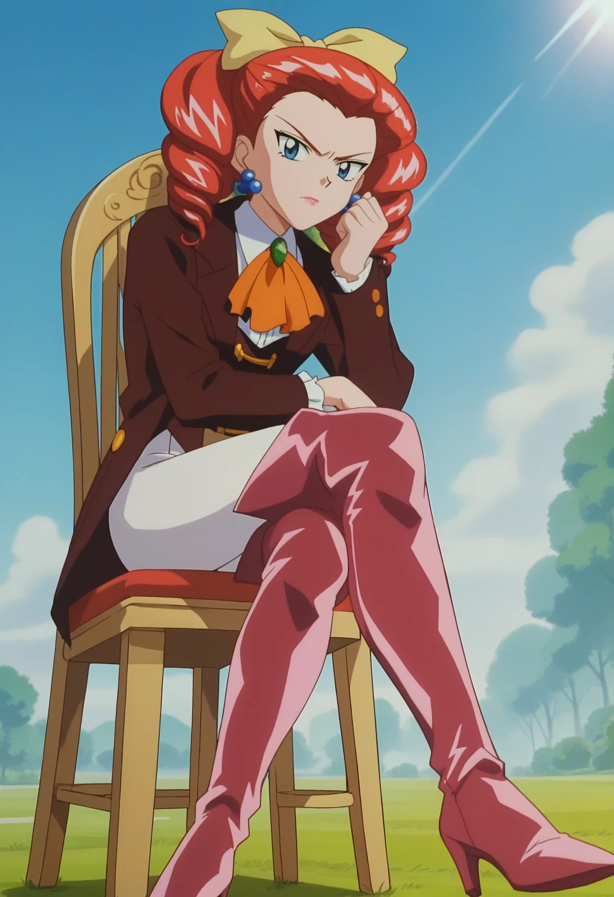 brown jacket, orange ascot, white pants, thigh boots, high heel boots,
