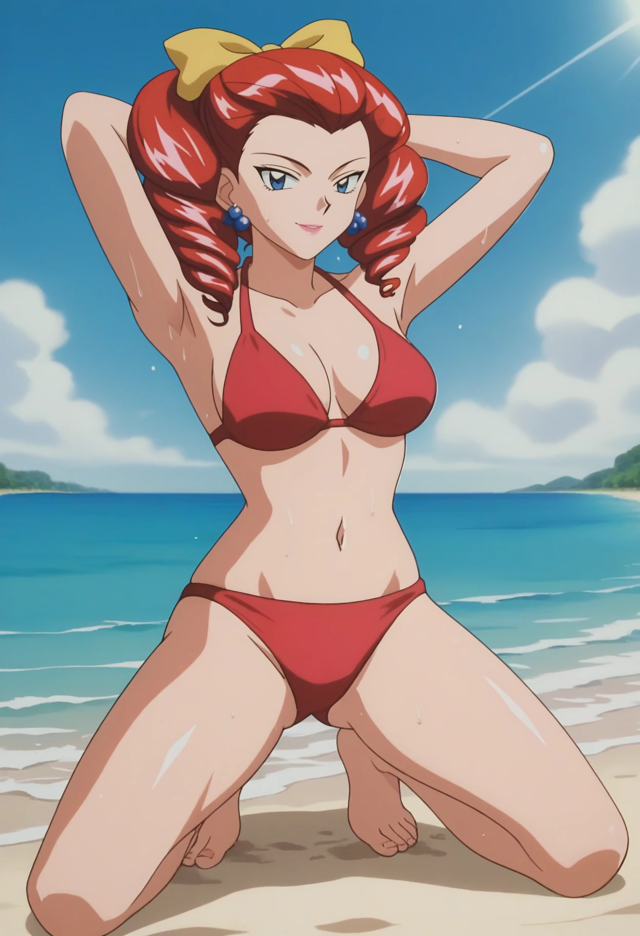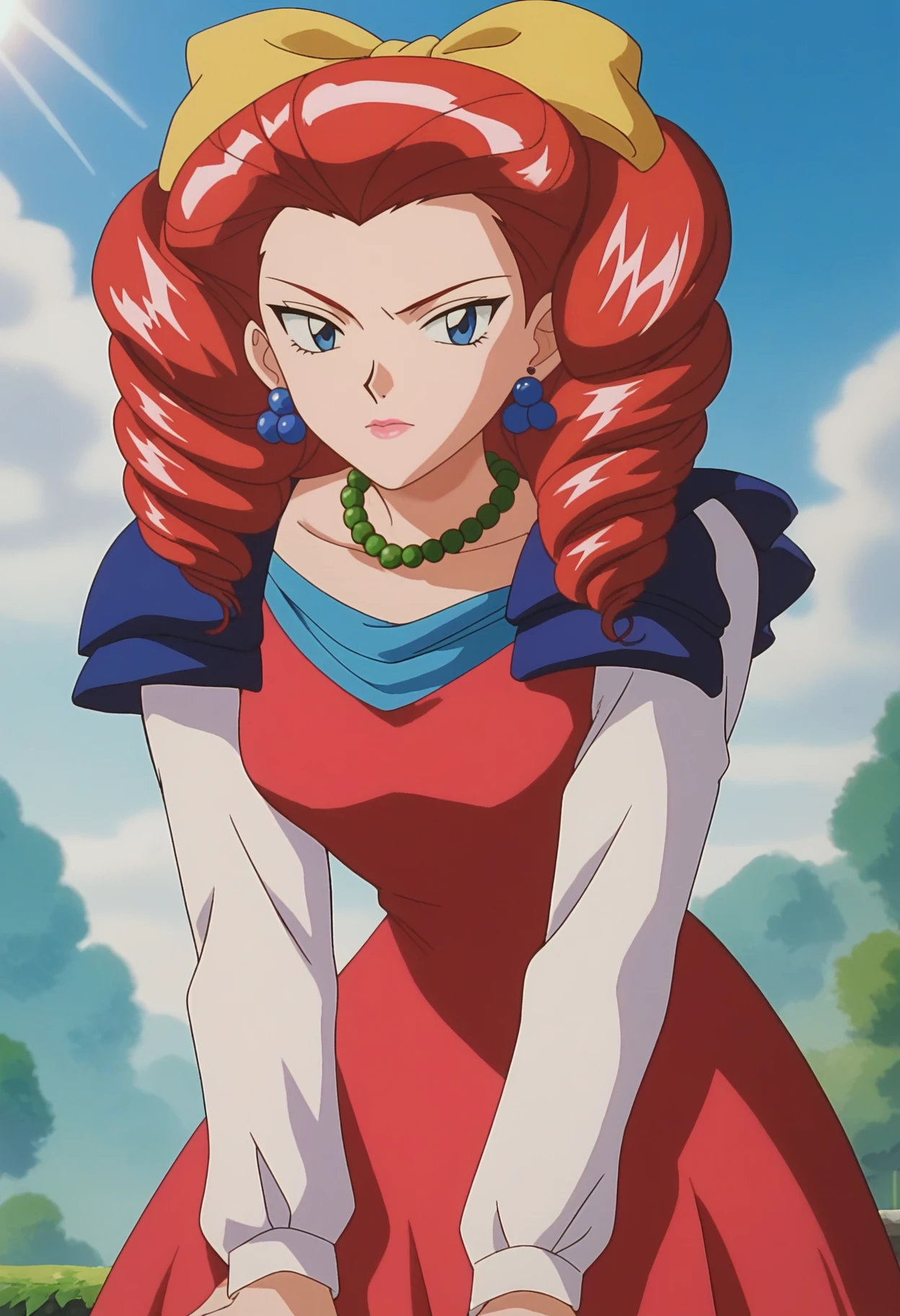 PMJessebelle, blue eyes, red hair, drill hair, yellow bow, hair bow, earrings, lipstick, pink lips,