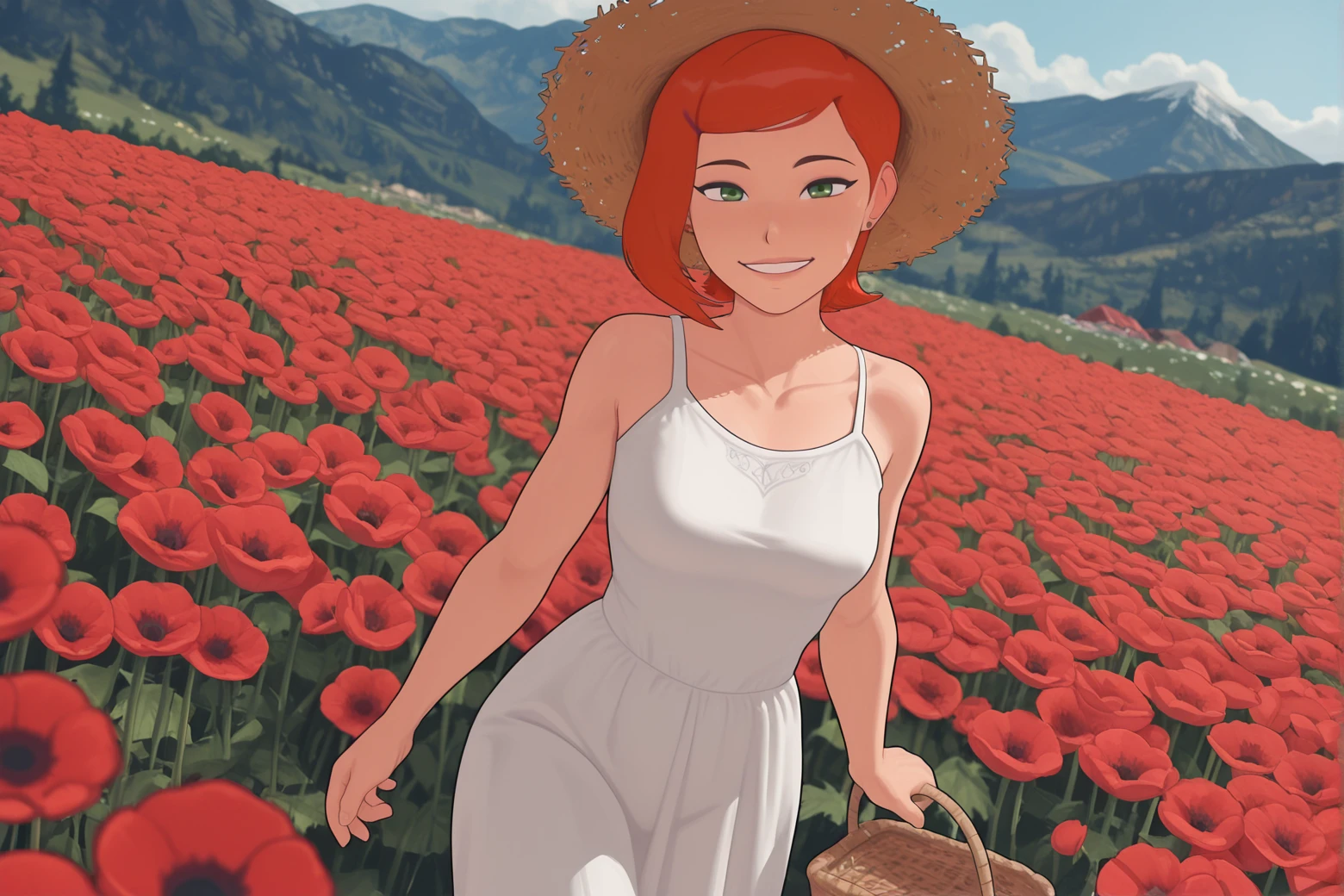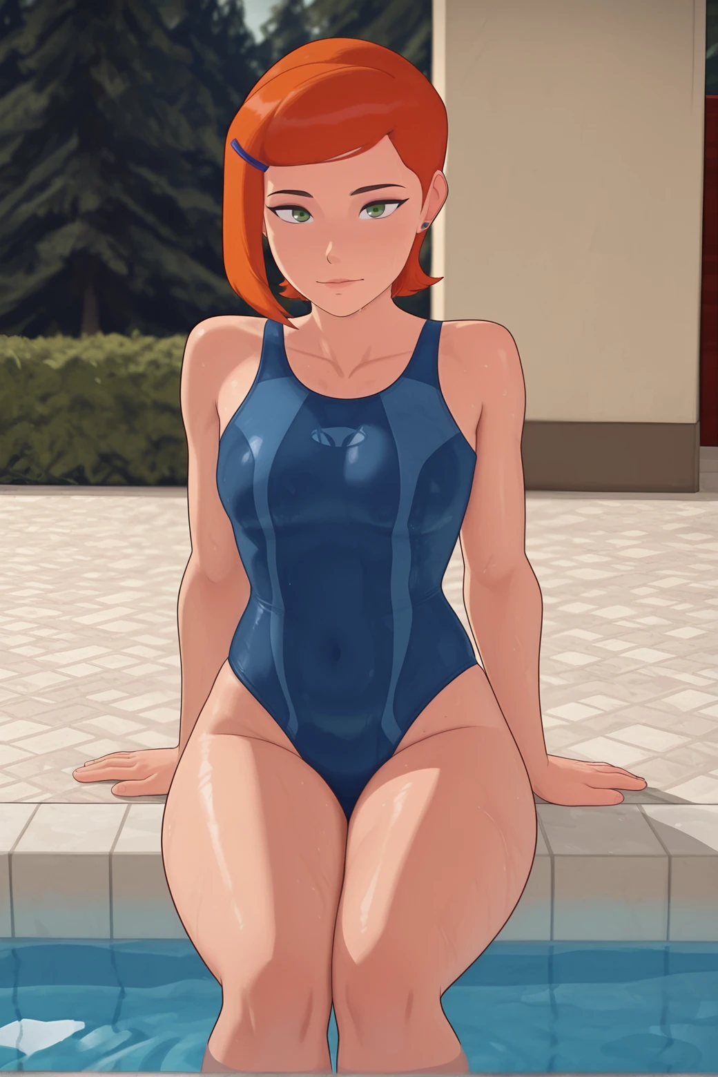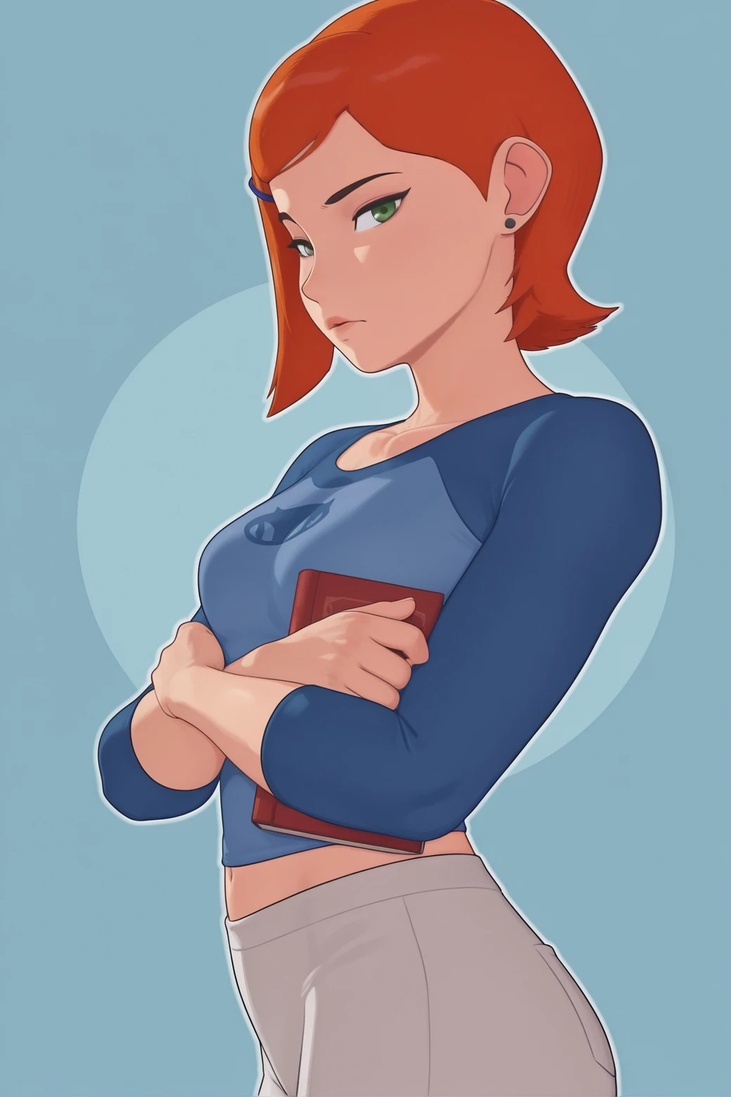 skuddbtt_gw3n01, mature female, not furry, green eyes, female, solo, human, eyelashes, red hair, medium breasts, swept bangs, hairclip, blue shirt, white pants,
