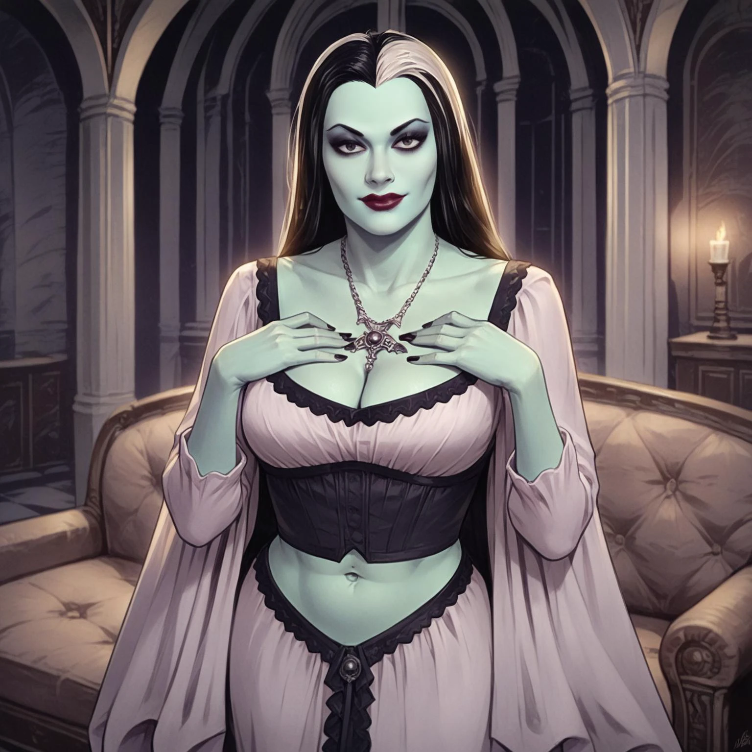 xmunsterx, black hair, long hair, makeup, lipstick, multicolored hair, colored skin, necklace