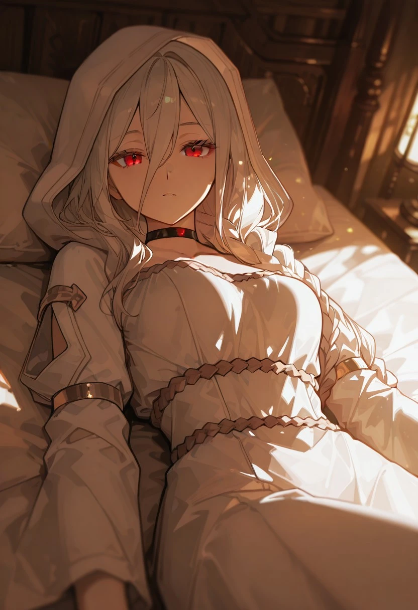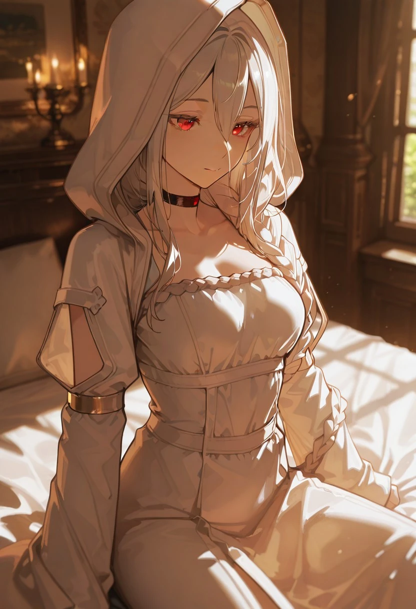 Shiraori, red eyes, hood, white dress, long hair, choker, hair between eyes