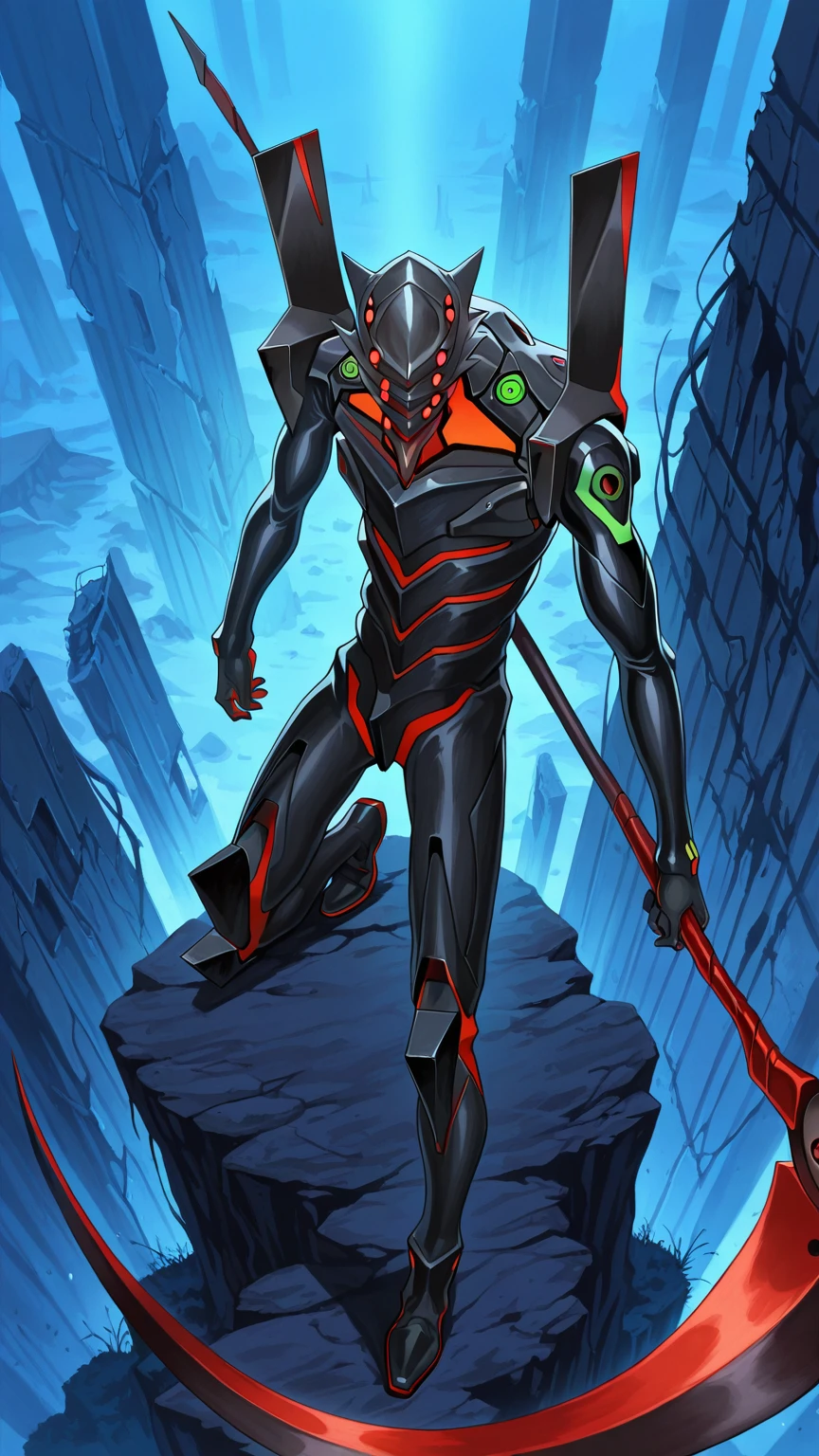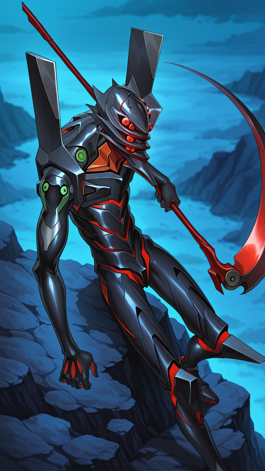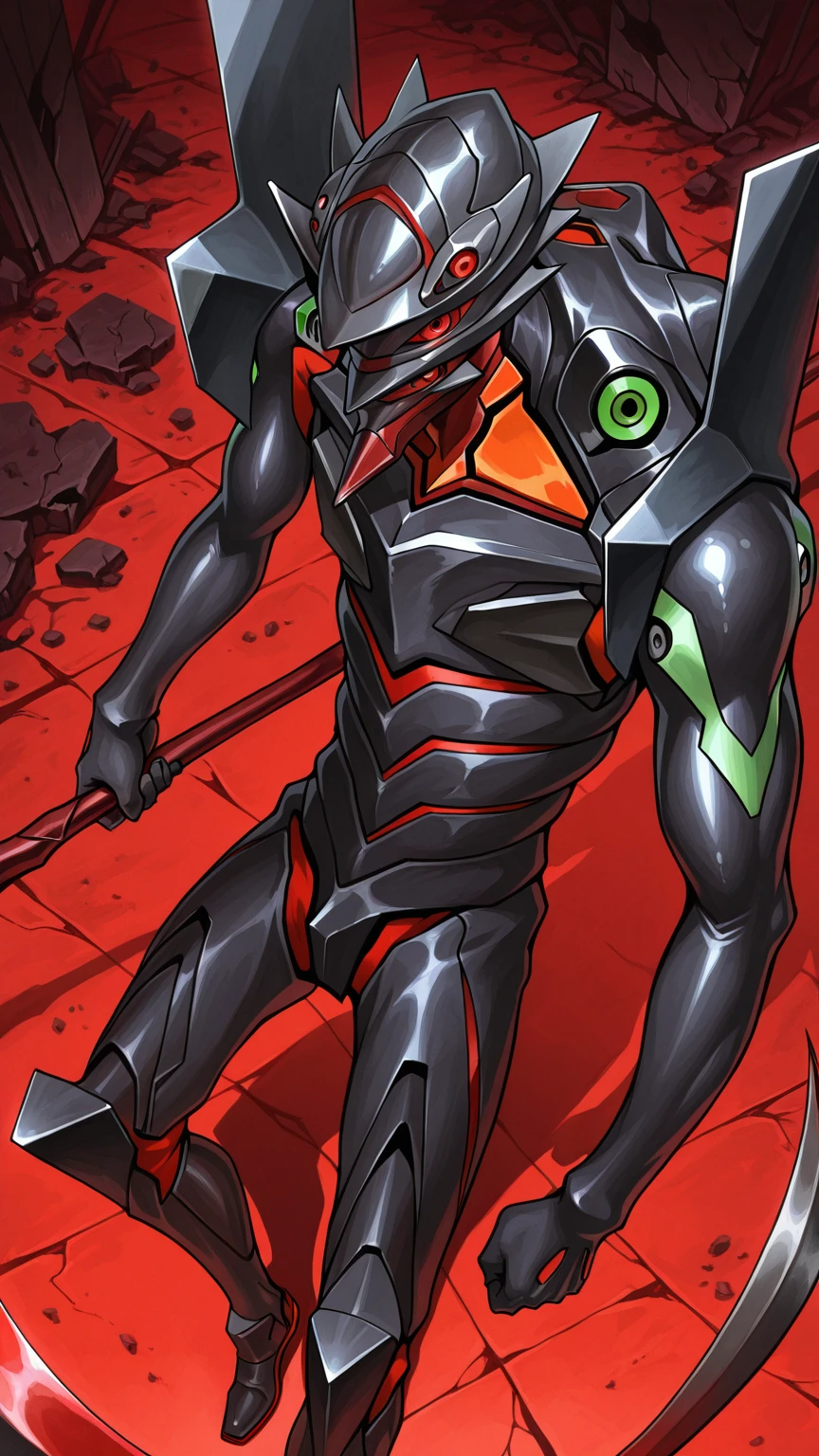 Mark9, evangelion unit, cyborg, Black armor, leg armor, arm armor, red scythe, glowing eyes, multiple eyes