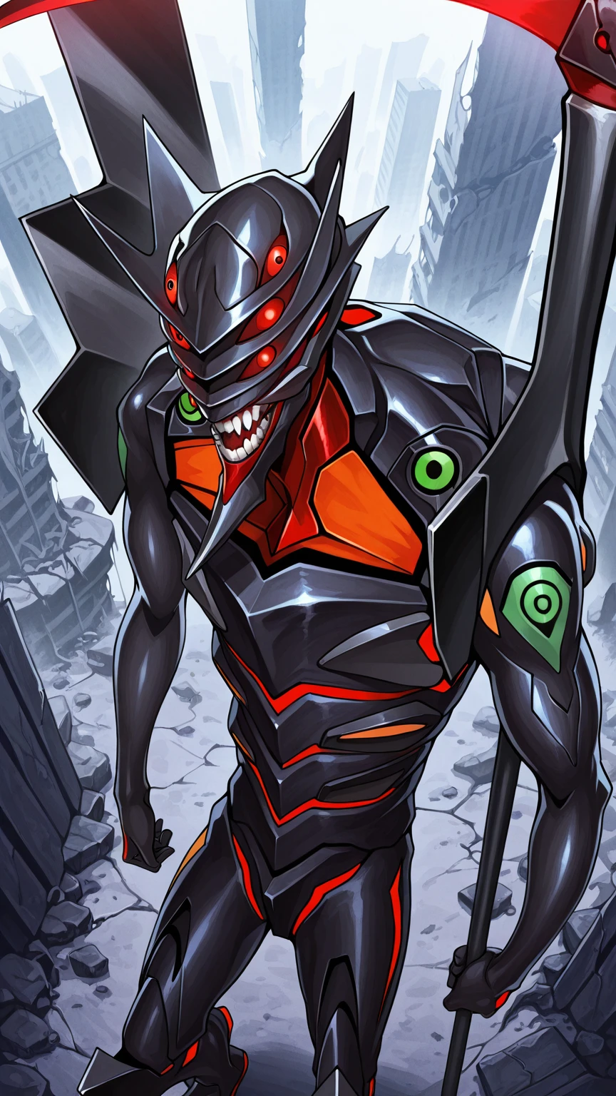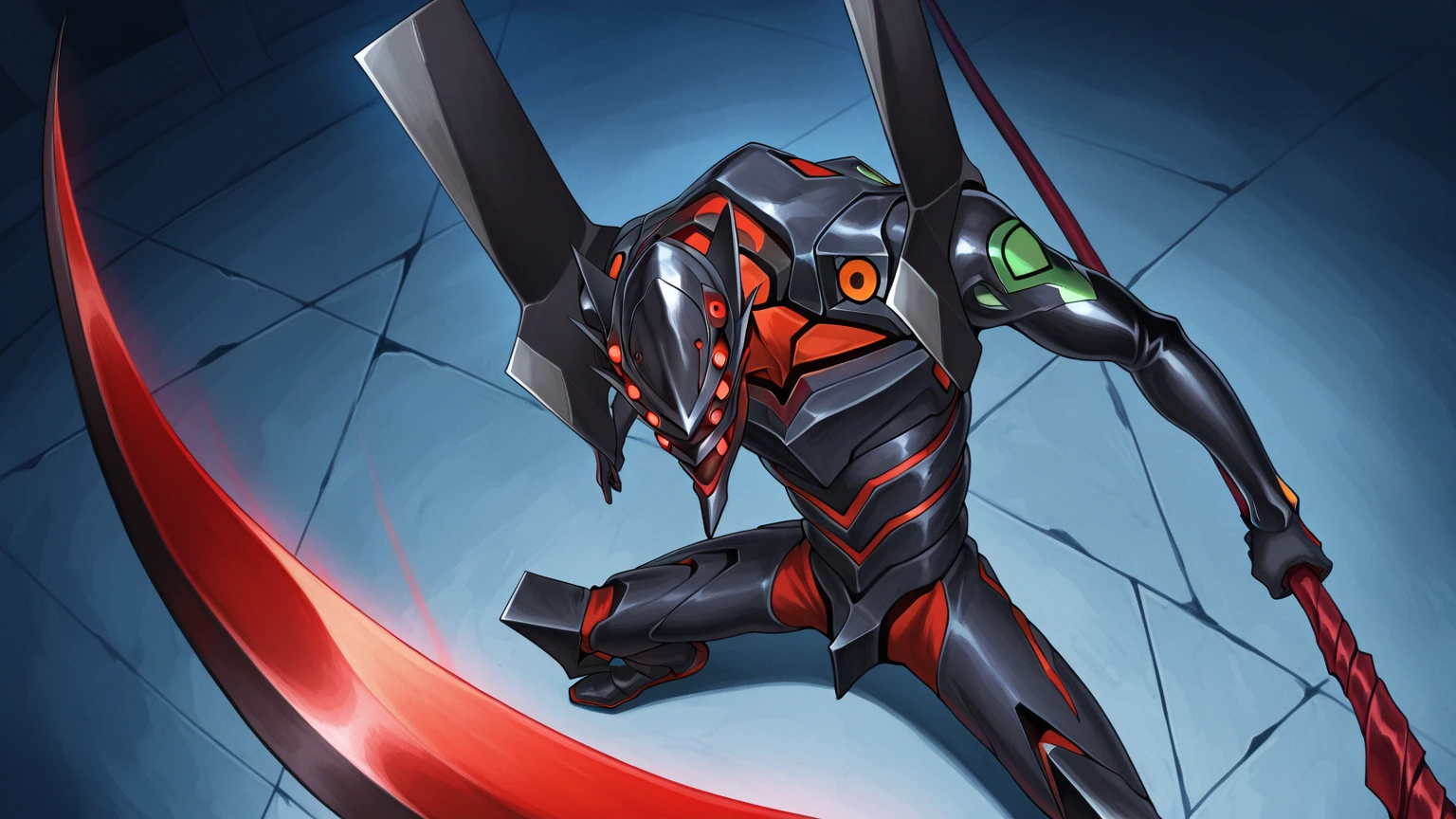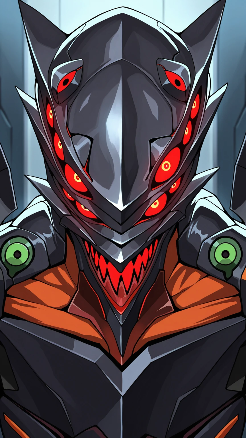 Mark9, evangelion unit, cyborg, Black armor, leg armor, arm armor, red scythe, glowing eyes, multiple eyes