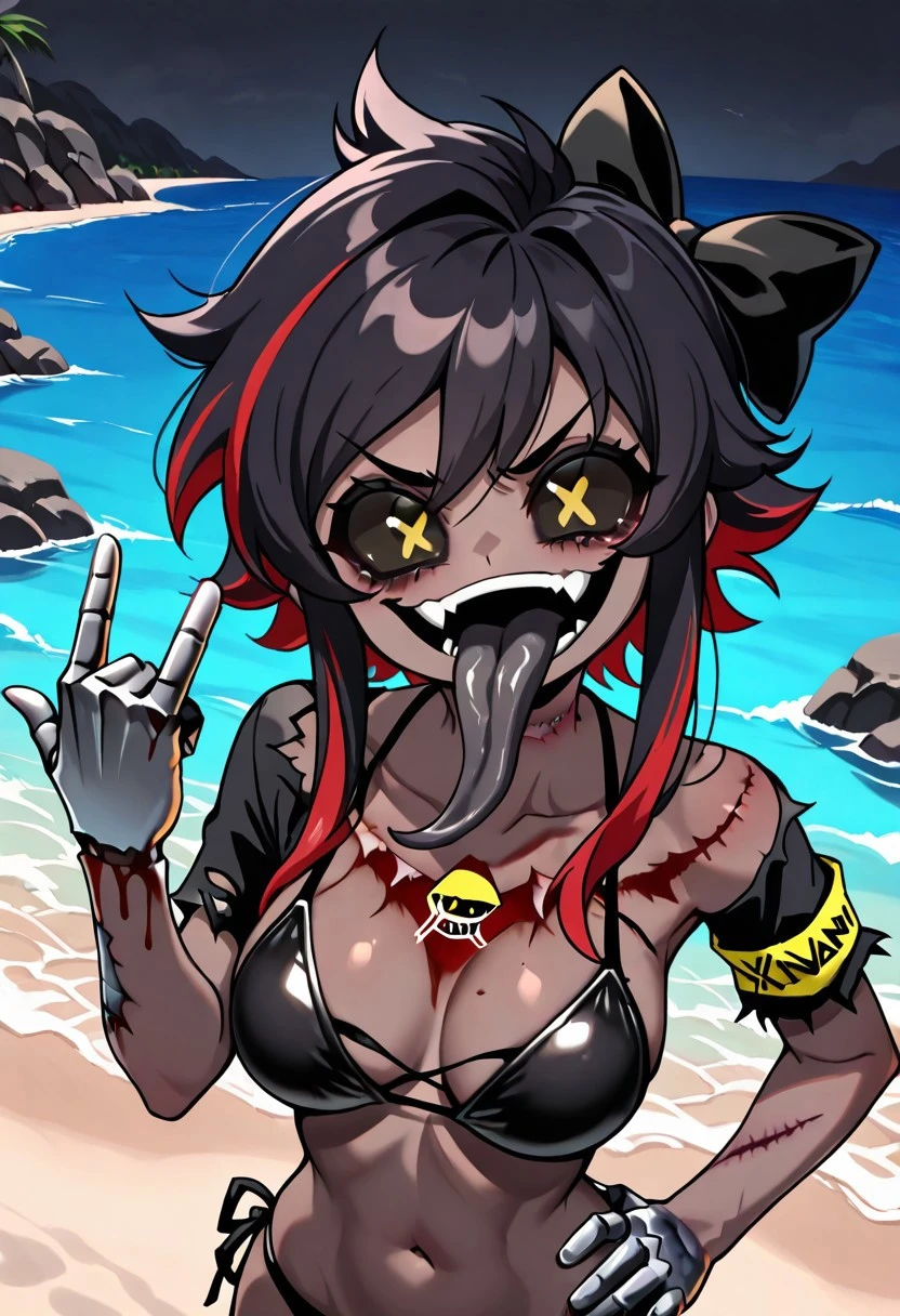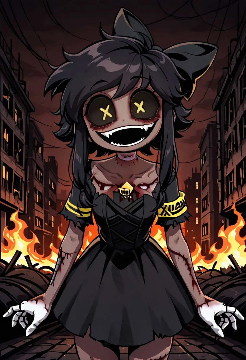 Prompts: CTessaMD, 1girl, solo, dark hair (brown or black depending on preference), yellow eyes, + +, x pupils, black sclera, dark skin, sidelocks, hair bow, chest mark, dress, high heels, fangs, grin, cracked skin, scar, blood, horror (theme), torn clothes, armband.