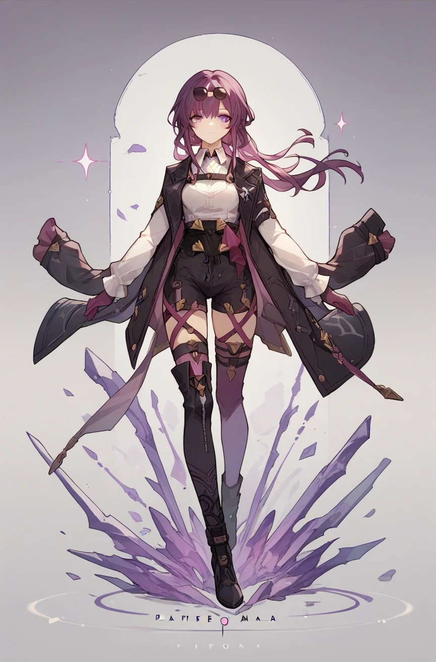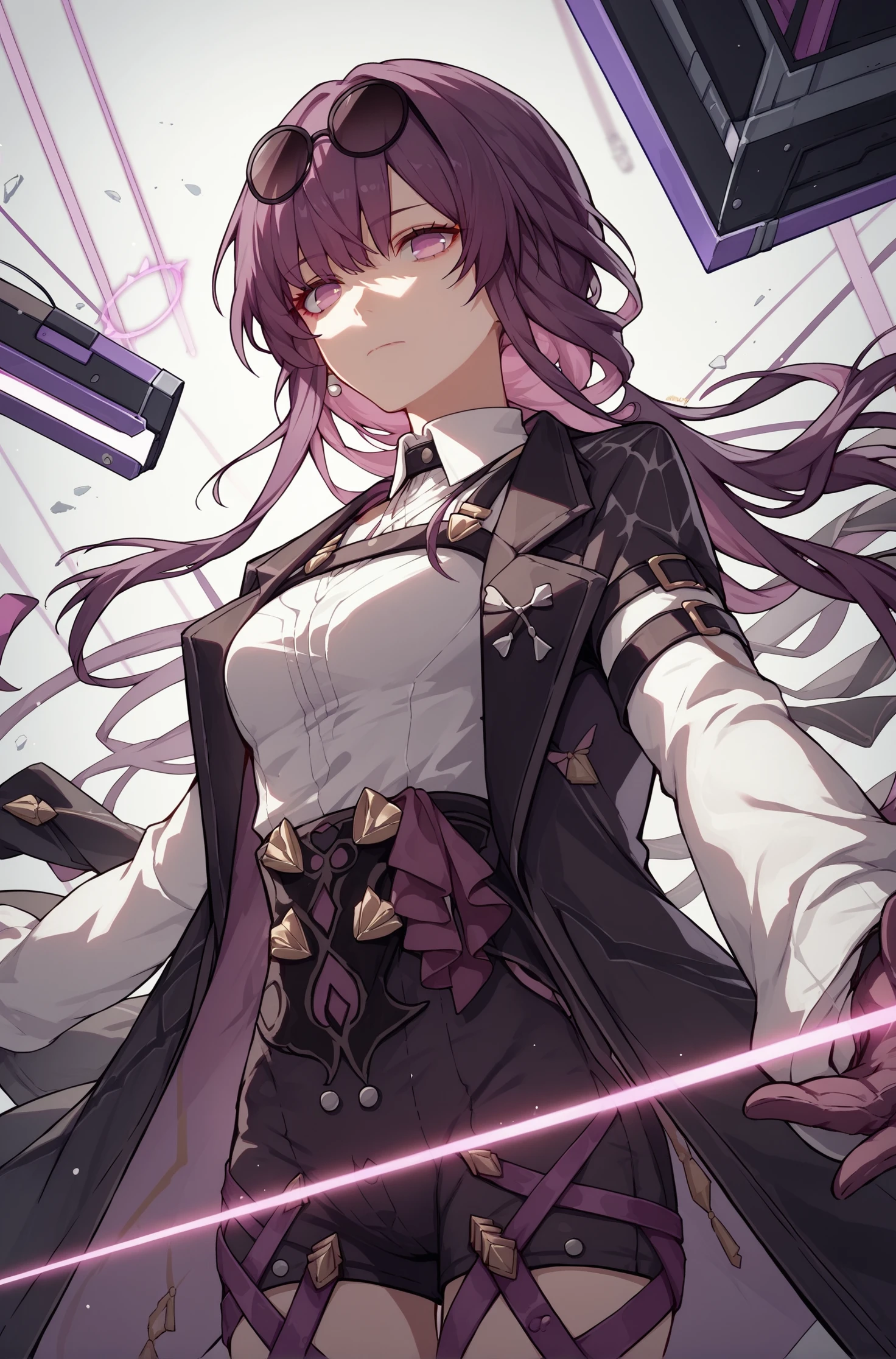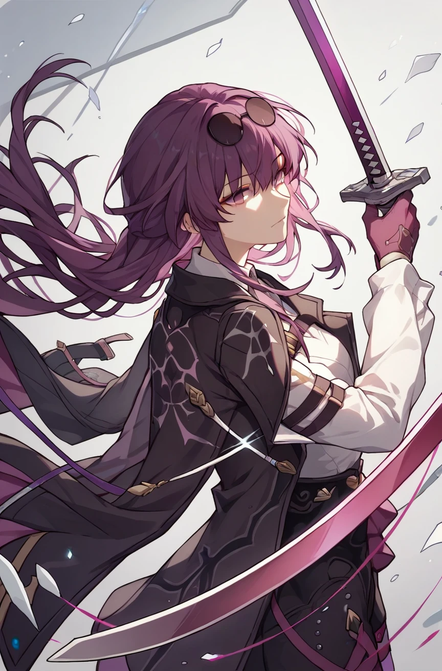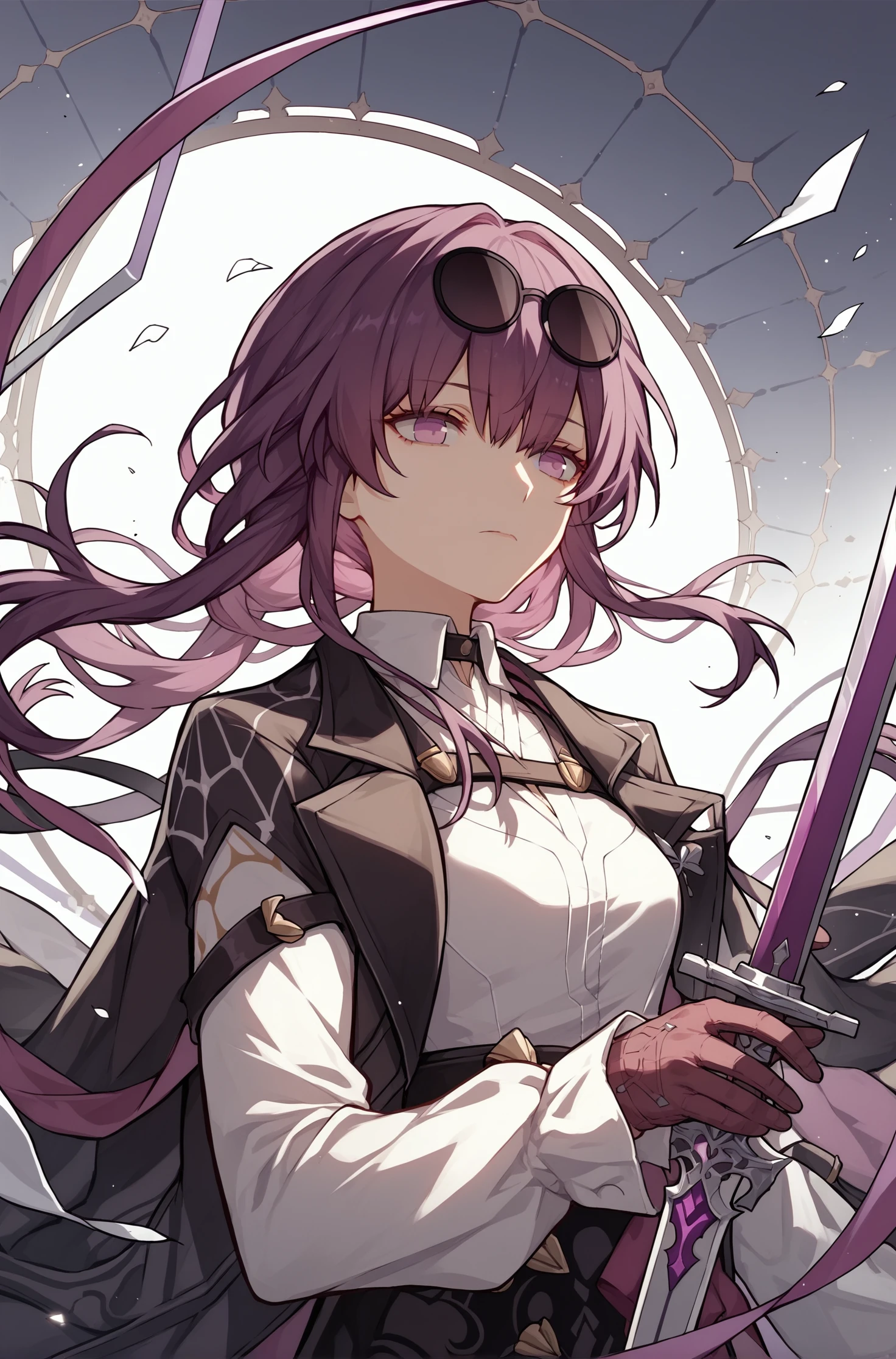 Additional tags: 1girl, white shirt, bangs, sunglasses, eyewear on head, purple hair, white long sleeves, purple eyes, long hair, closed mouth, black jacket, gloves,