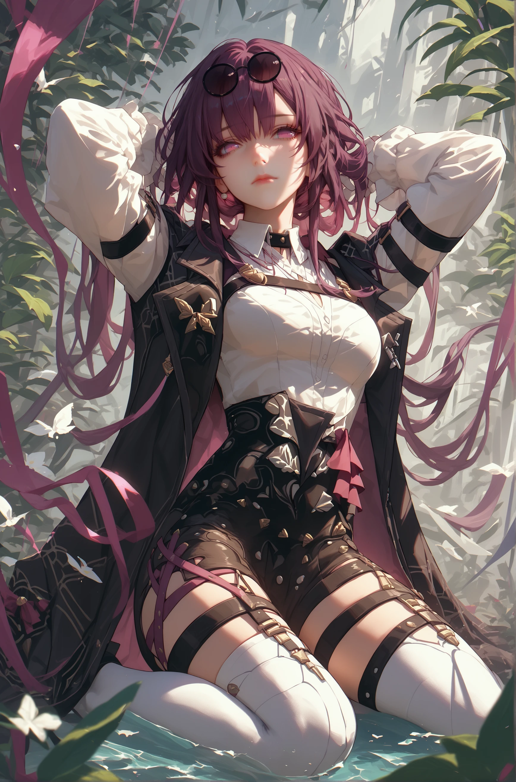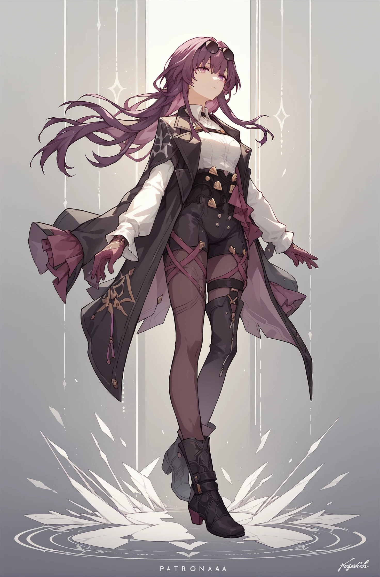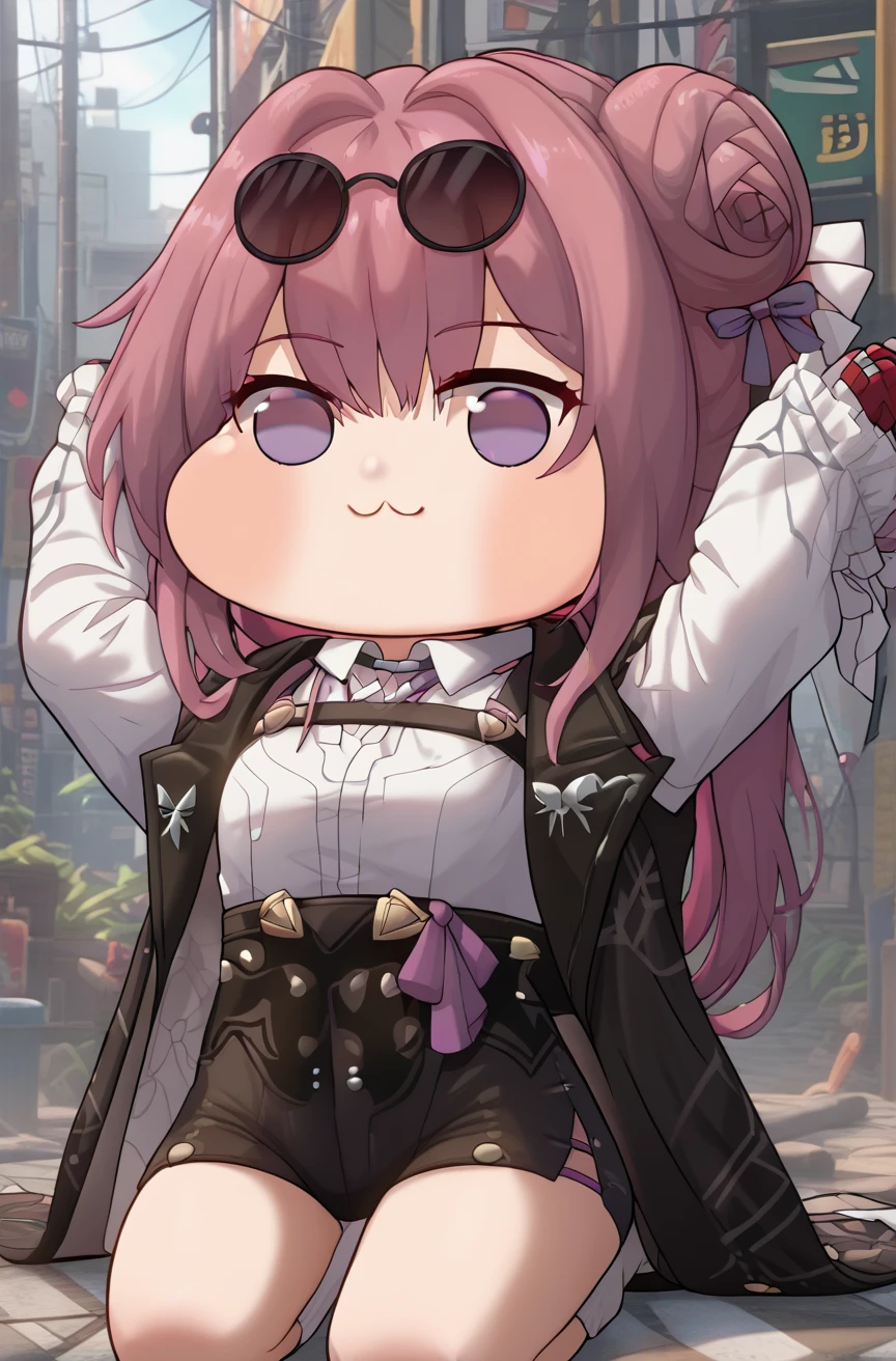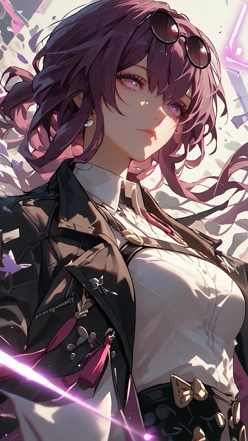 Additional tags: 1girl, white shirt, bangs, sunglasses, eyewear on head, purple hair, white long sleeves, purple eyes, long hair, closed mouth, black jacket, gloves,