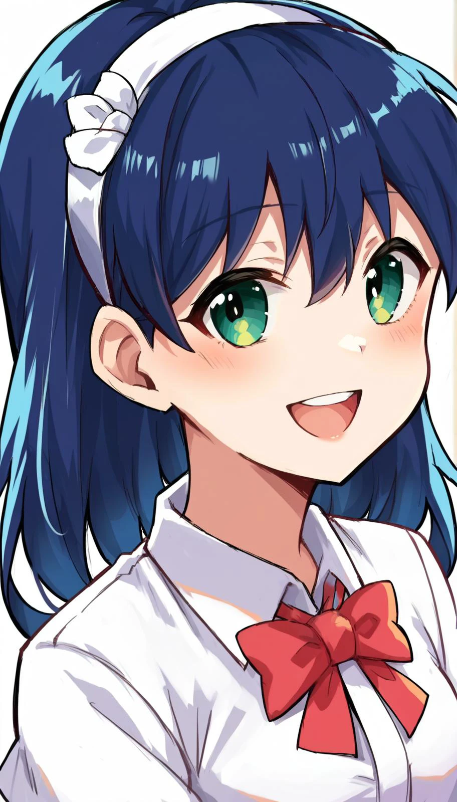 shiiho, dark blue hair, green eyes, white headband, white hair ribbon, breasts