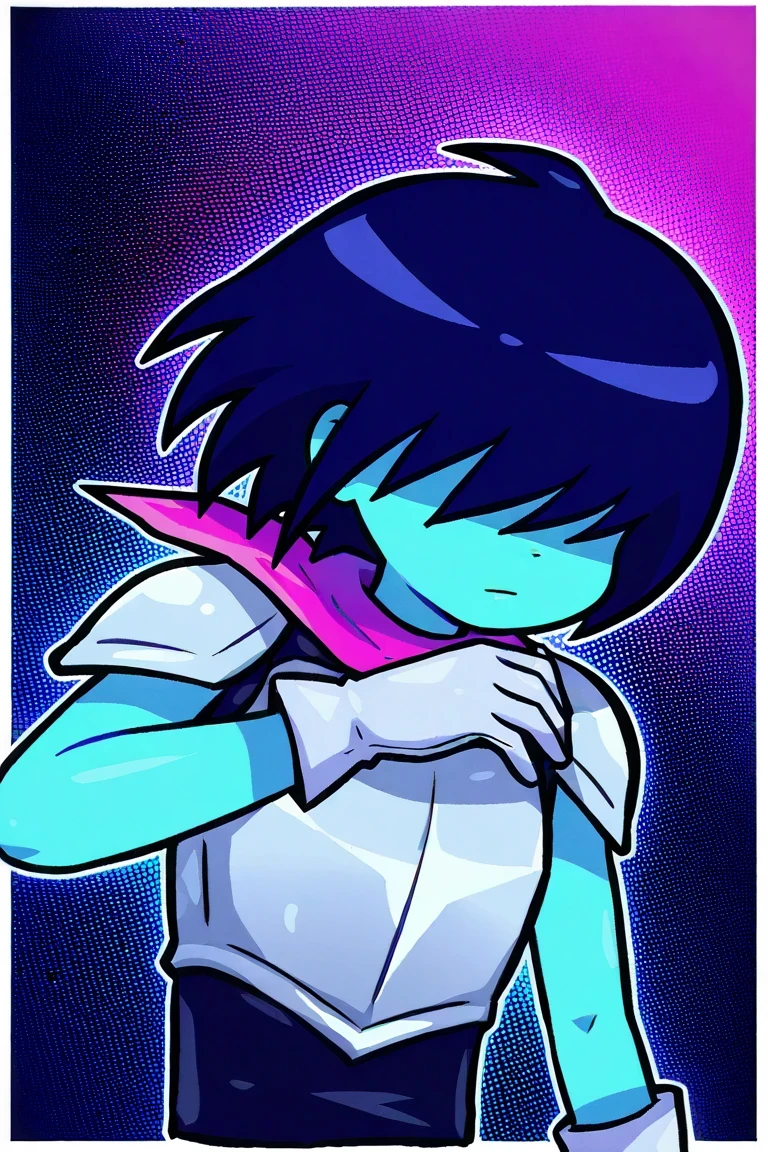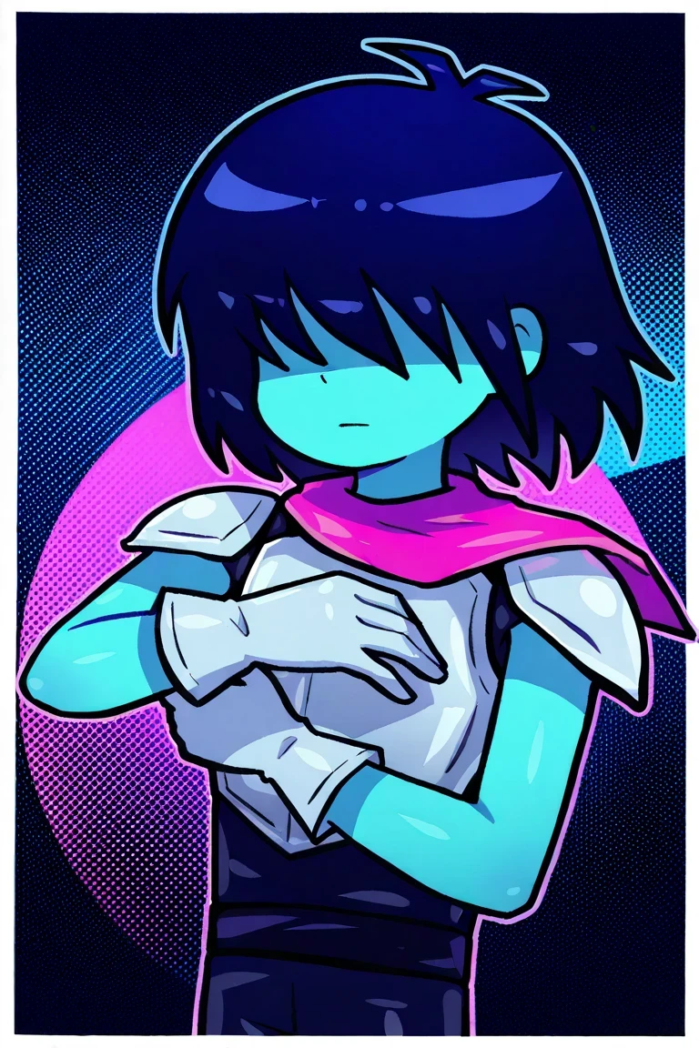 KrisFNF, blue skin, dark blue hair over eyes, silver armor, pink ribbon on neck, kris (deltarune),
