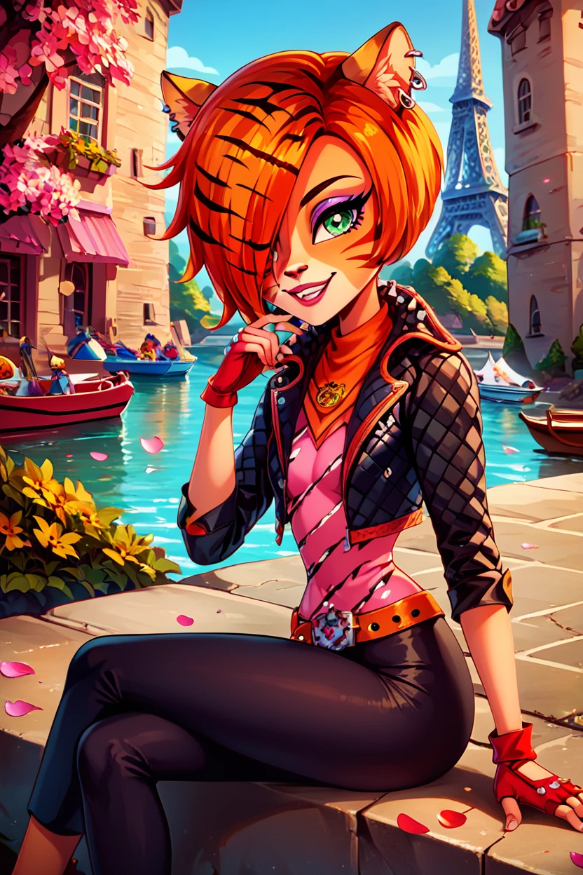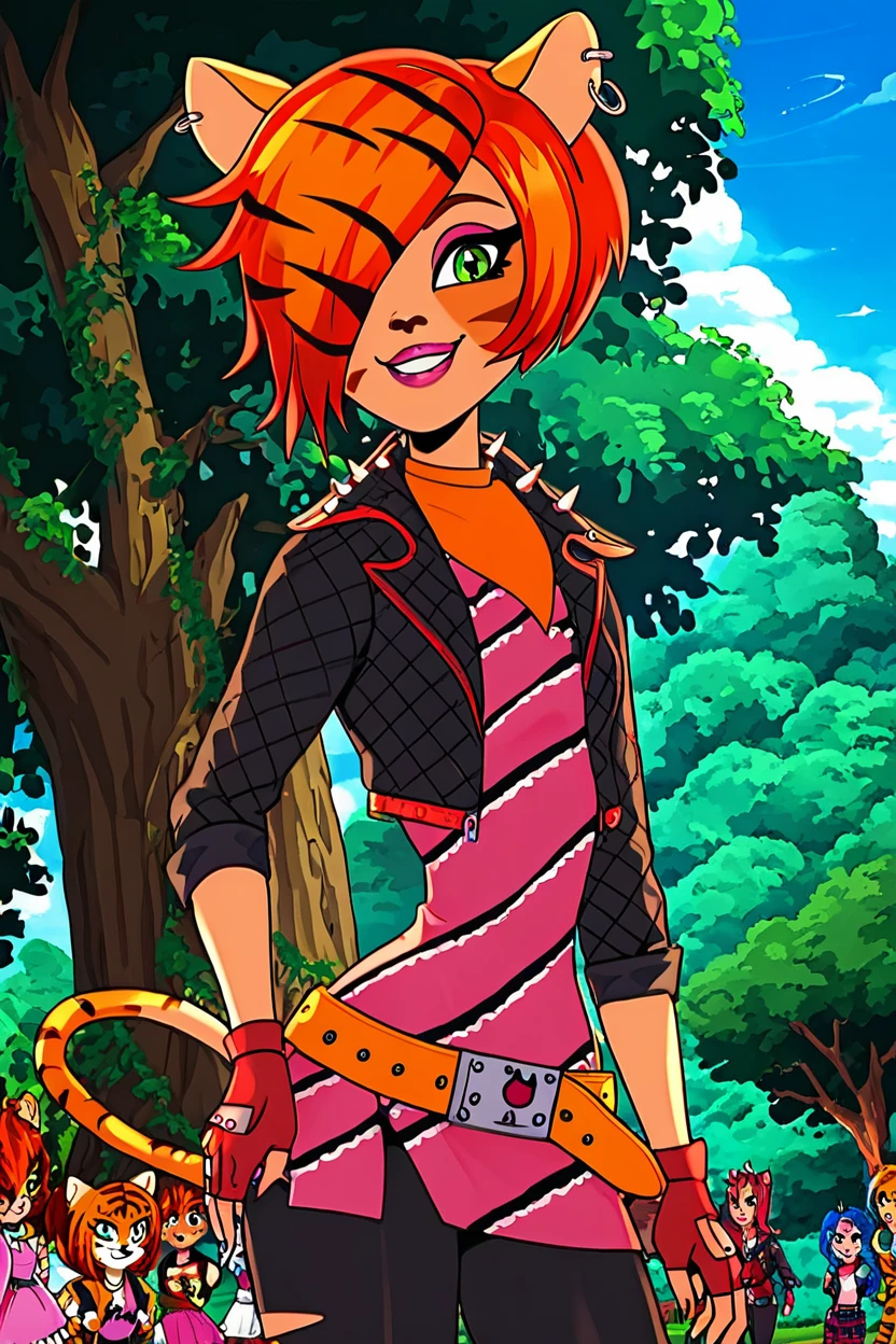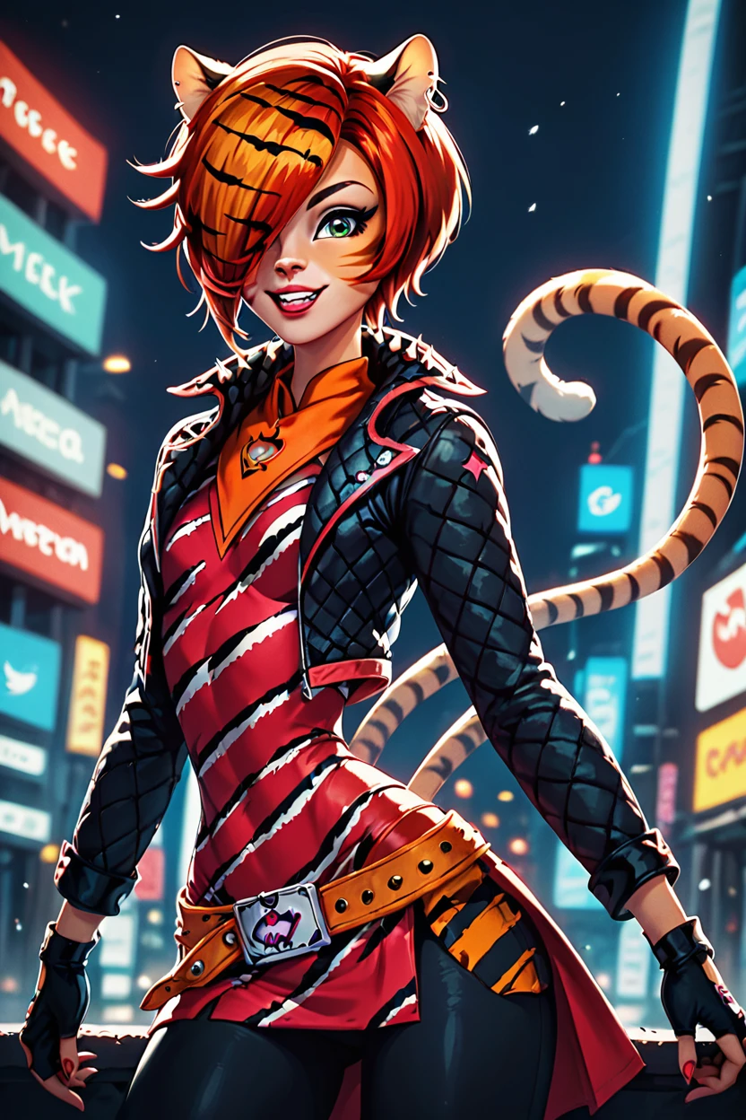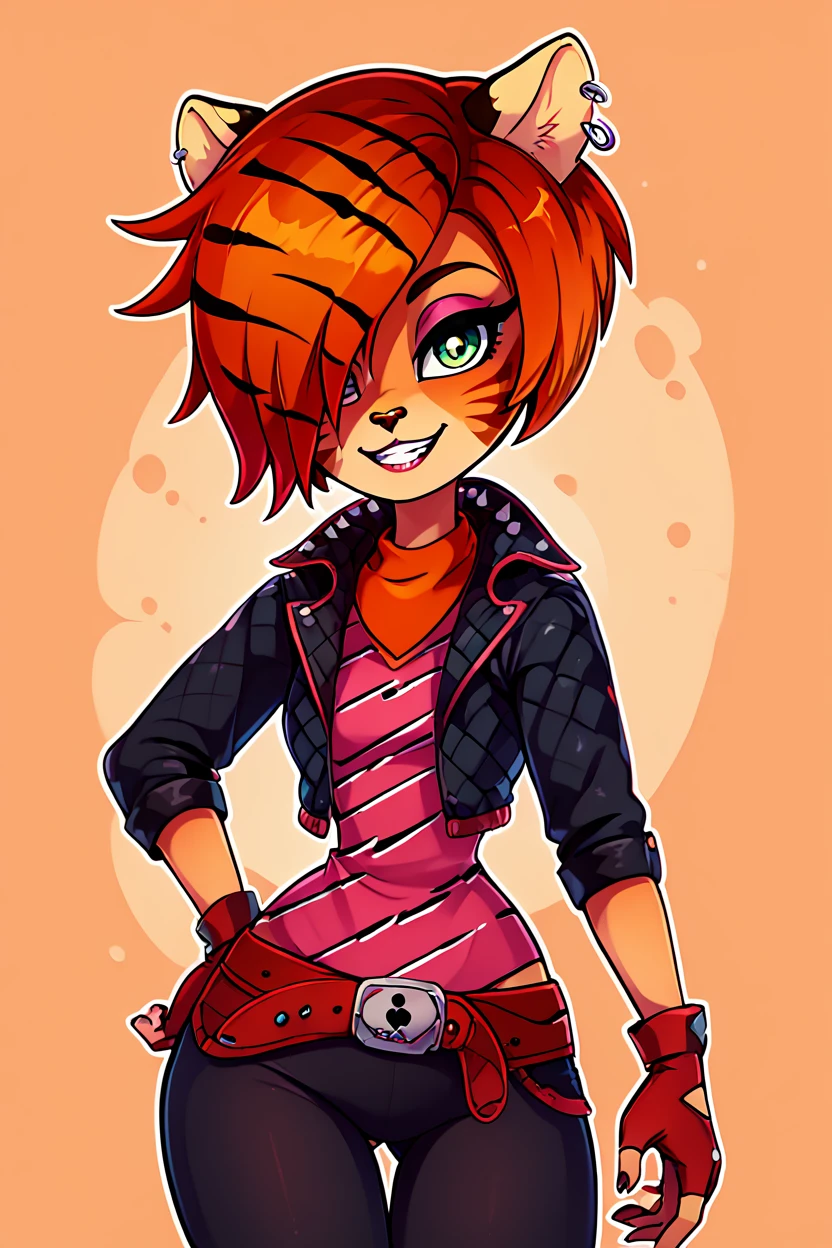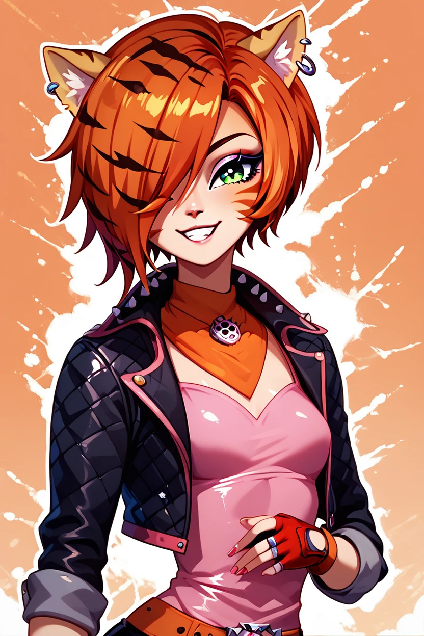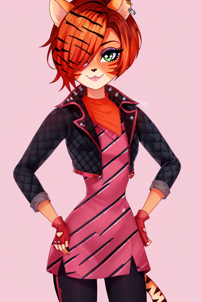 zzToralei, green eyes, cat ears, tiger ears, hair over one eye, brown hair, multicolored hair, orange hair, red hair, short hair, whisker markings, facial mark, makeup, gloves, jewelry, jacket, fingerless gloves, piercing, earrings, animal print, ear piercing, pink dress, black pants,