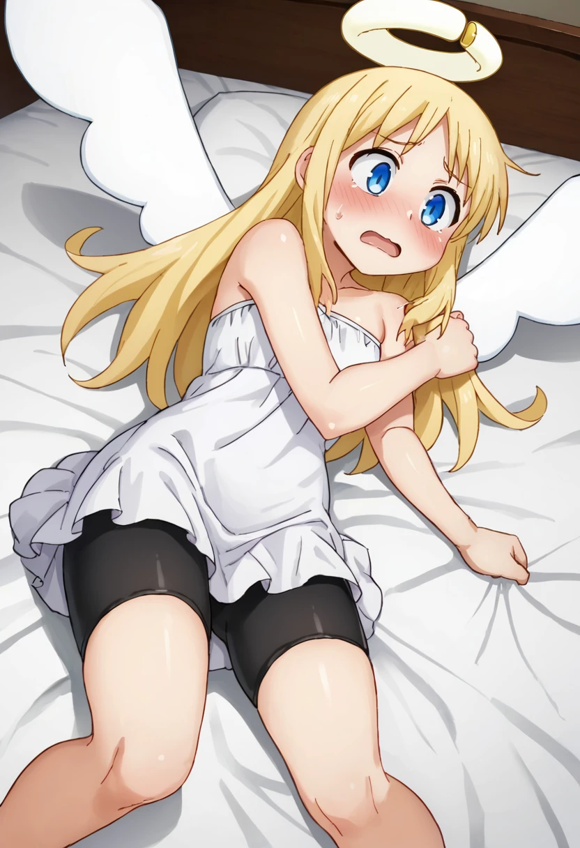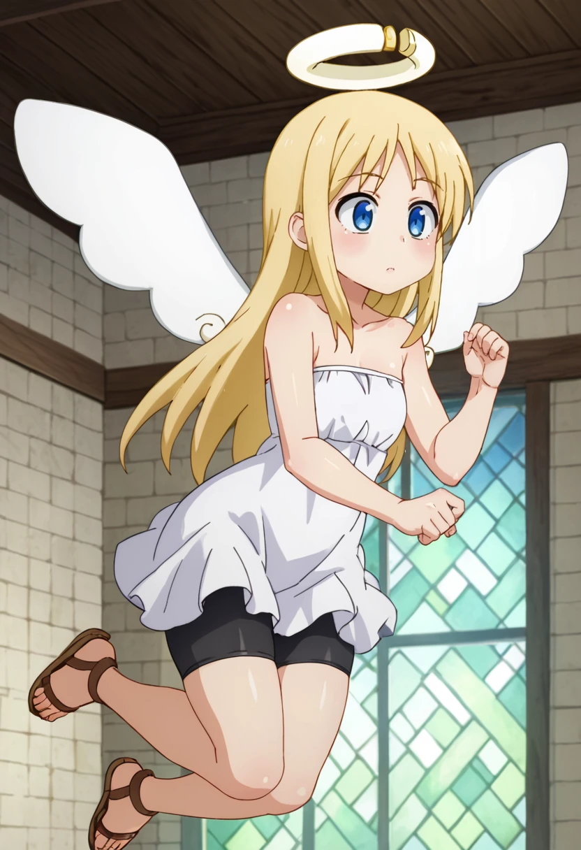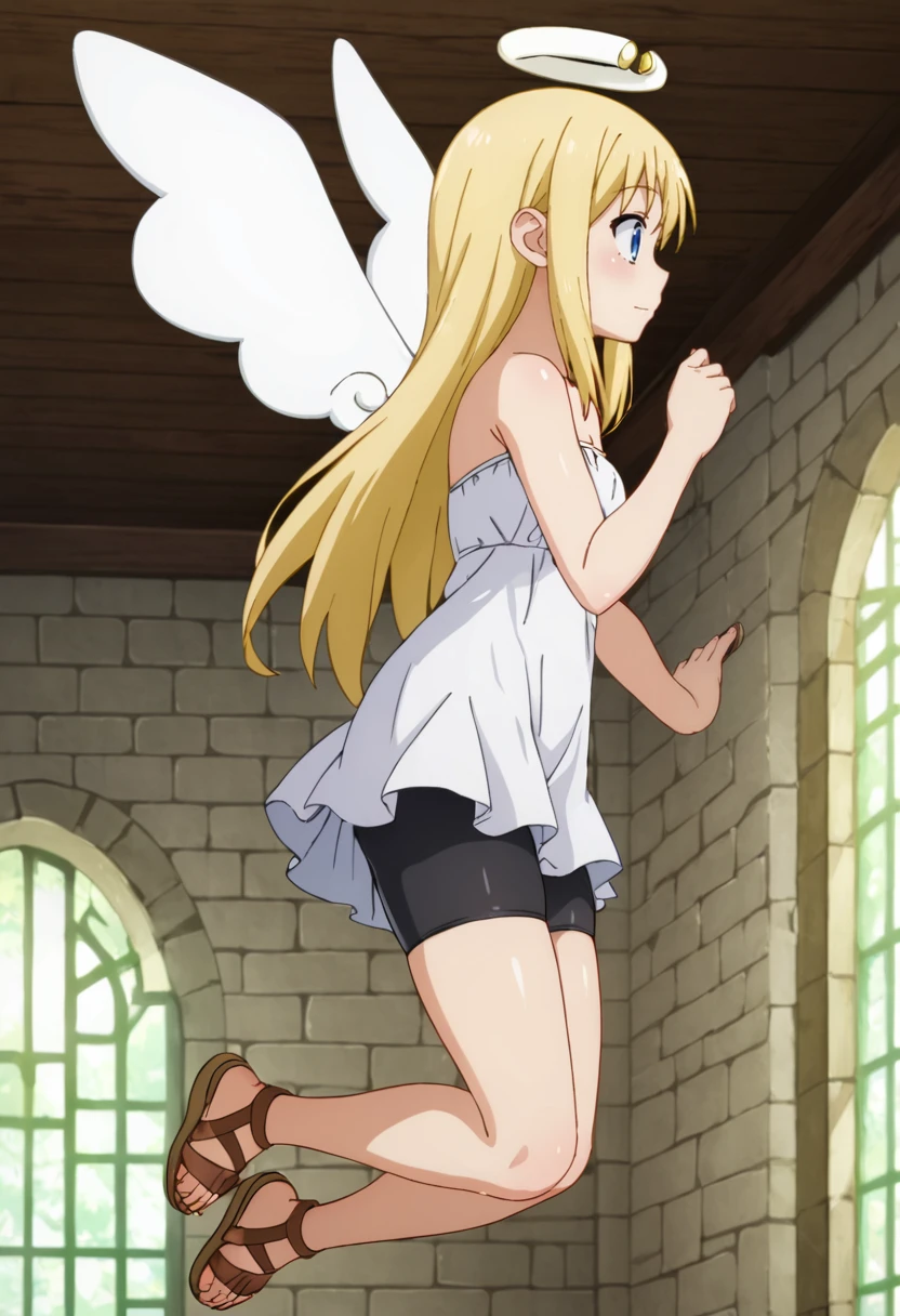 blue eyes,blonde hair,long hair,angel,halo,wings,white dress,strapless,bare shoulders,bike shorts,sandals