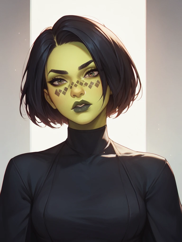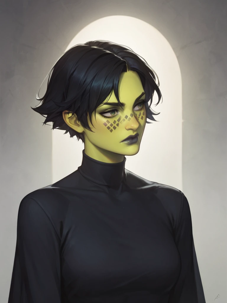 1girl, barissoffee, green skin, face_tattoos_around_nose, black robes