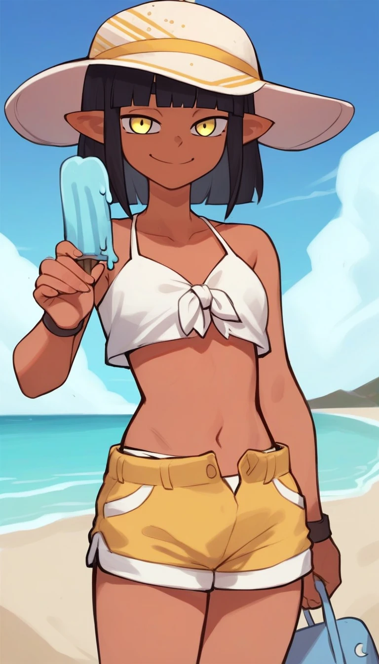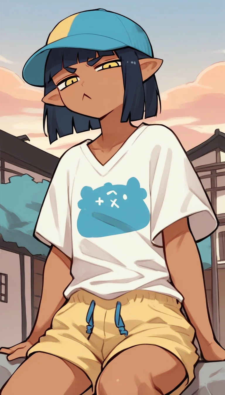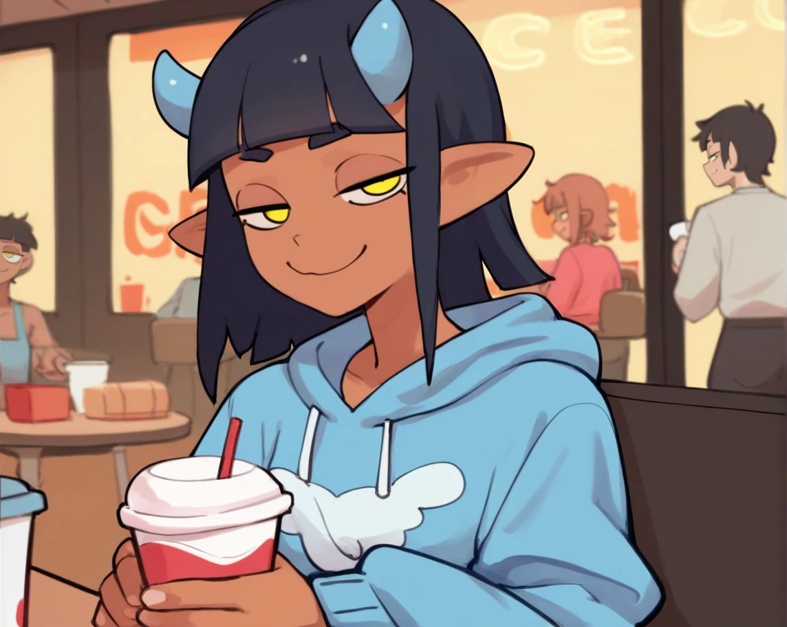 mephiacolo, dark skin, pointy ears, yellow eyes, black hair, blunt bangs, double hairbuns, blue devil horns, blue high leg leotard, devil tail, collar, bracelet, petite breasts,