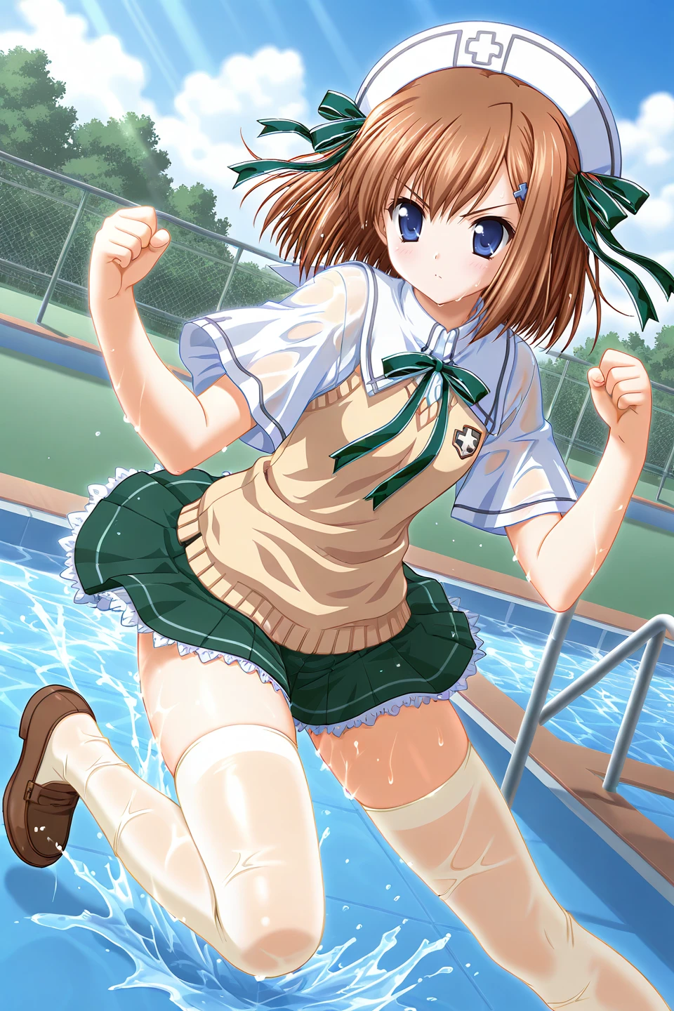 school uniform,turtleneck,neck ribbon,white sailor collar,yellow sweater vest,white shirt,short sleeves,cape sleeves,green skirt,miniskirt,pleated skirt,lace-trimmed skirt,petticoat,white thighhighs,yellow thighhighs,loafers,brown footwear,