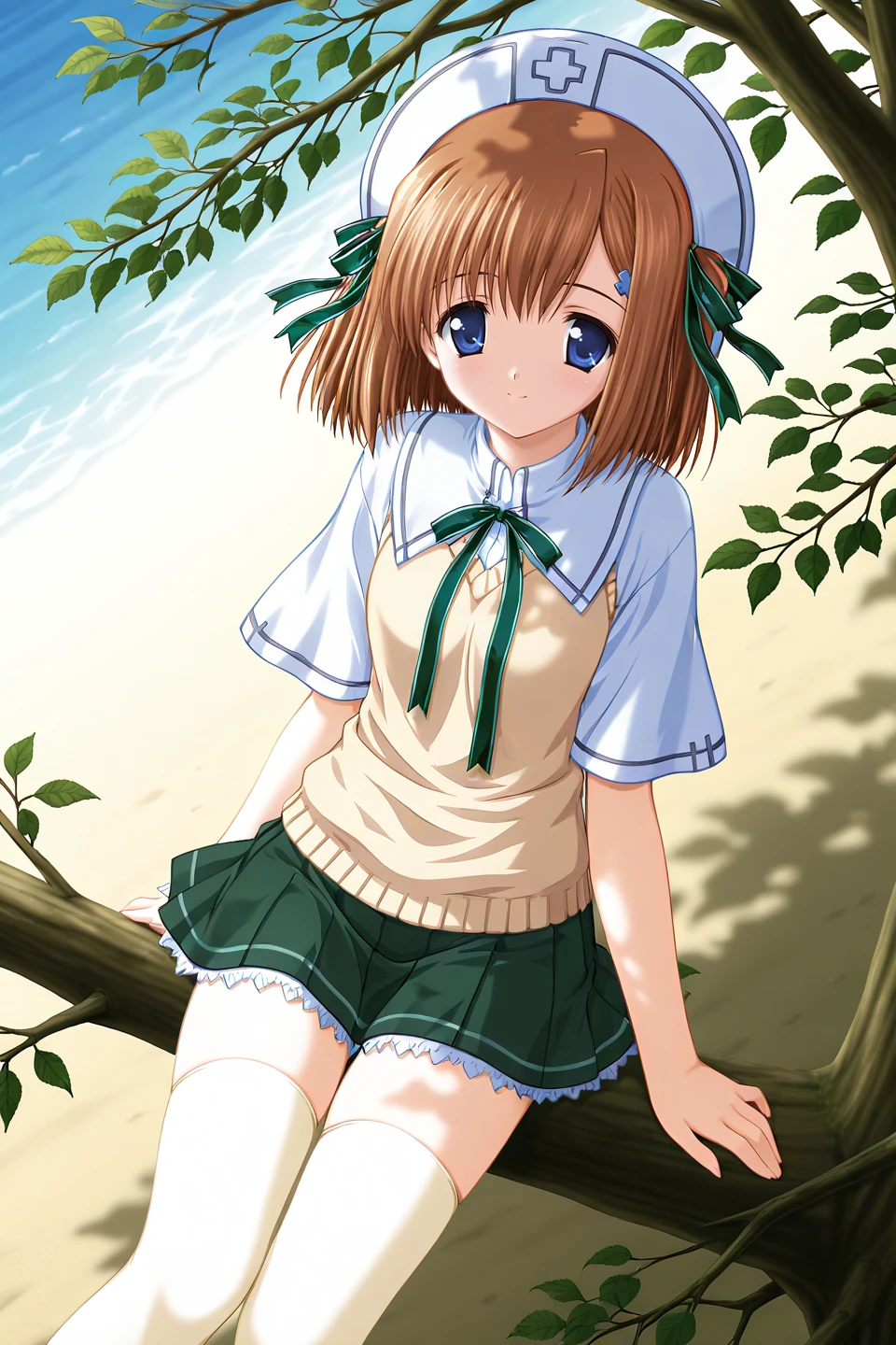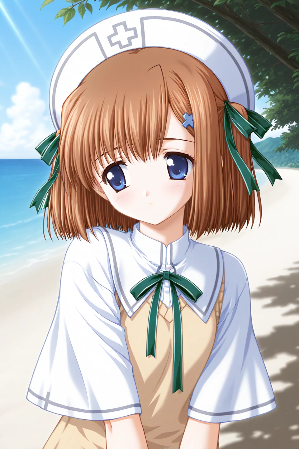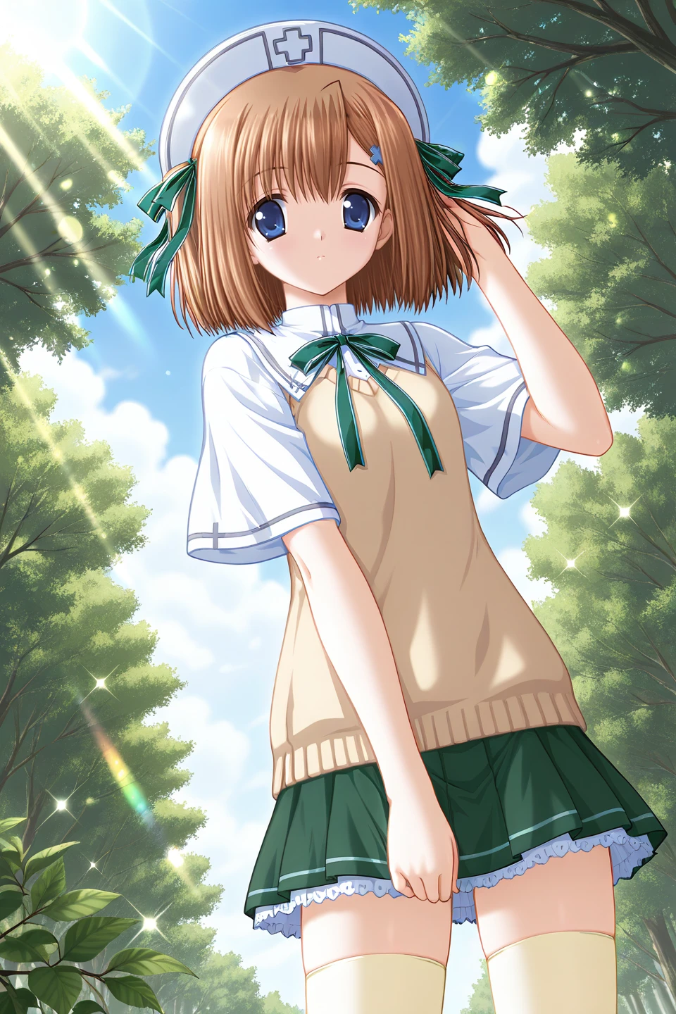katoh nagomi,blue eyes,brown hair,medium hair,parted bangs,two side up,hair ribbon,green ribbon,cross hair ornament,petite,