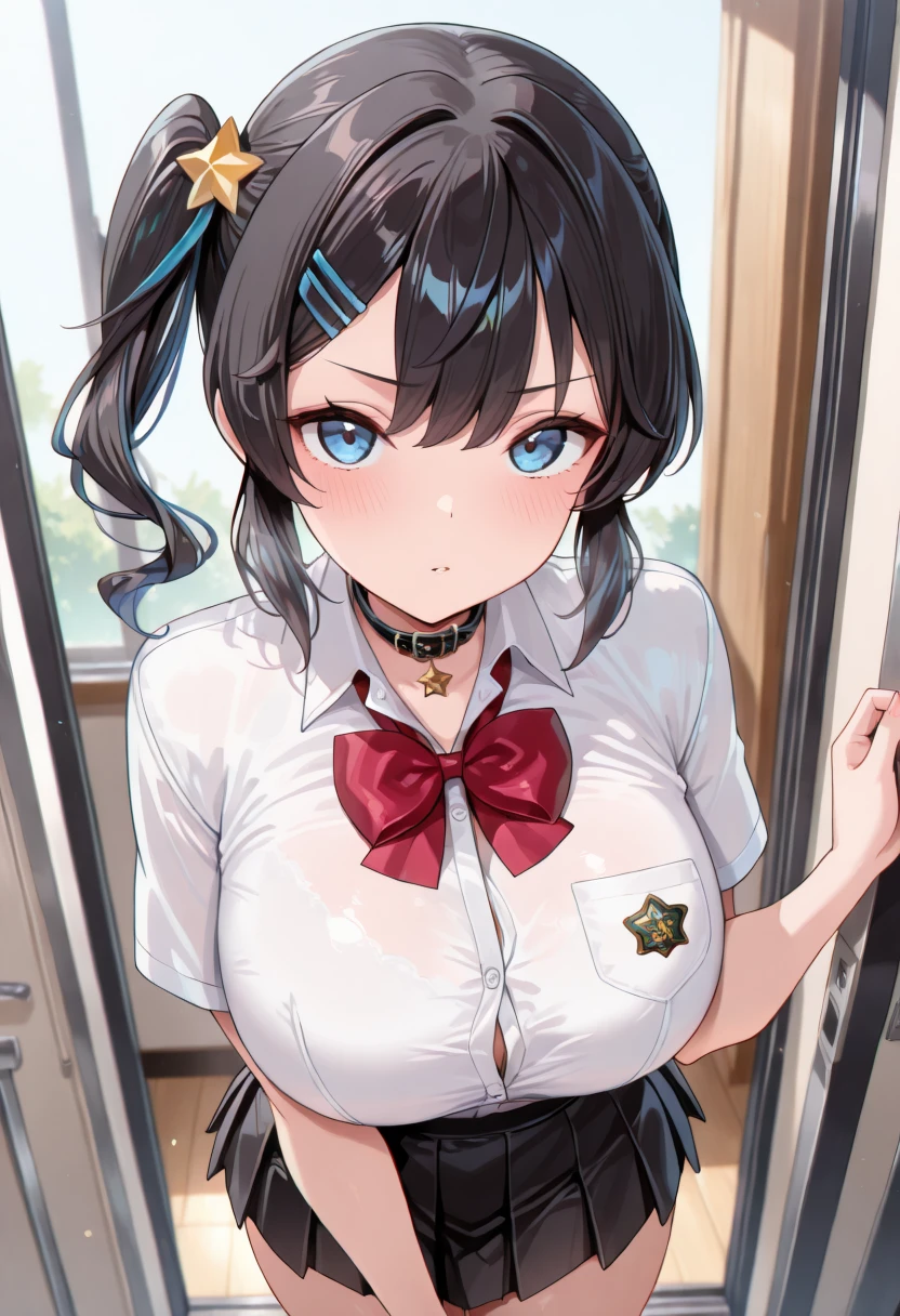 kaorunatsume_normal_ver, skirt, hair ornament, red bow, blue eyes, black hair, side ponytail, bow, red bowtie, hairclip, shirt, bangs, bowtie, white shirt, black skirt, pleated skirt, school uniform, short sleeves, collar, star \(symbol\), star hair ornament, collared shirt,
