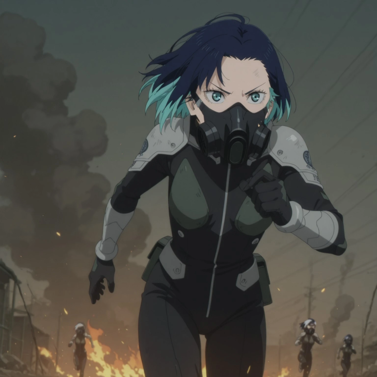Additional tags: gas mask, gattling gun, anime screencap,