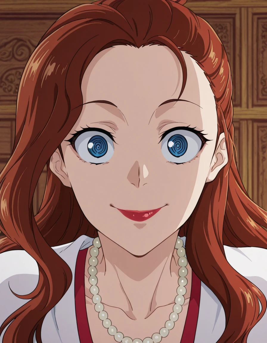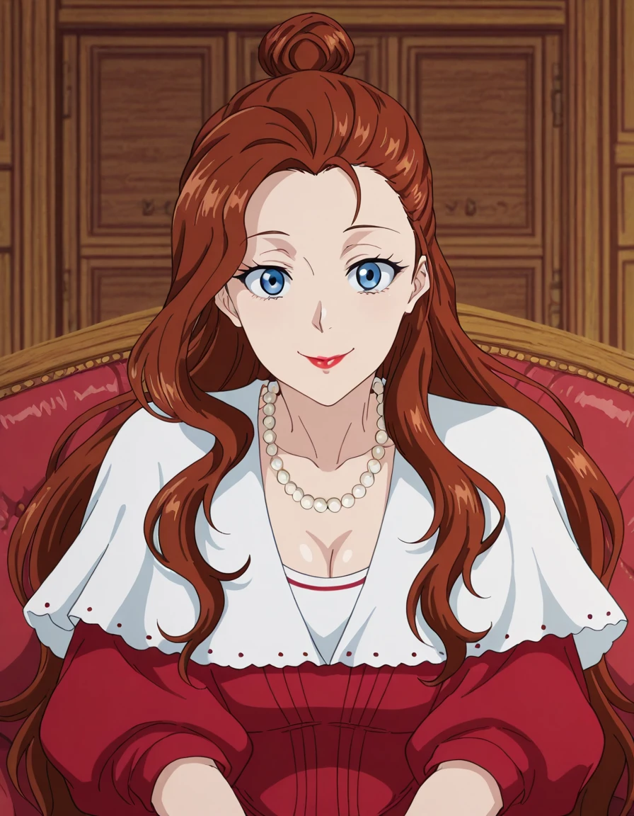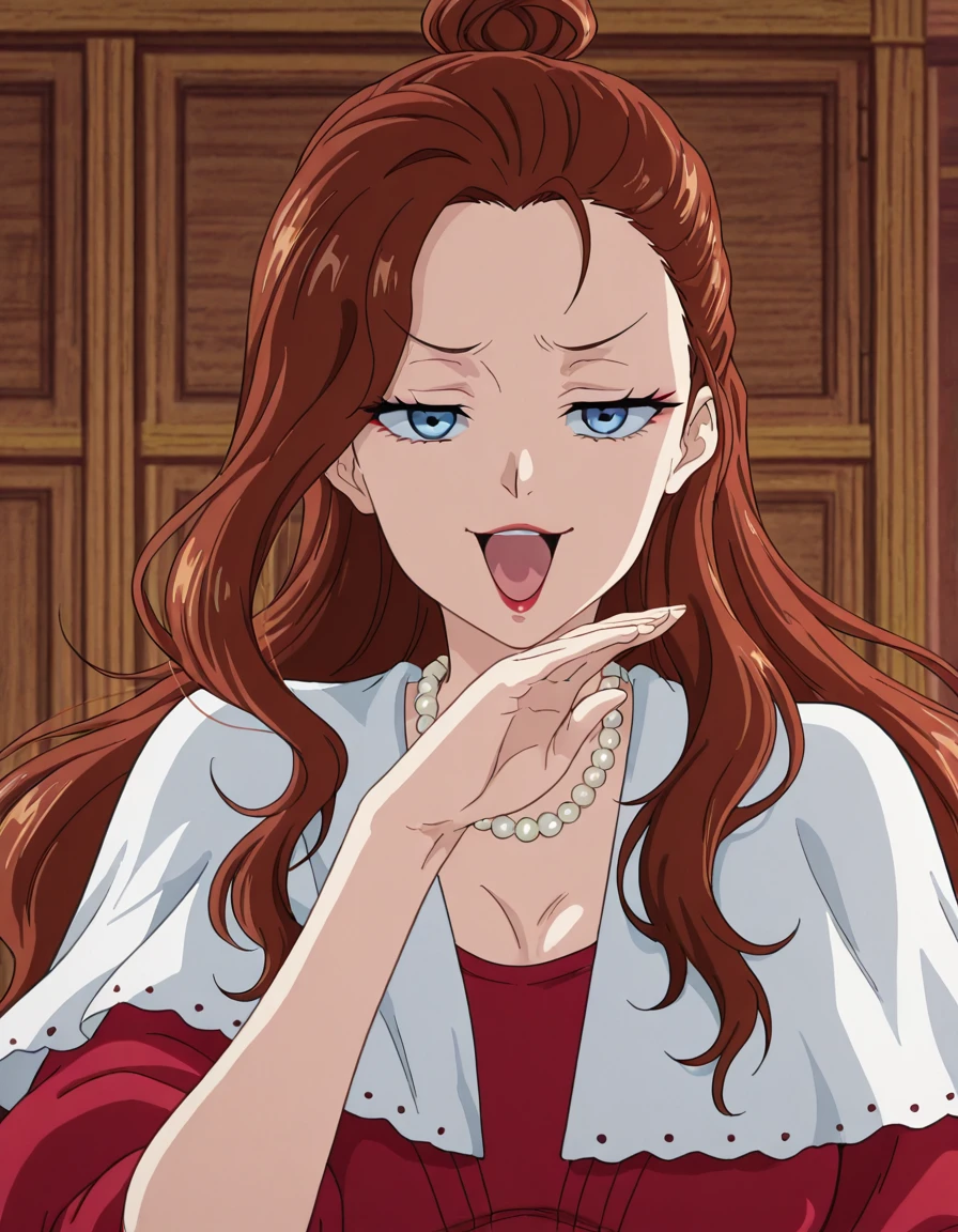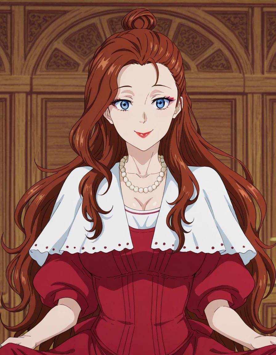 tondemomarie, brown hair, very long hair, single hair bun, blue eyes, lipstick, makeup, pearl necklace, red dress, white capelet
