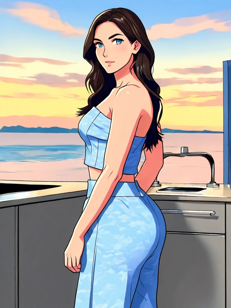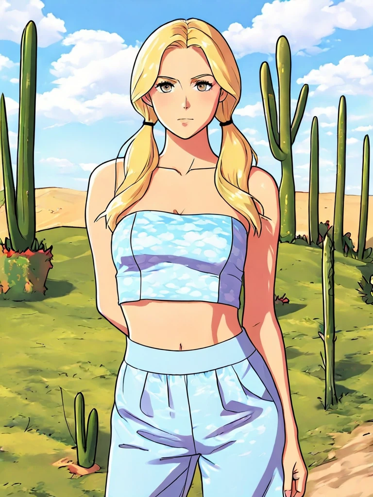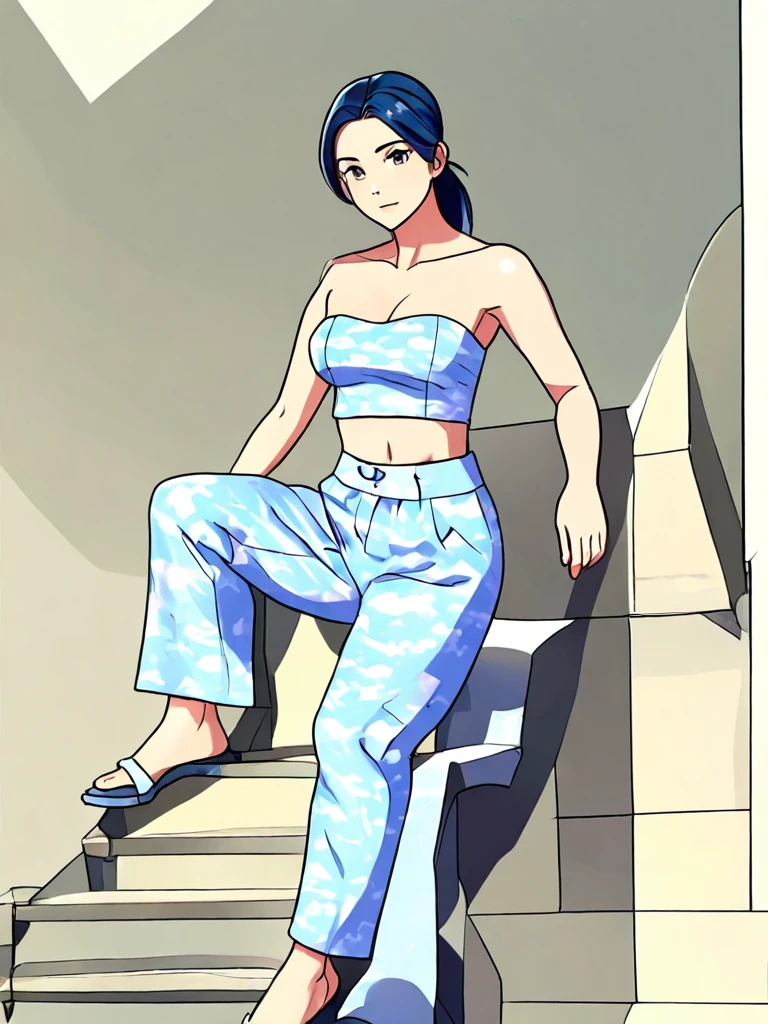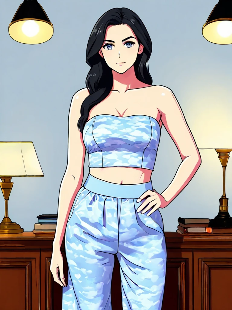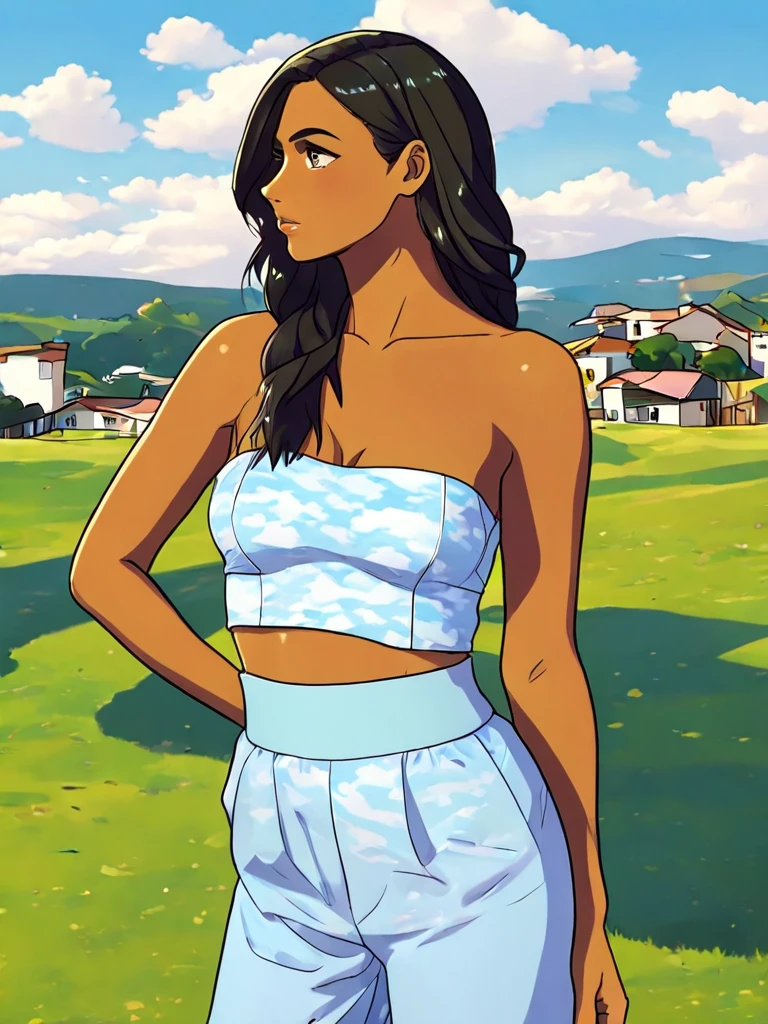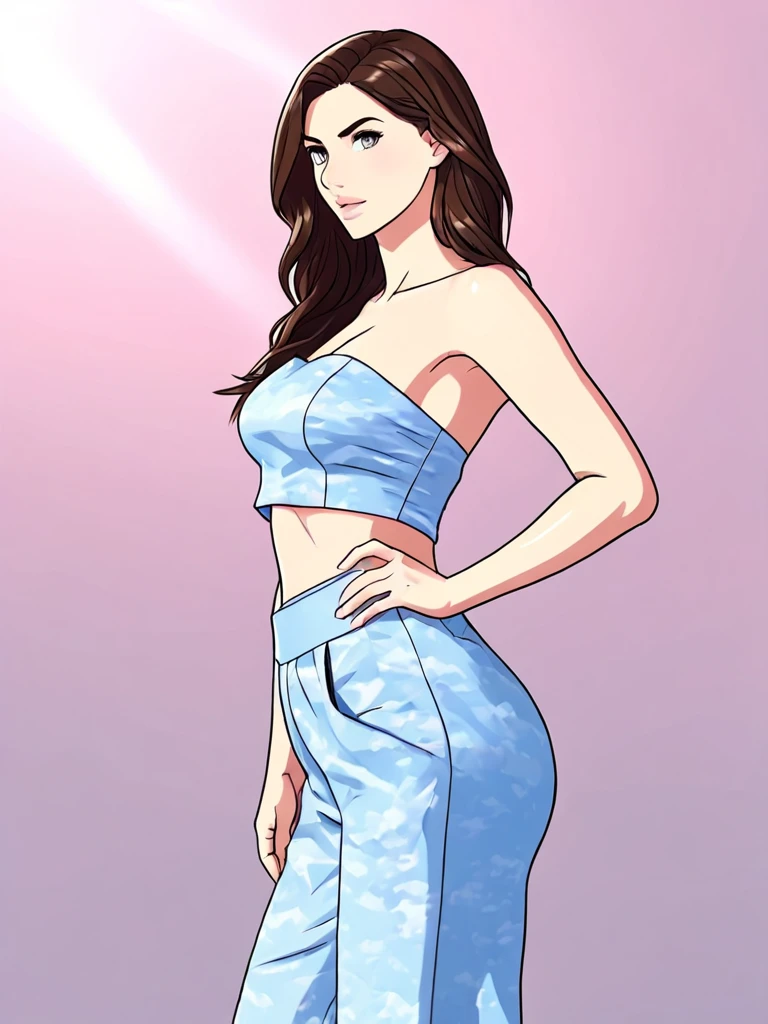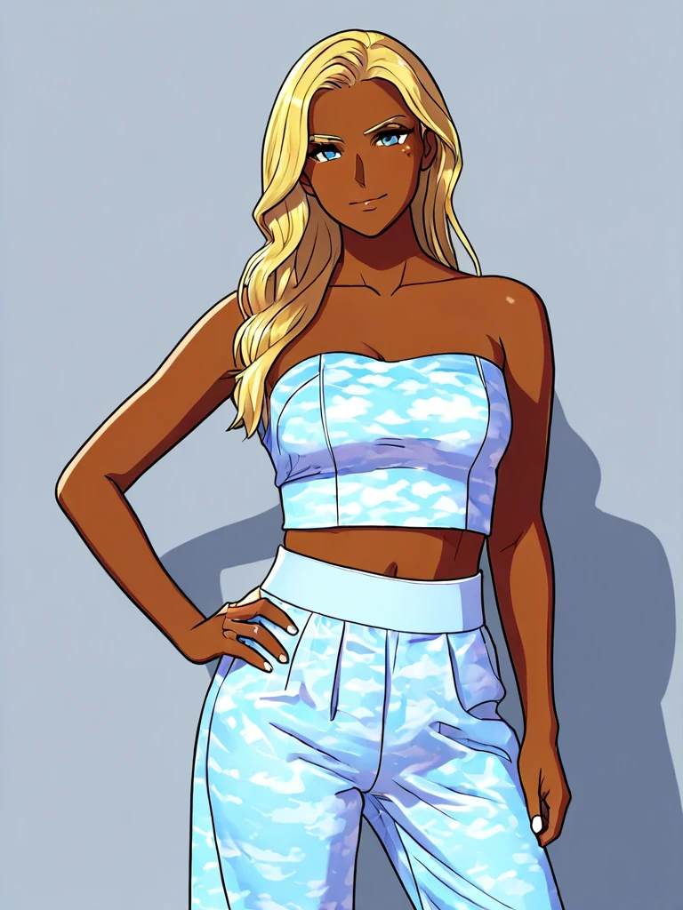 A light blue tube top with matching pants, all with soft cloud accents