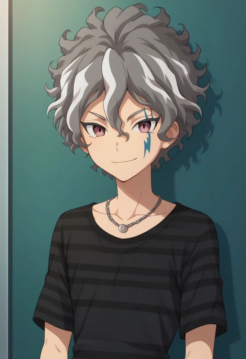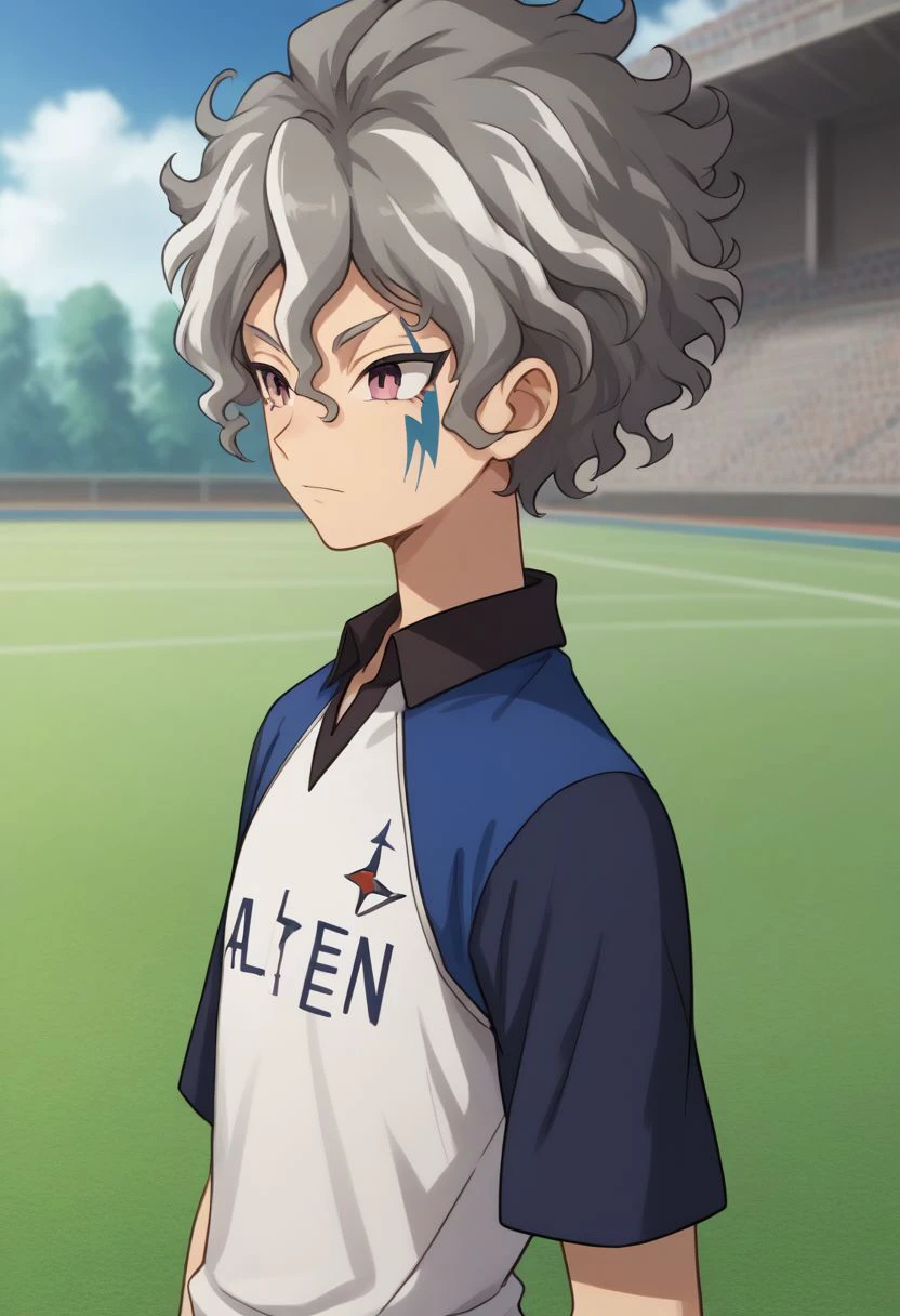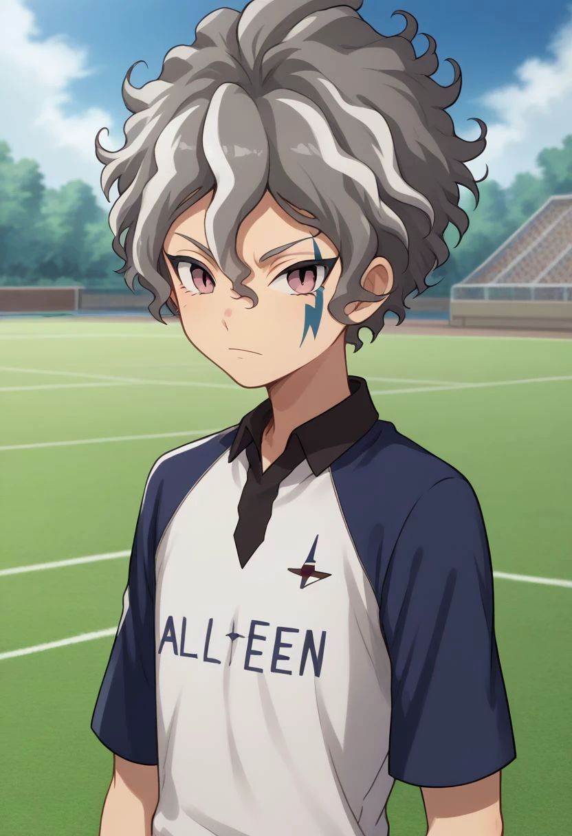 KiraHiroto, 1boy, male focus, solo, pink eyes, grey hair, facial tattoo, alien soccer uniform, multicolored shirt, black and white shirt, short sleeves, bracelet, shorts, black shorts, socks, black socks, shoes, sneakers,