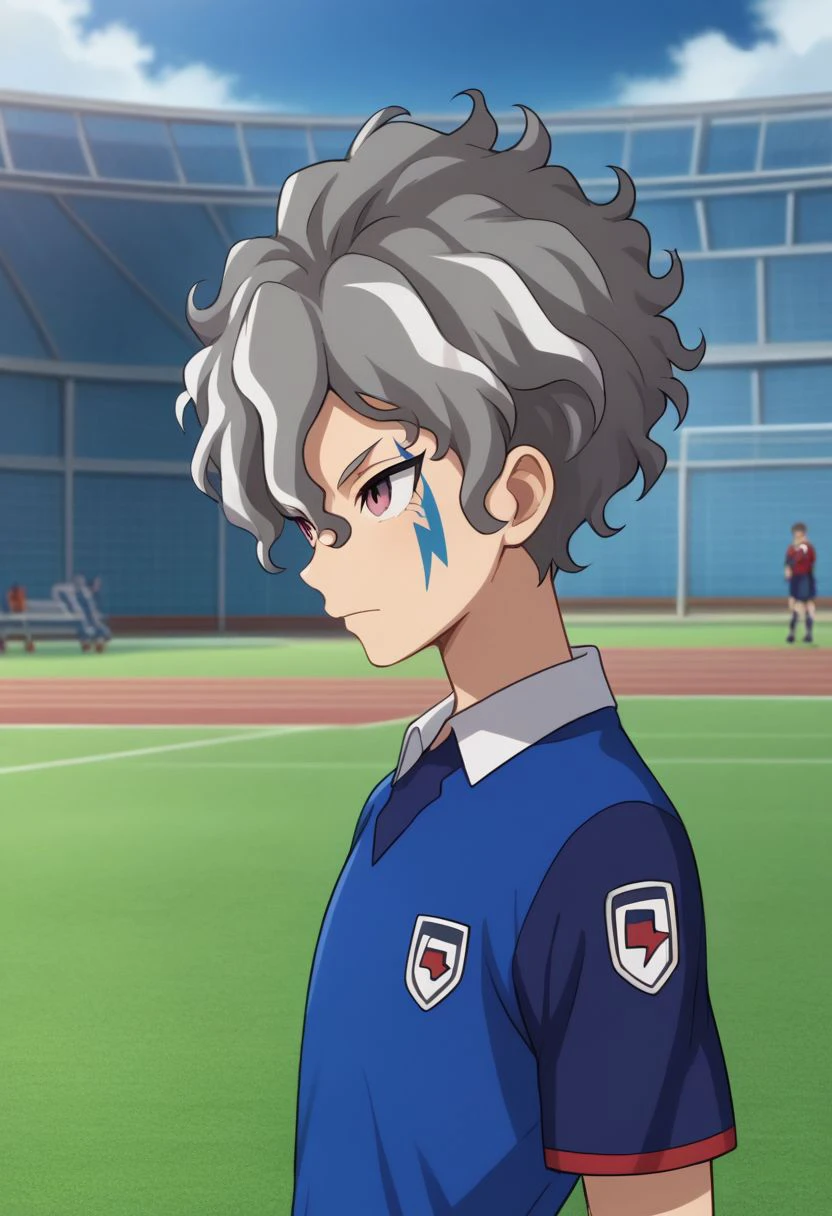 KiraHiroto, 1boy, male focus, solo, pink eyes, grey hair, facial tattoo, orion soccer uniform, shirt, blue shirt, raglan sleeves, short sleeves, shorts, blue shorts, socks, blue socks, shoes, sneakers,