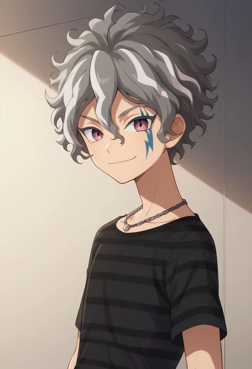 KiraHiroto, 1boy, male focus, solo, pink eyes, grey hair, facial tattoo, necklace, shirt, black shirt, striped shirt, short sleeves, black pants,