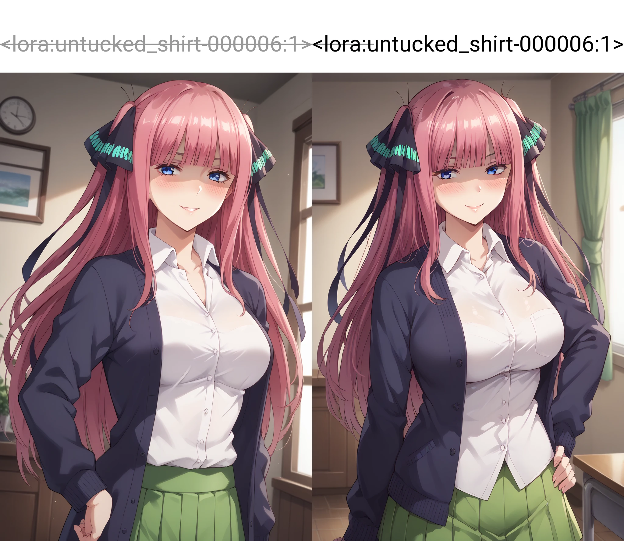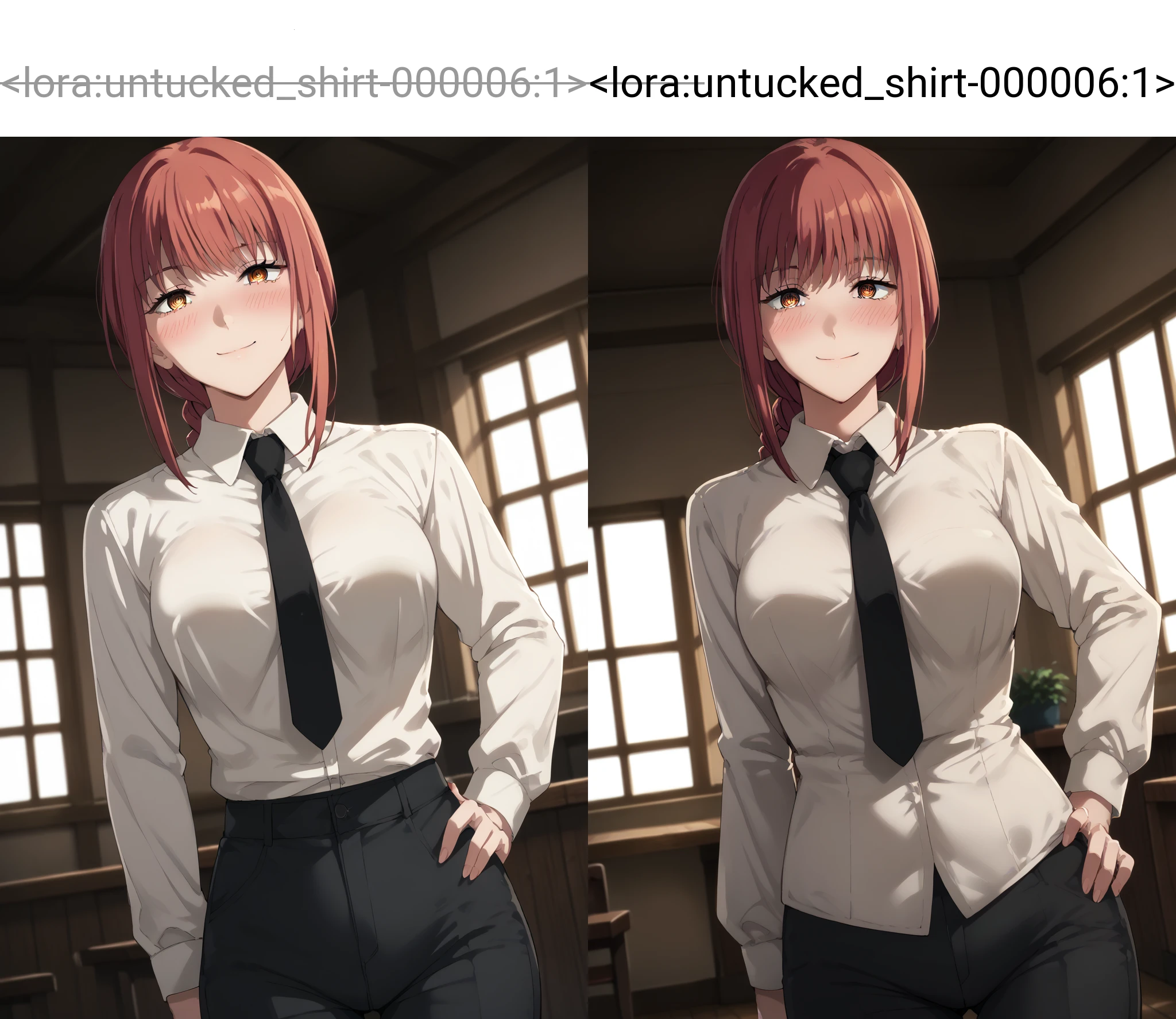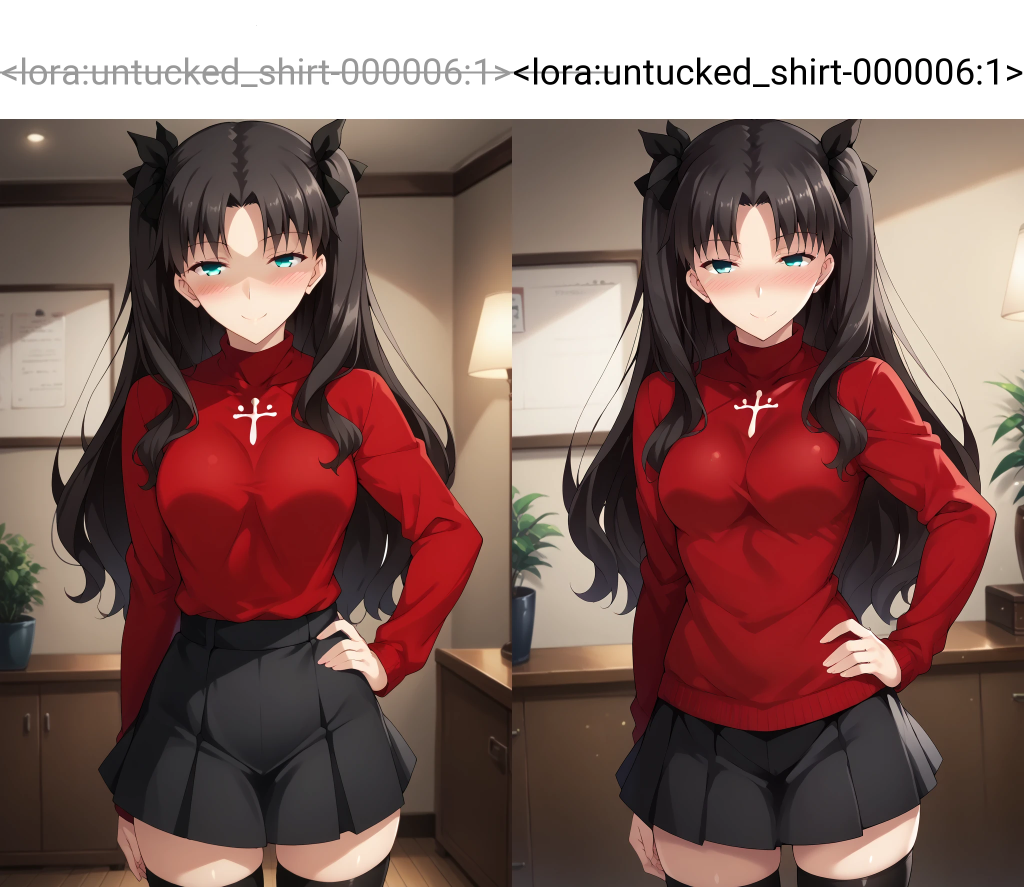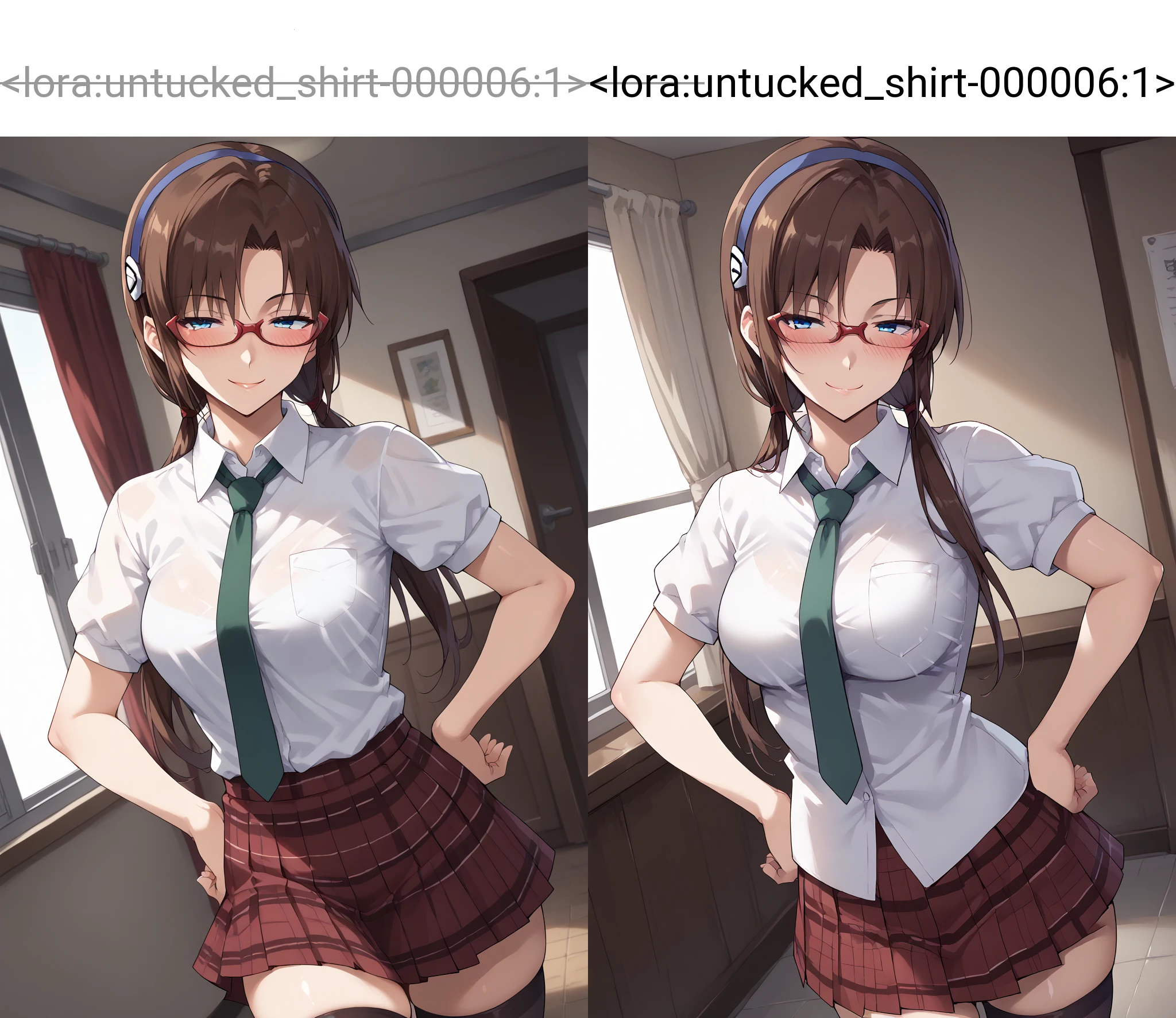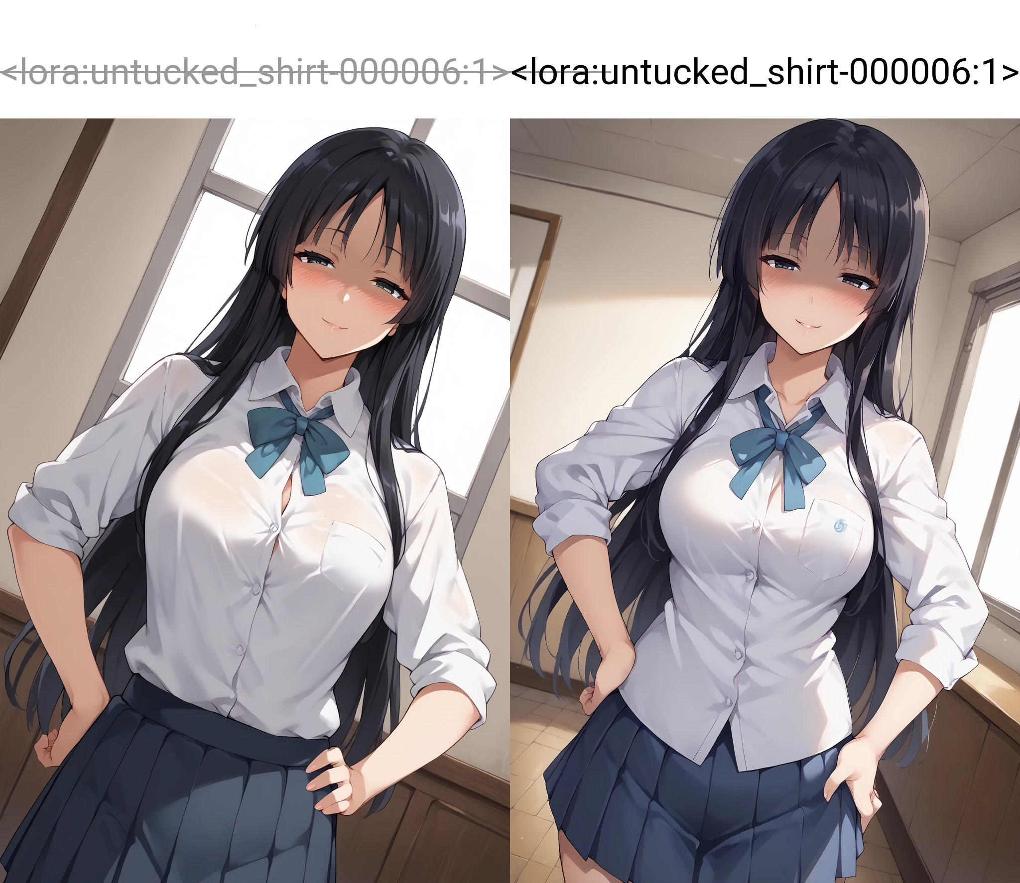 While using Pony XL, I noticed that the Untucked Shirt prompt was not working properly, so I created a Lora for my personal use, and I think it's time to share it.
