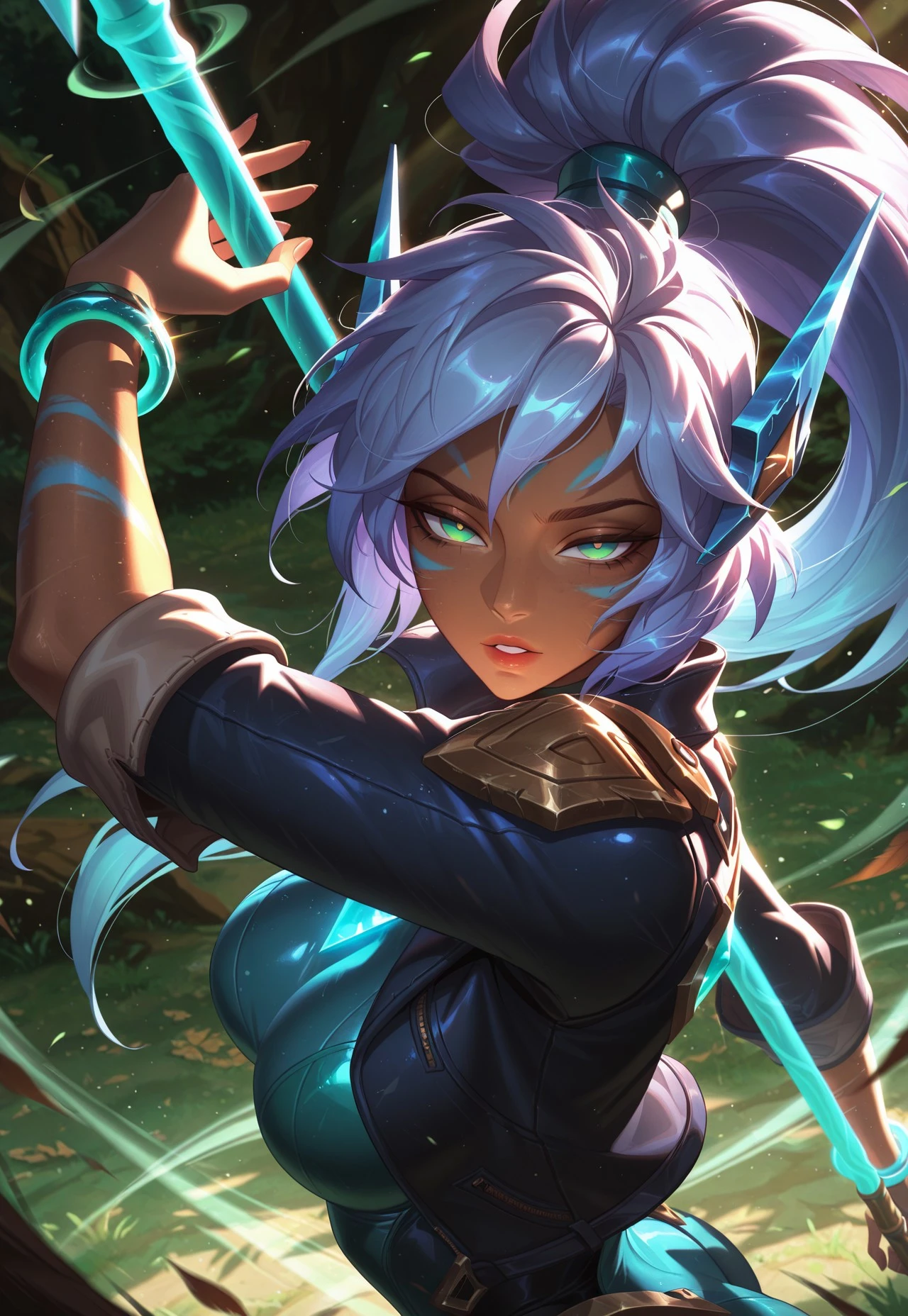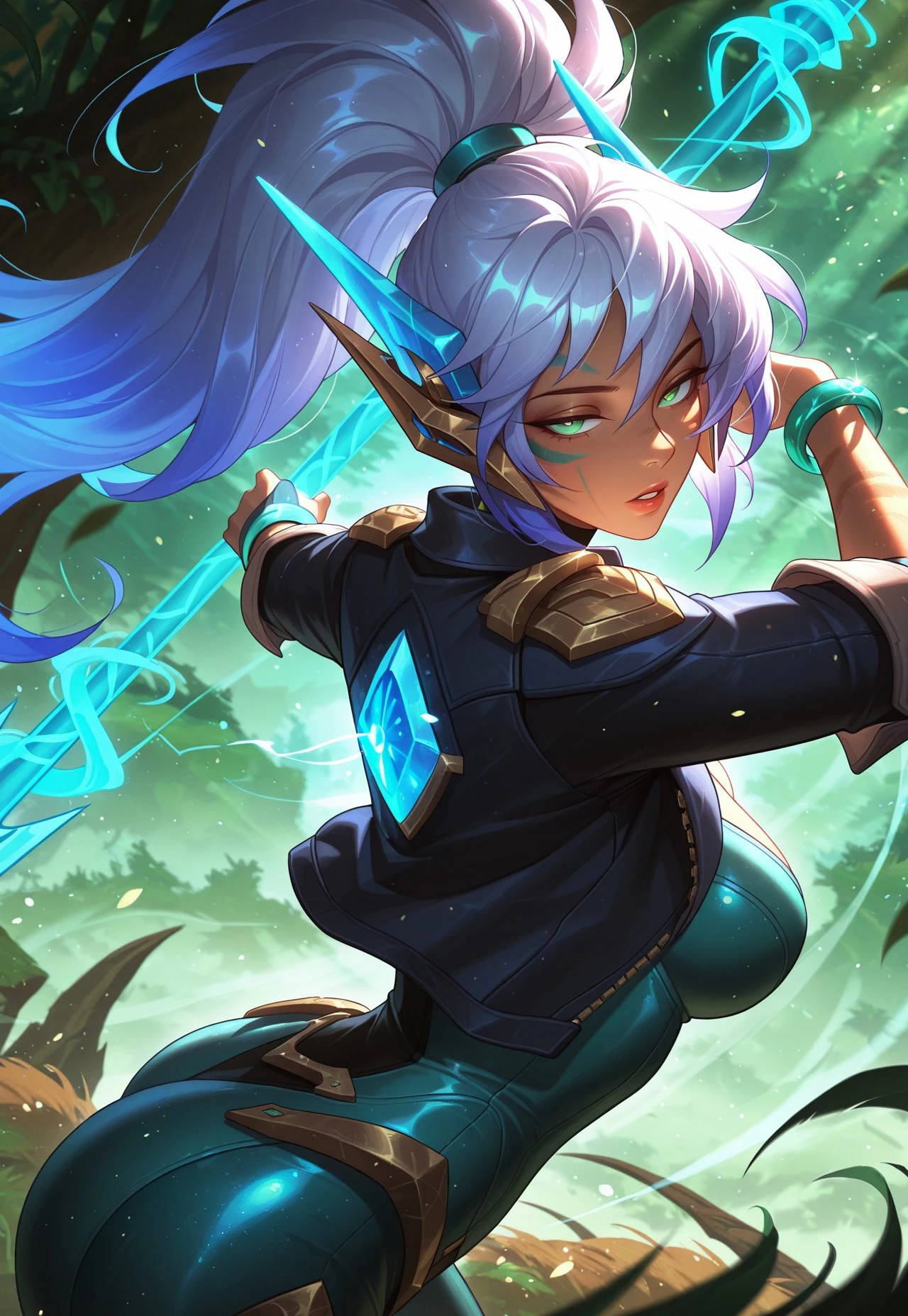SGXnidalee,gradient hair,hair ornament,,open jacket,jacket,ponytail,long hair,face marks,green eyes,bracelet,spear,