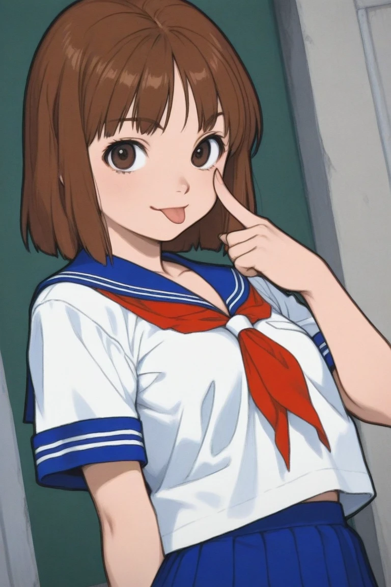 jankengirl,brown hair,brown eyes,school uniform,serafuku,akanbe,tongue out,eyelid pull,:p