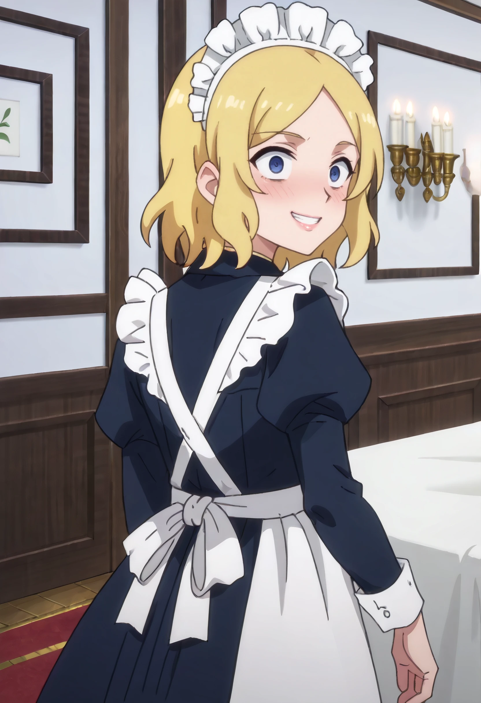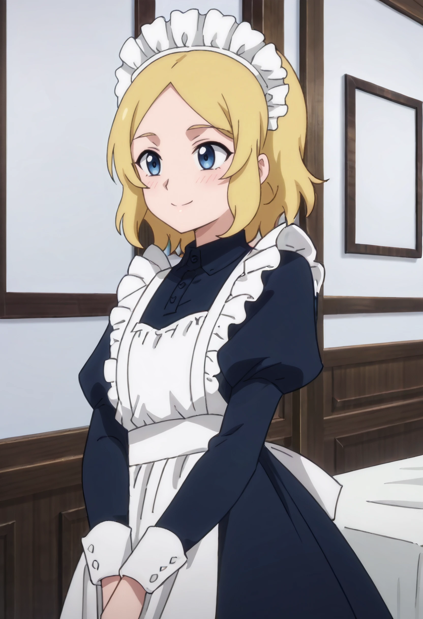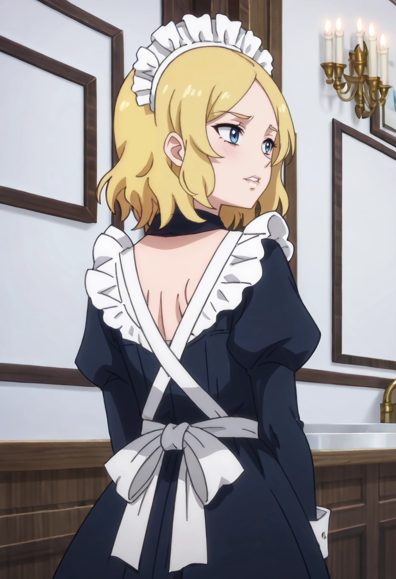 TNSBMaid, blonde hair, short hair, blue eyes, parted bangs,